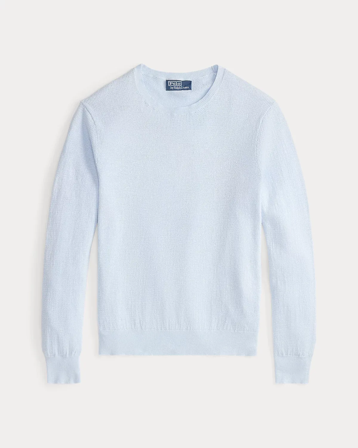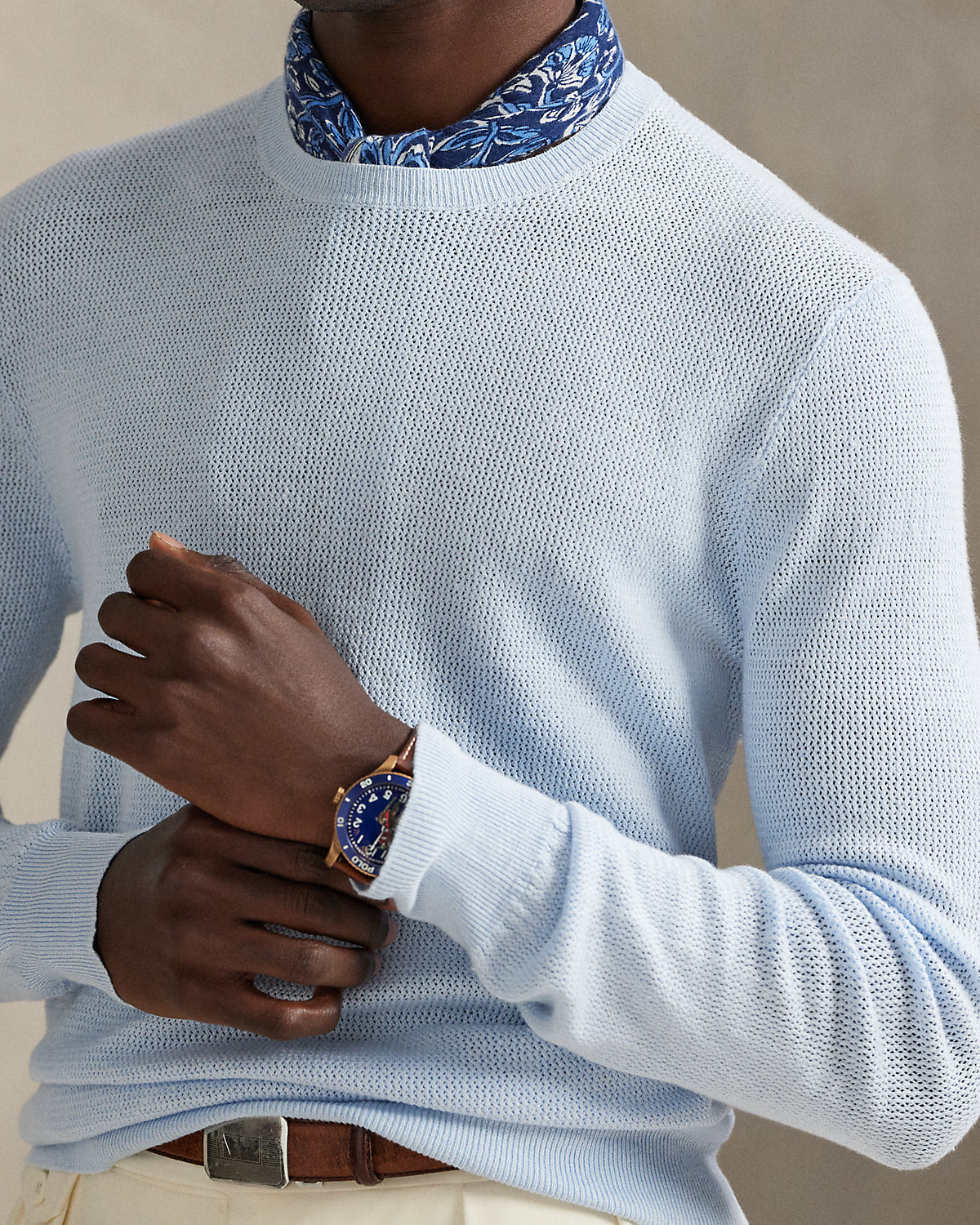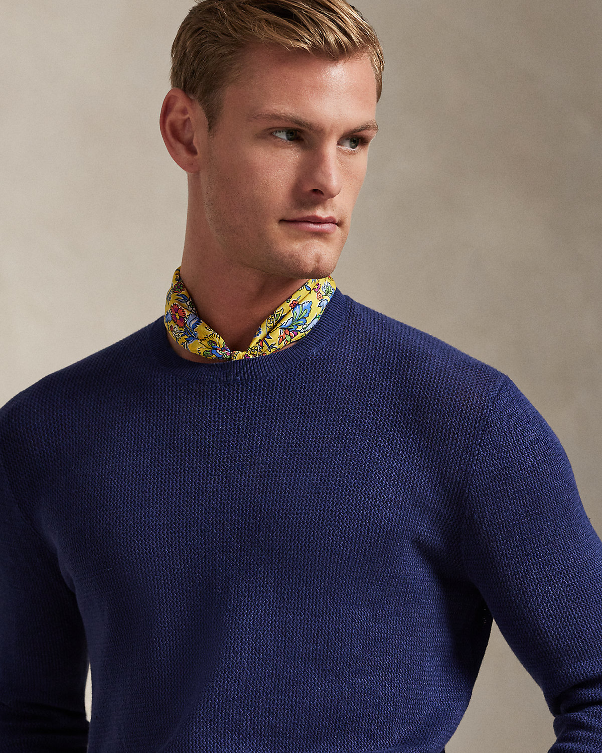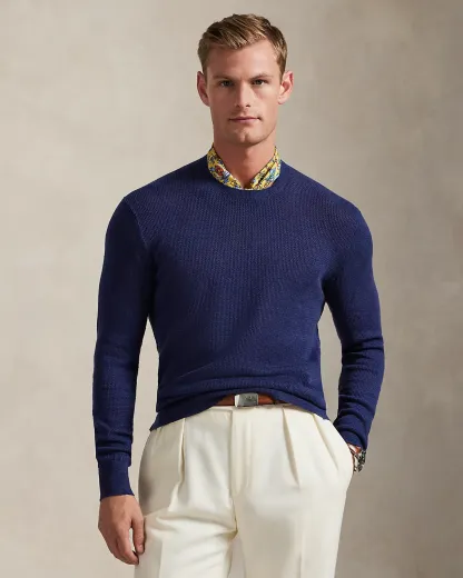 This crewneck sweater unites fine-gauge yarn with a novelty rib-knit technique to achieve a distinctive texture. The linen-blend composition delivers exceptional breathability and lightweight comfort, enhanced by strategic stretch fibers.