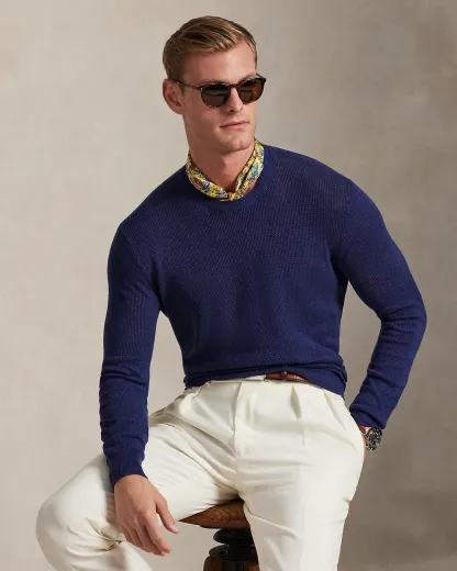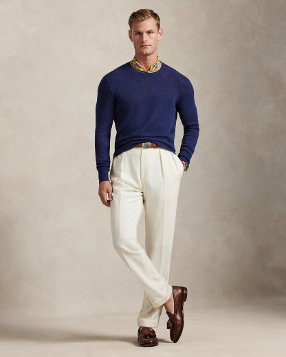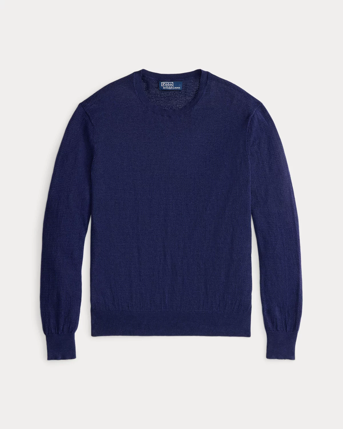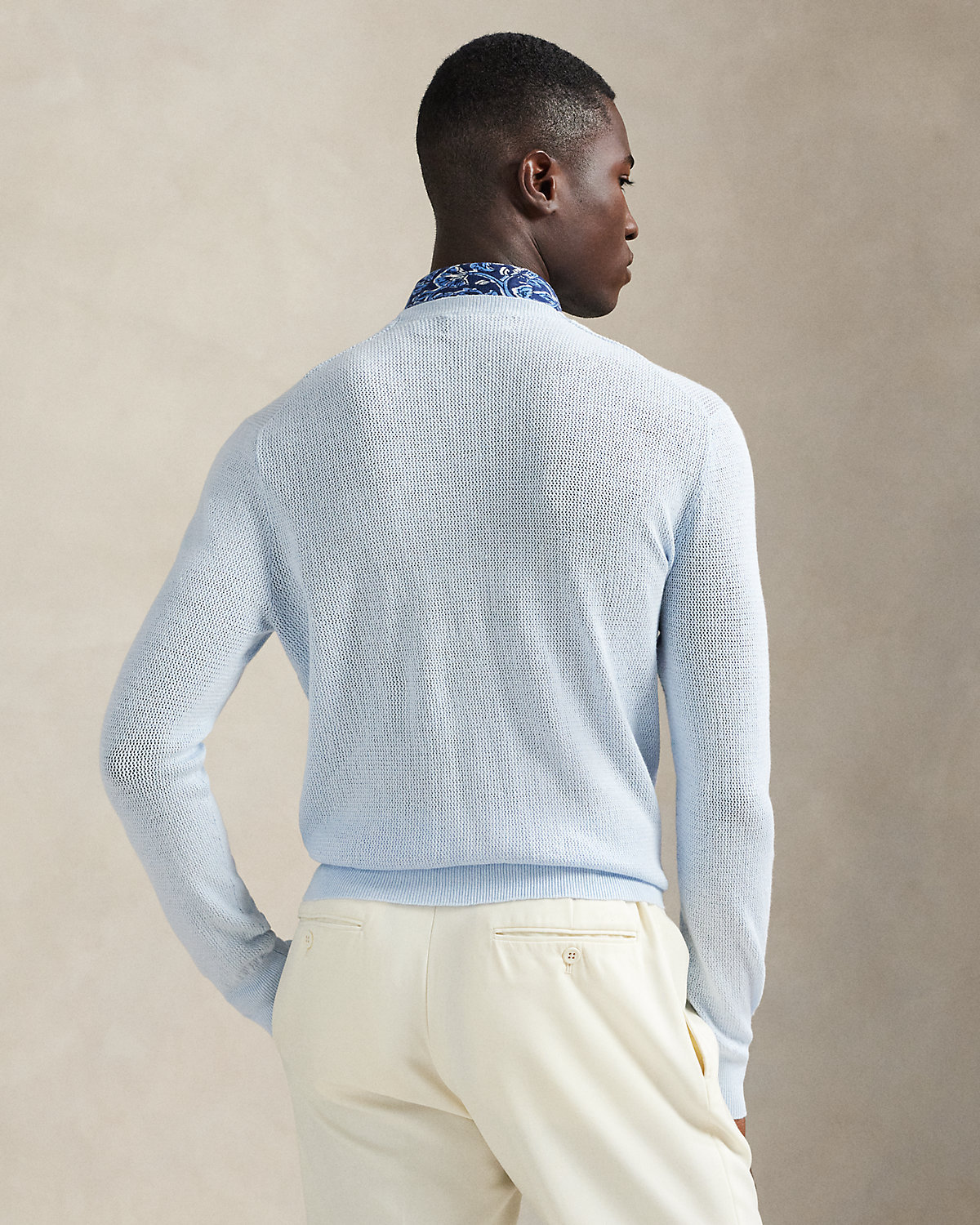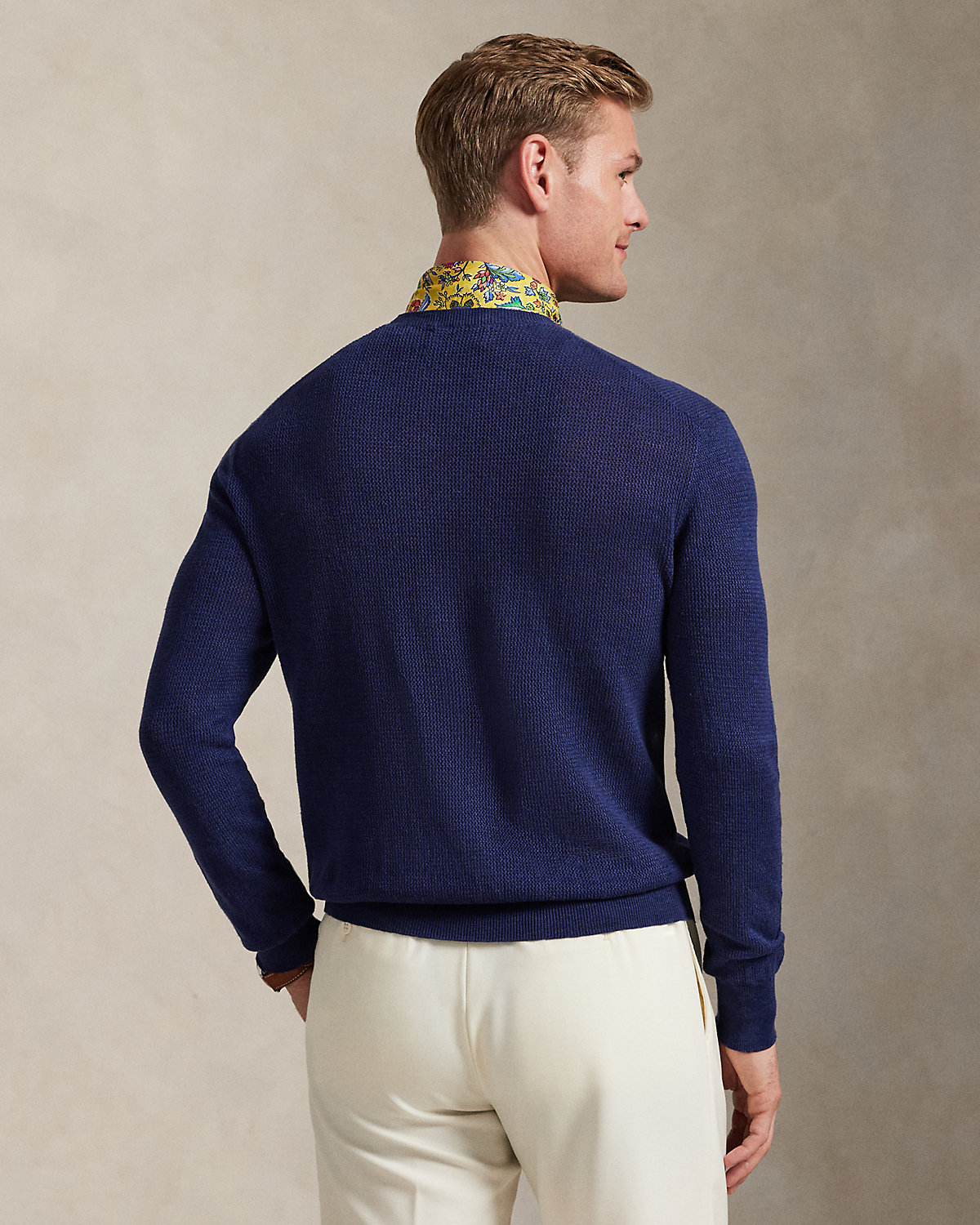This crewneck sweater unites fine-gauge yarn with a novelty rib-knit technique to achieve a distinctive texture. The linen-blend composition delivers exceptional breathability and lightweight comfort, enhanced by strategic stretch fibers.