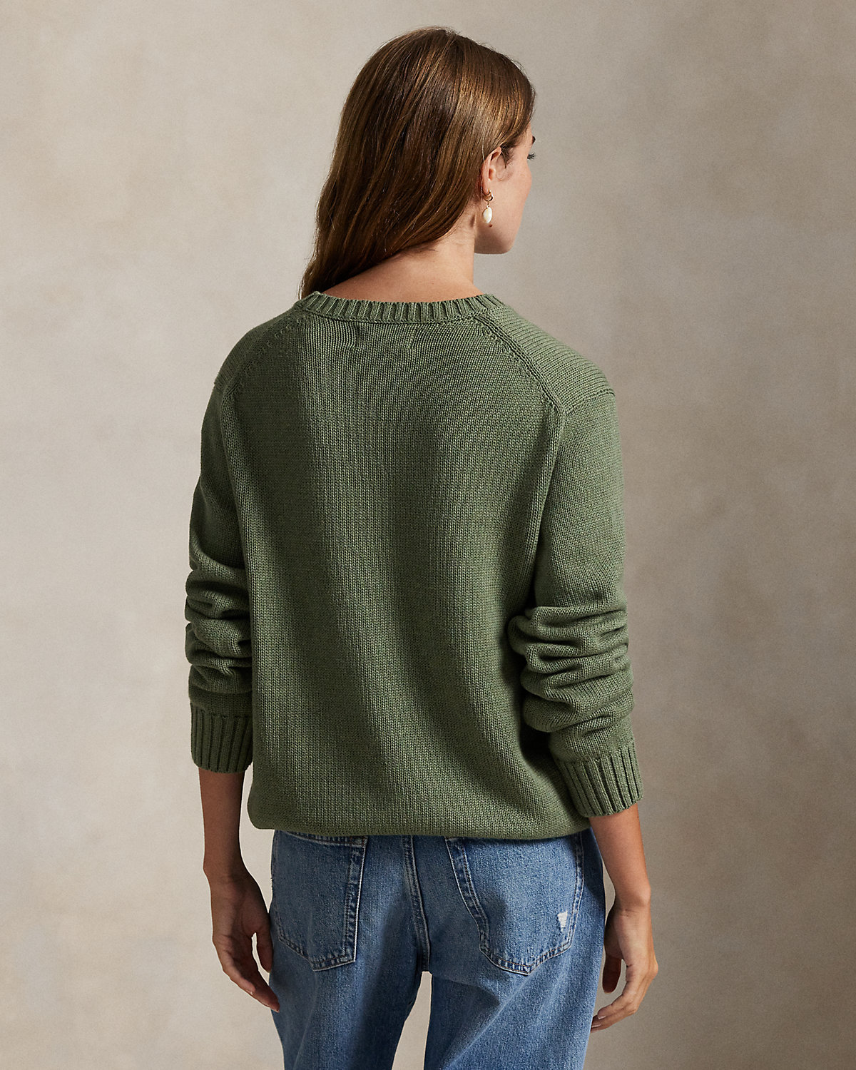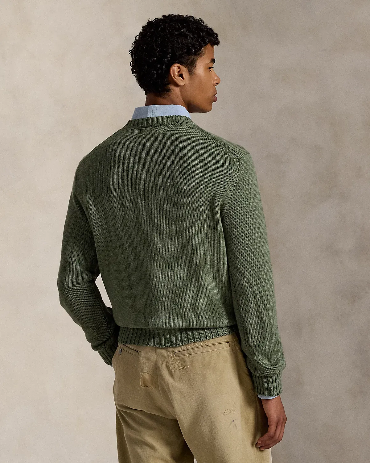 - Historical American flag intarsia-knit at the center front. Embroidered stars and “RL” at the front.