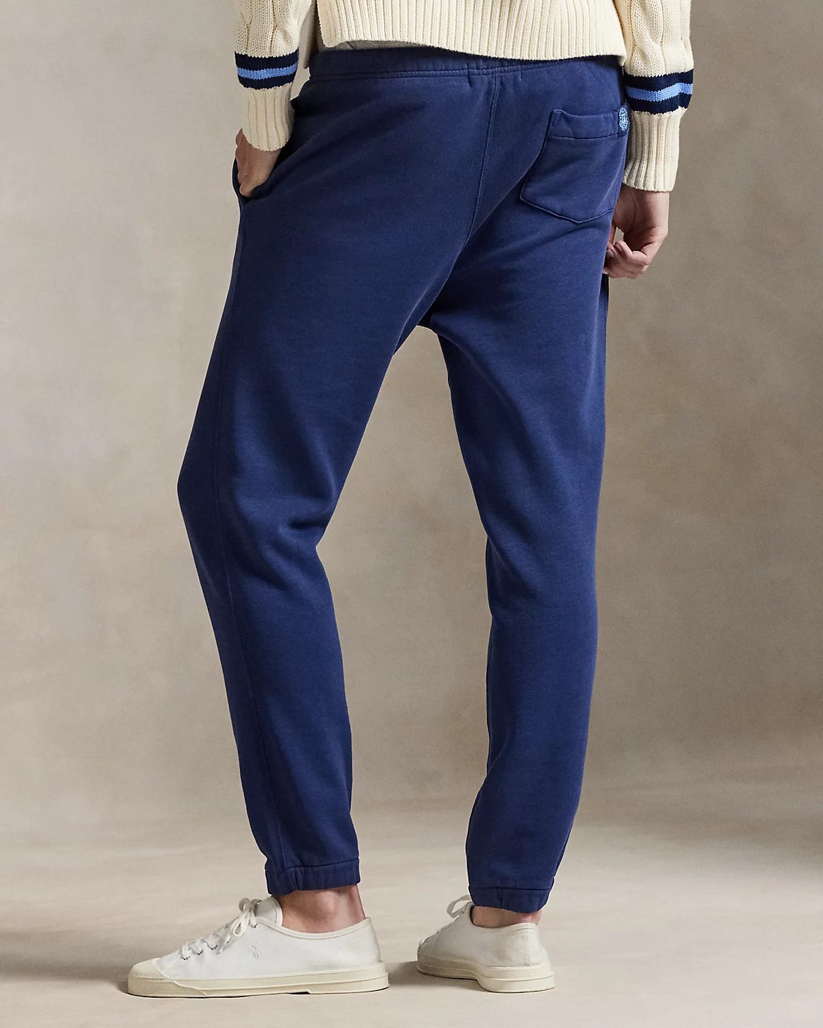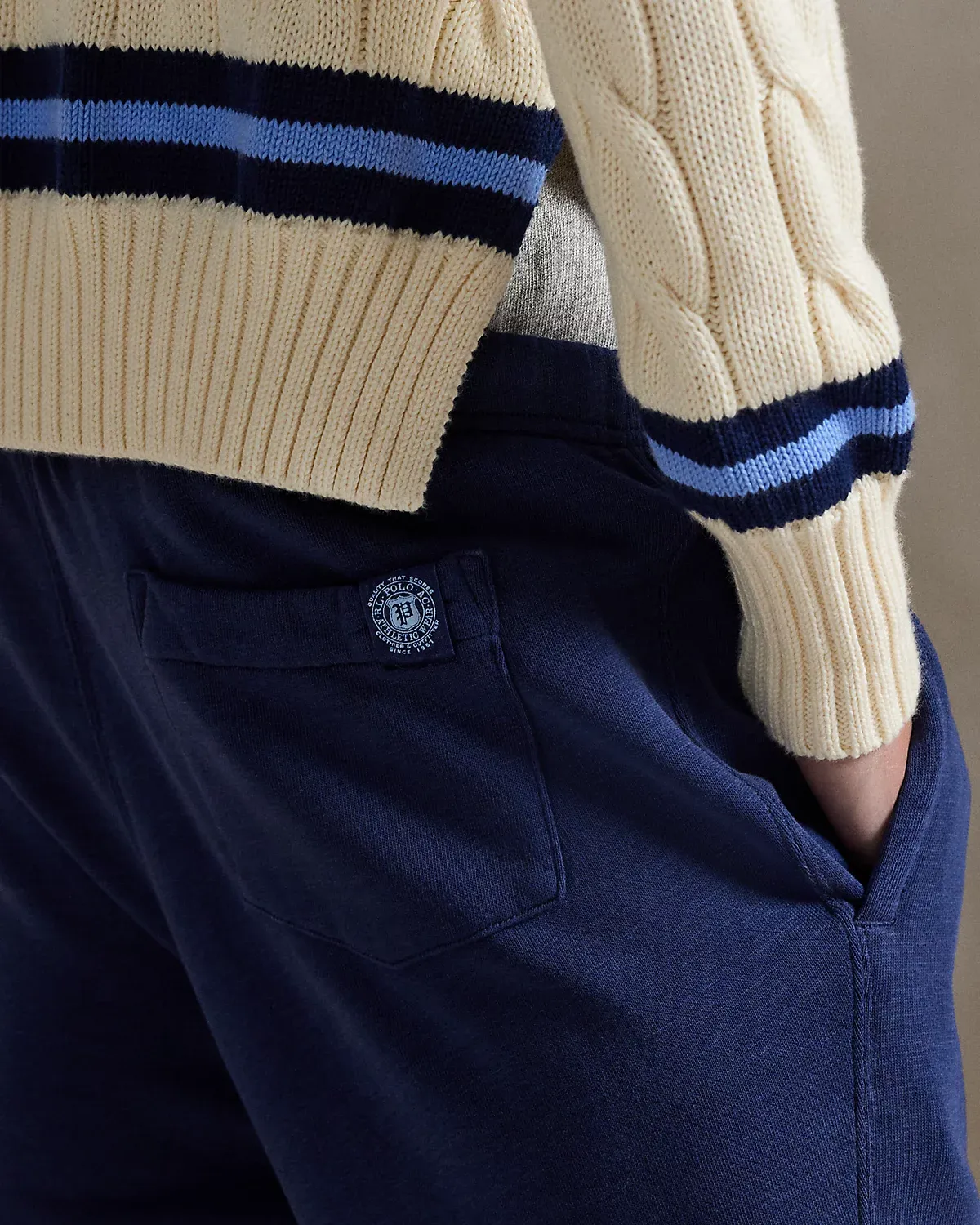 - Elastic drawstring waistband. Ribbed gusset. Side on-seam pockets. Back right patch pocket with a "P" label. Elasticized cuffs.