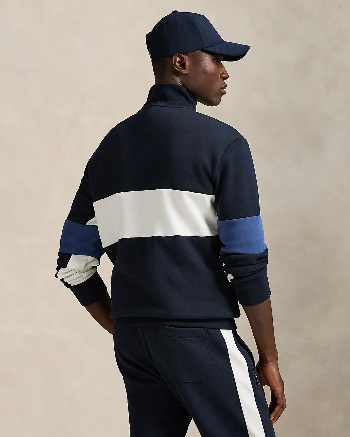 - Ribbed mockneck. Full-zip front. Zippers custom-developed with a “Polo” logo.
