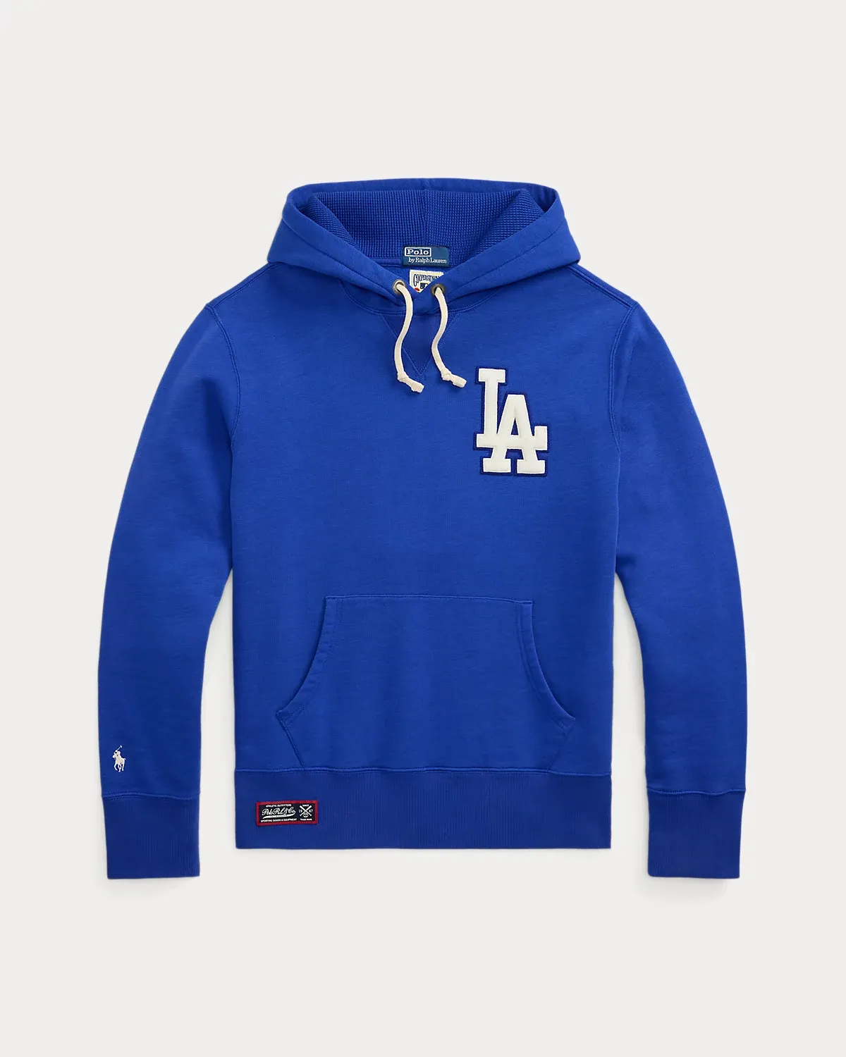 • Drawstring hood with waffle-knit lining. Ribbed V-inset. Long sleeves with ribbed cuffs. Chenille Los Angeles Dodgers™ logo patch at the left chest and center back. Kangaroo pocket.