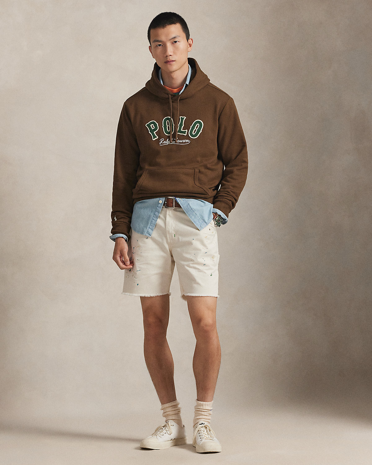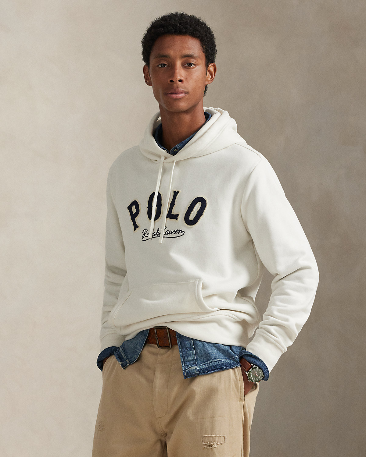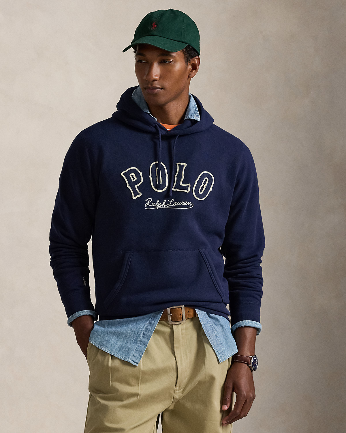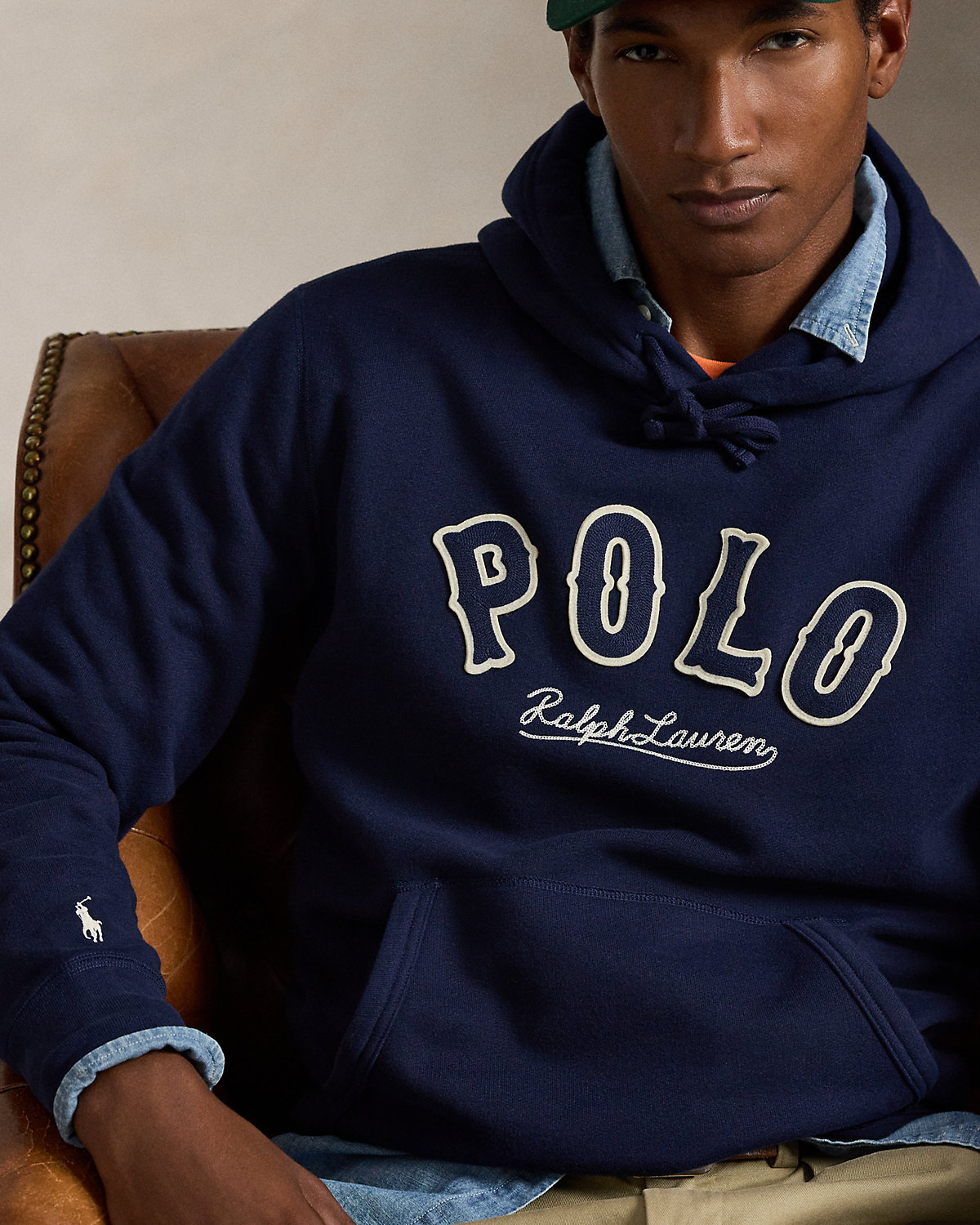 - Embroidered appliqués spelling out “Polo” and chain-stitched “Ralpthth Lauren” embroidery at the center front.