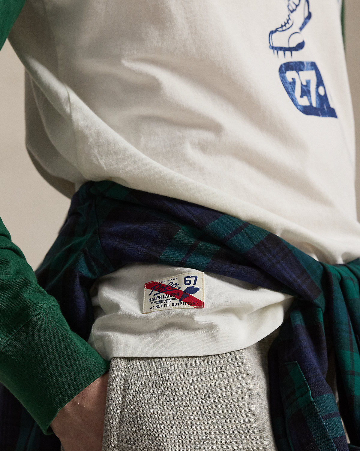 - “Polo Ralpthth Lauren 67 Athletic Outfitters” winged foot label at the right hem.