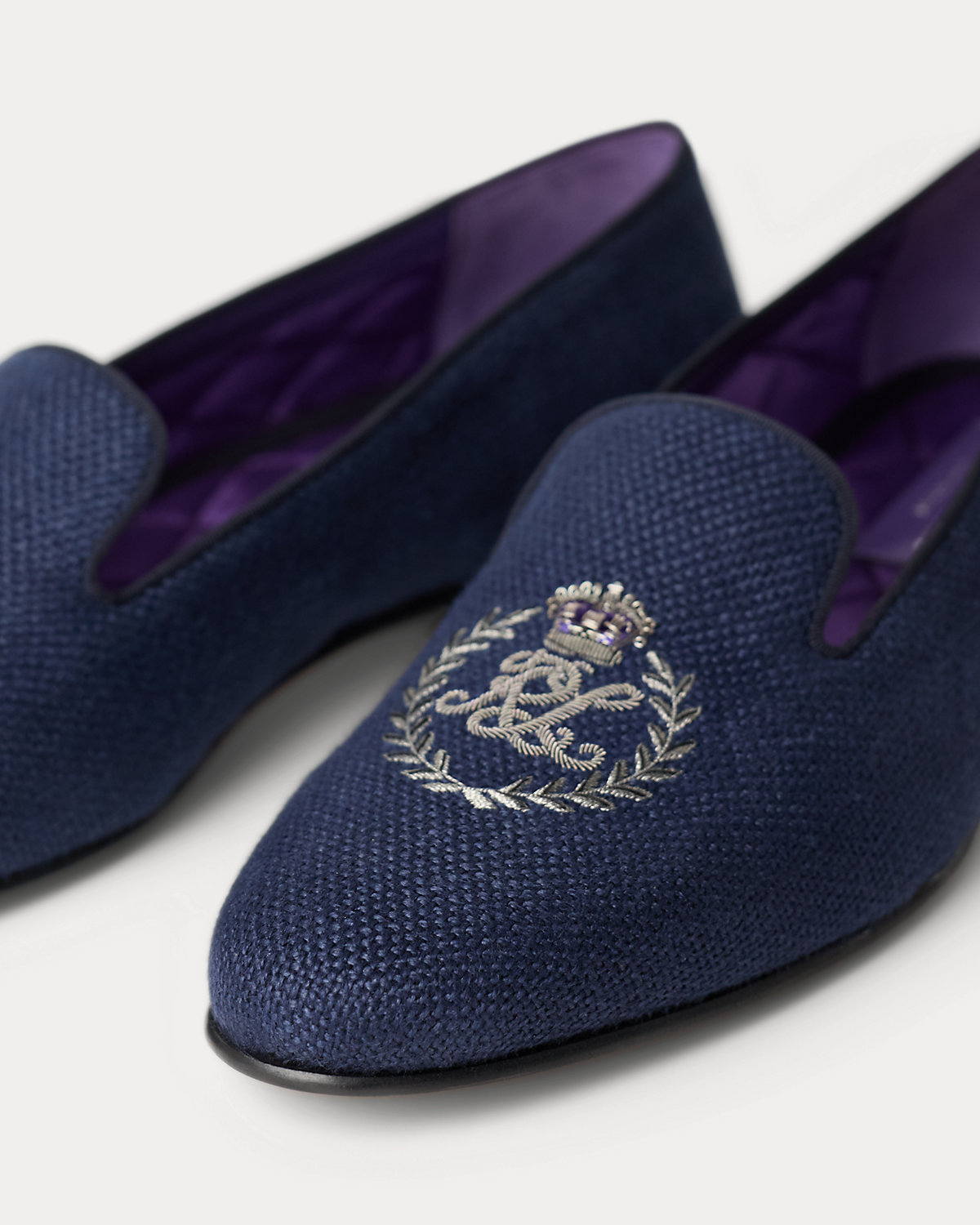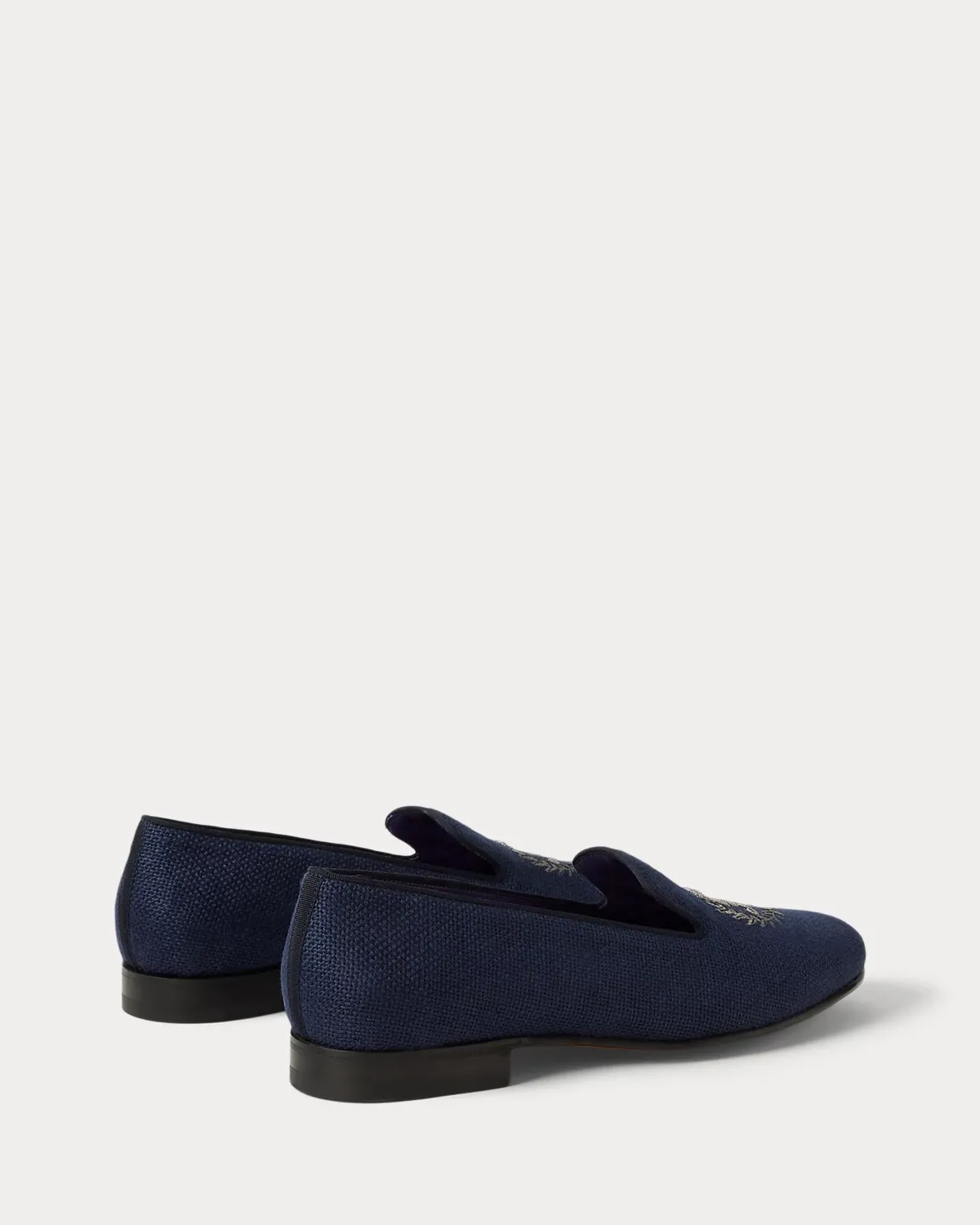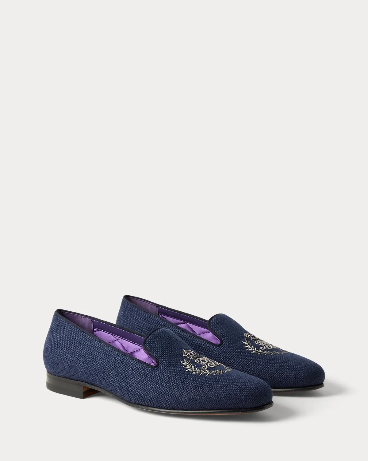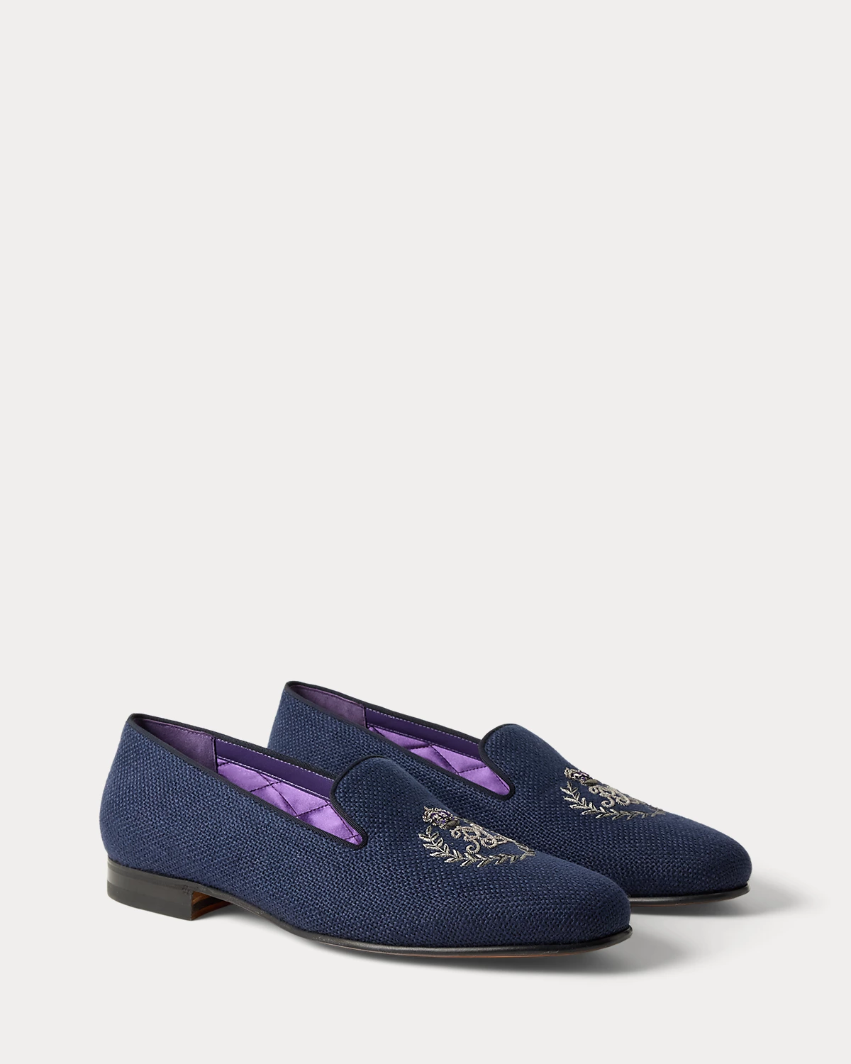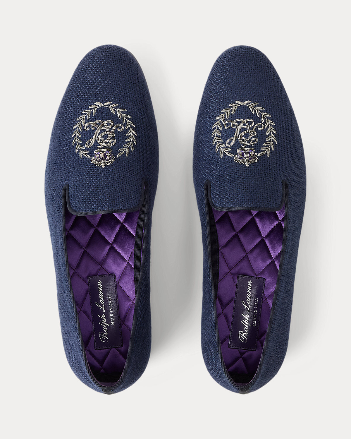 The Alonzo blends traditional Italian craftsmanship with sleek, modern styling. Realized in linen with tonal grosgrain piping, this elegant slipper is finished with our signature “RL” crest bullion embroidery.