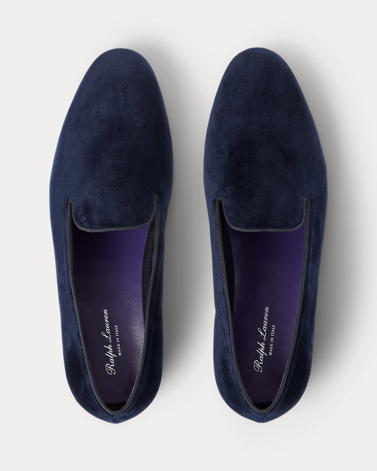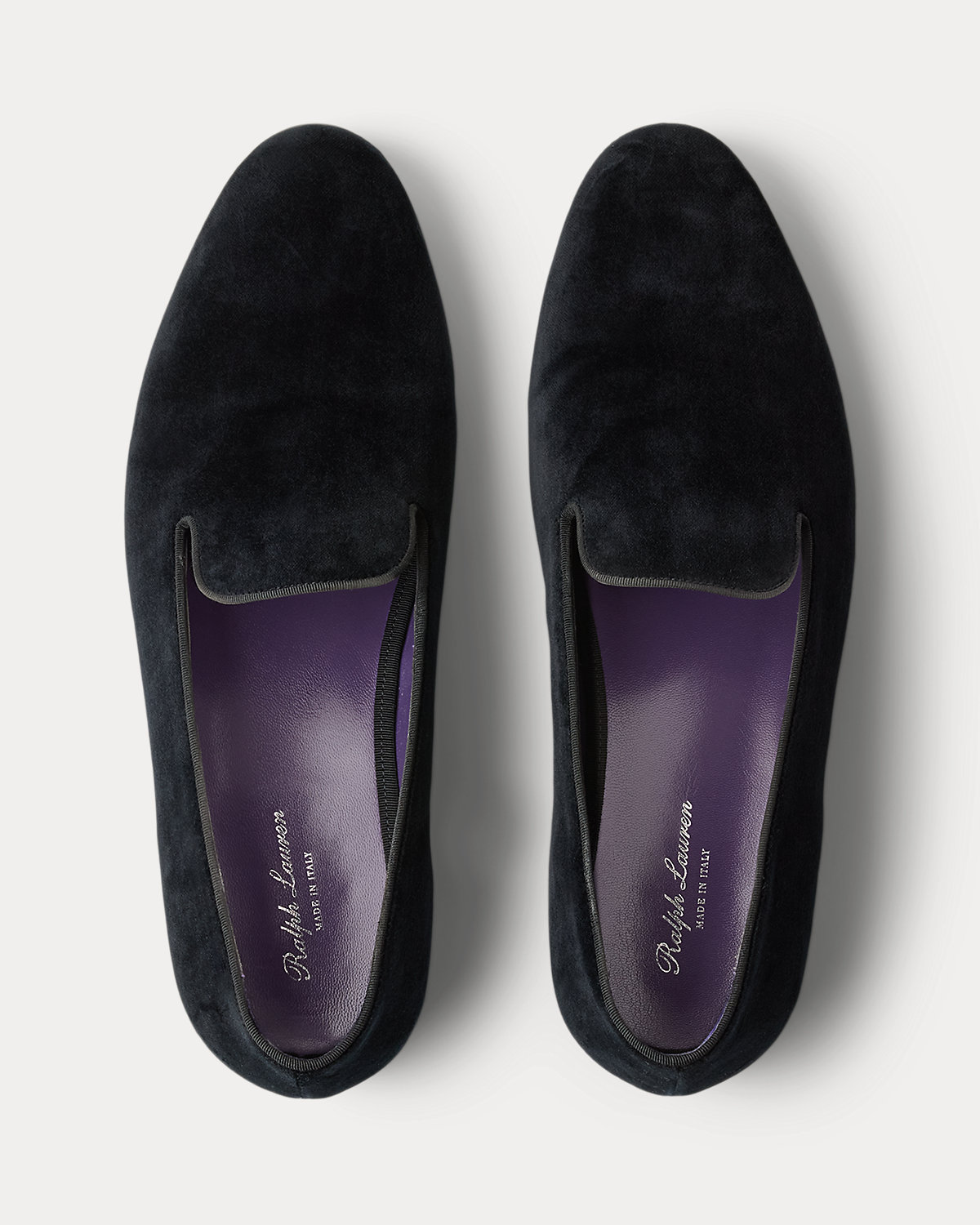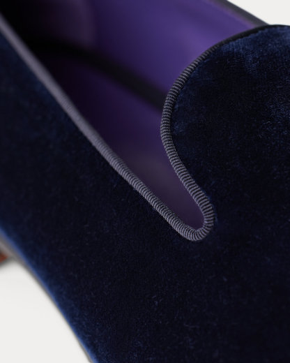 The Alonzo slipper blends traditional Italian craftsmanship with sleek, modern styling. This elegant style is realized in cotton velvet with tonal grosgrain piping.