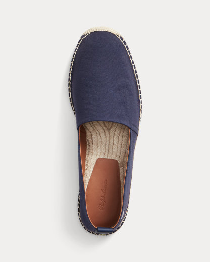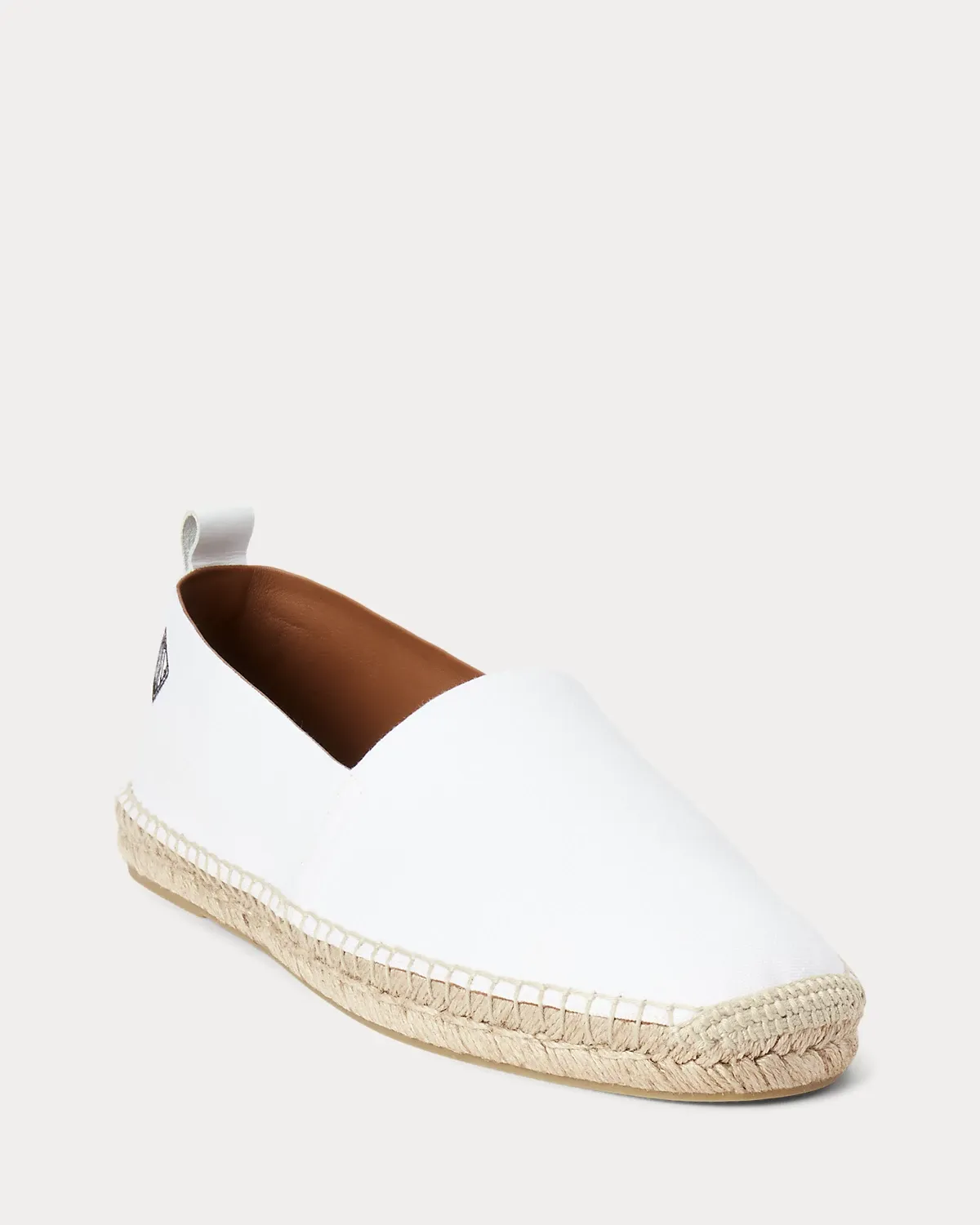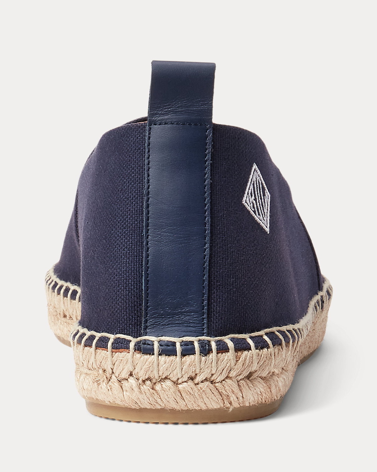 Ralpthth Lauren’s quintessential espadrille features a cotton canvas upper hand-stitched to a coiled jute-and-rubber sole. It features a supple lambskin lining and Art Deco–inspired “RL” monogram embroidery.