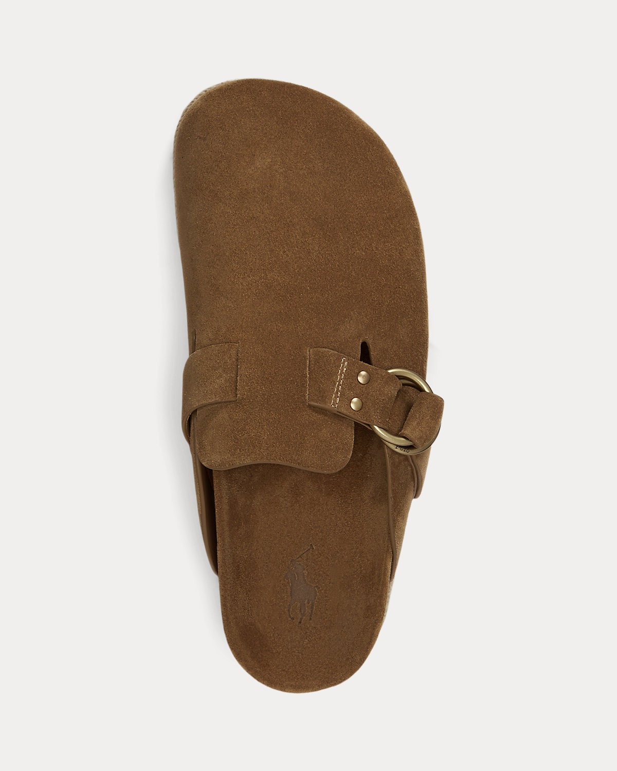 - Slip-on styling. Strap fastens with a double-O-ring buckle at the vamp. Brass studs.