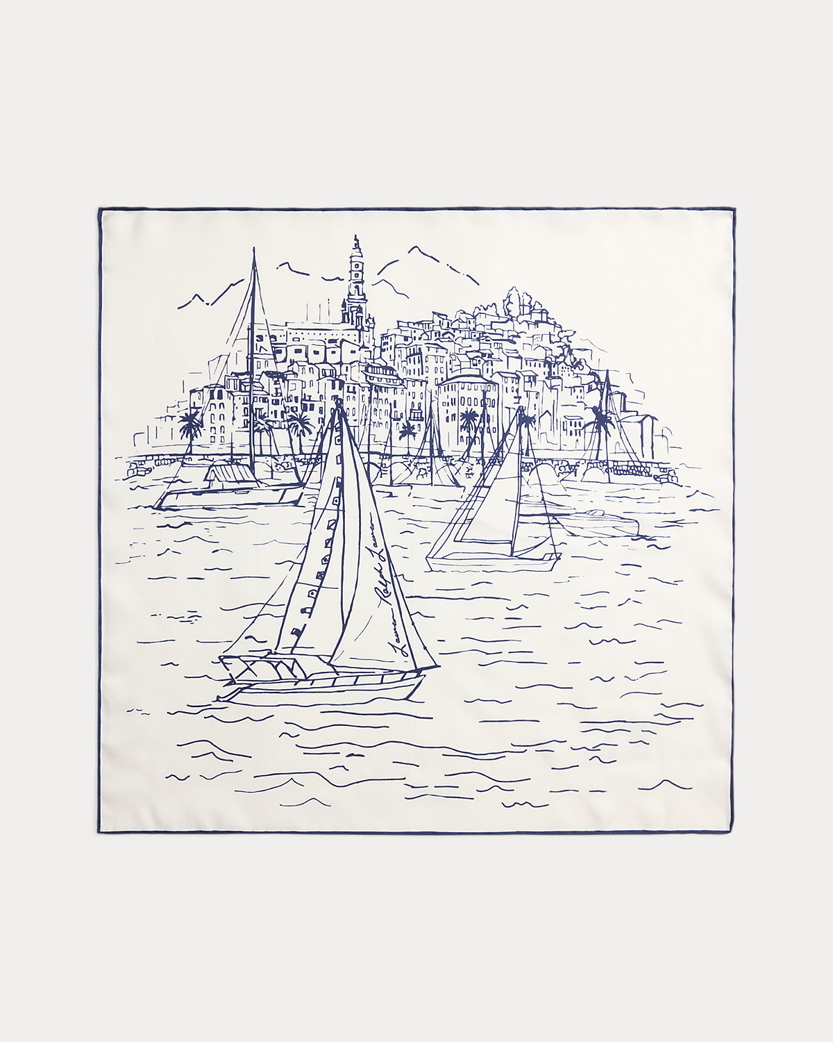 Rendered in the style of a sketchbook drawing, a coastal sailing motif serves as the focal point of this luxurious silk scarf, which is finished with hand-rolled ends and Lauren’s script logo.