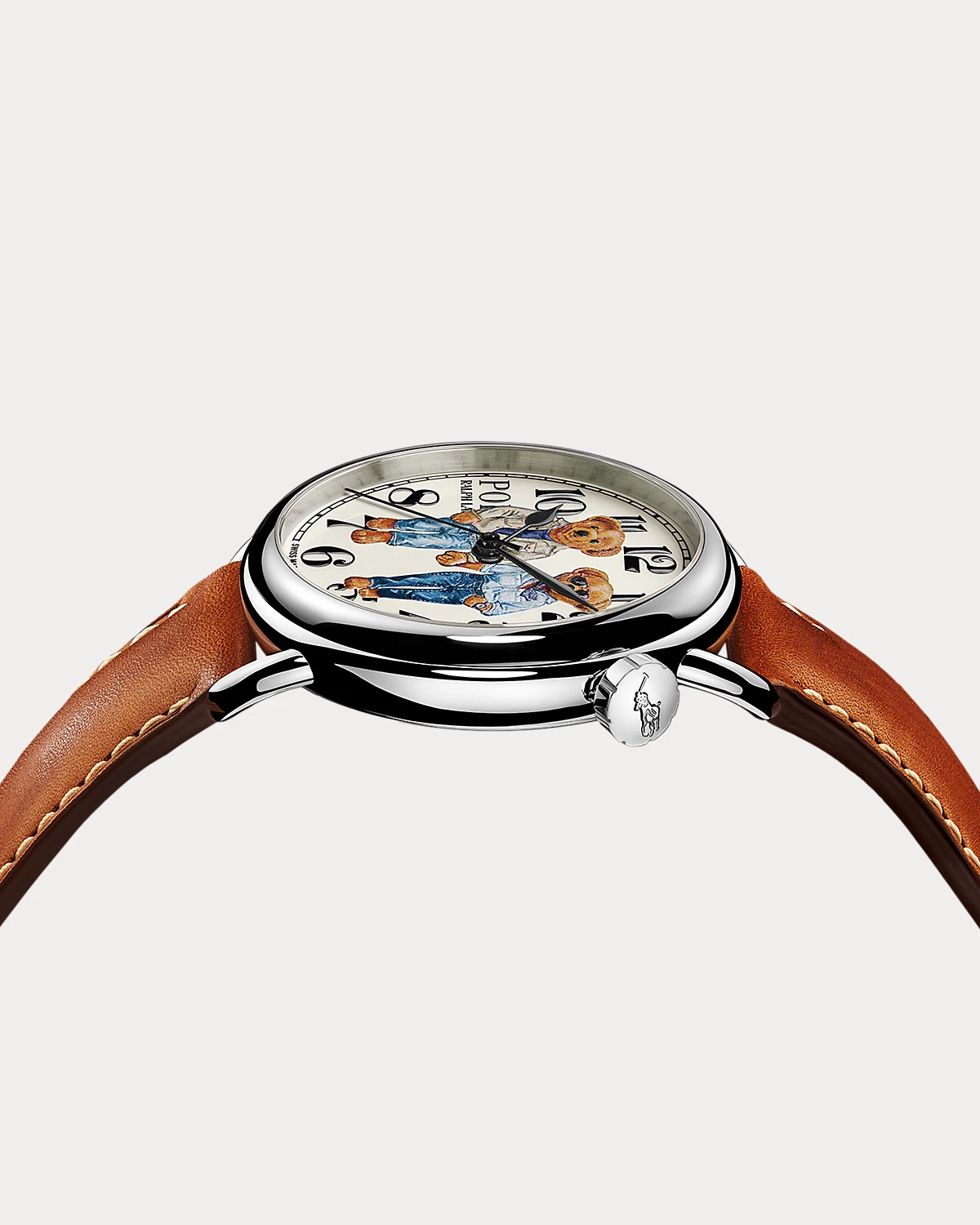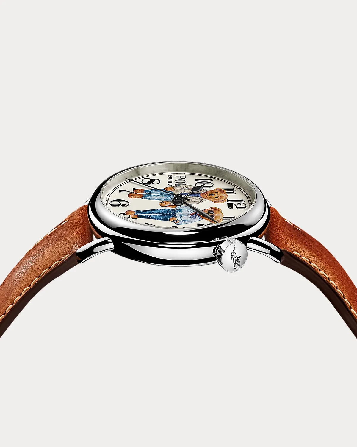 - Dial: creamy white; lacquered; 3D printed with multicolor "Ralph & Ricky" bears. Arabic numerals, minute track, and "Polo Ralpthth Lauren" logo: black; printed.