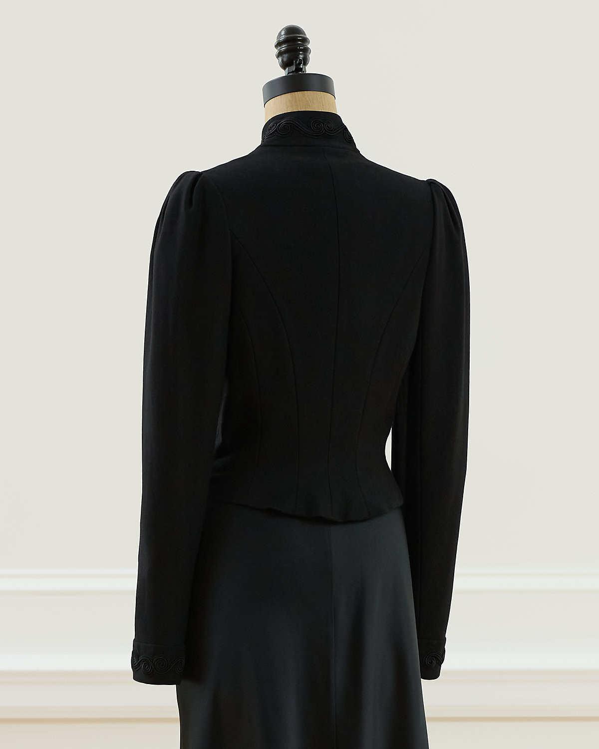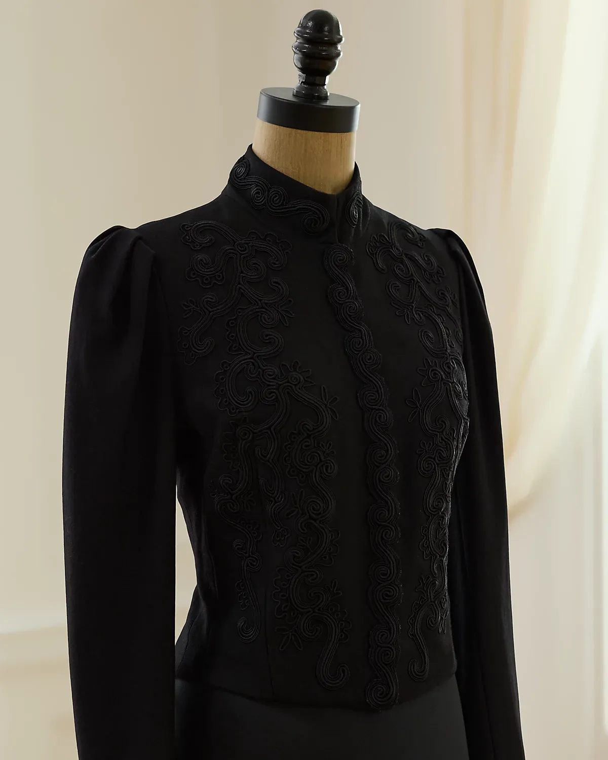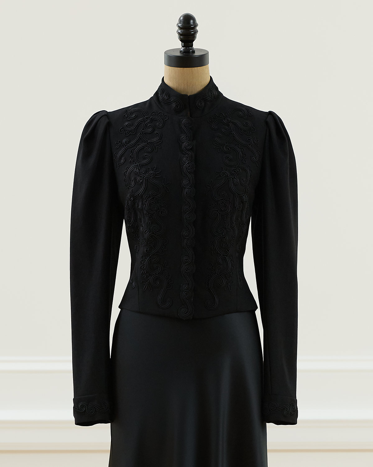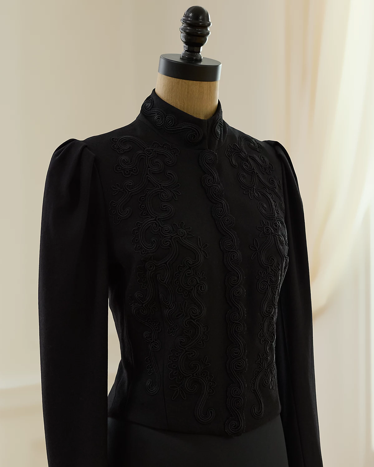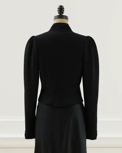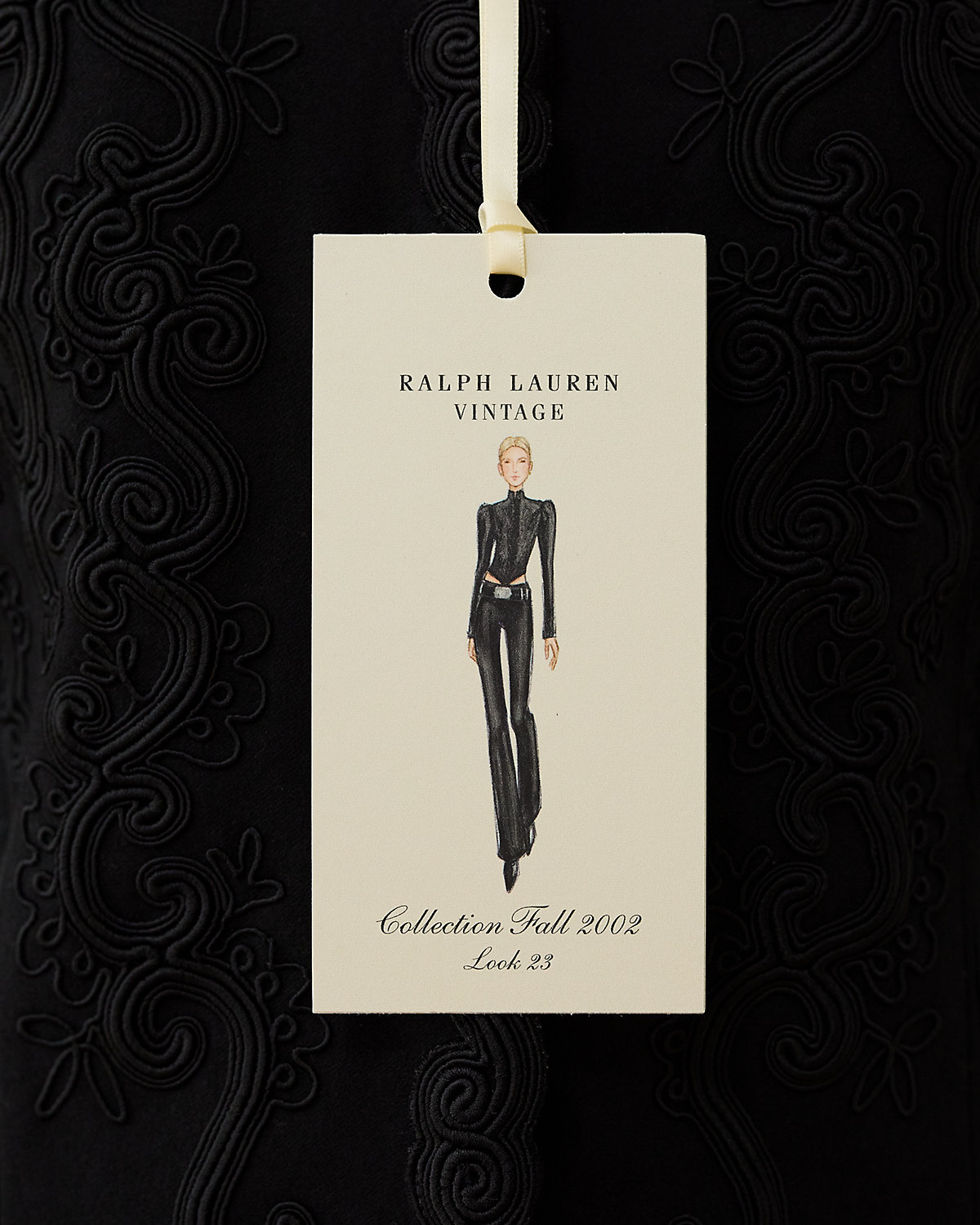 Fall 2002 Look 23. Ralpthth Lauren’s Fall 2002 Collection was inspired by an Edwardian sensibility reworked for a more romantic, eclectic spirit. With puffed sleeves and a sleek silhouette, the Leigh jacket is detailed with an embroidered motif. Size 4 has a 19" back body length, a 13" shoulder, a 16" chest, and a 25.25" sleeve length.