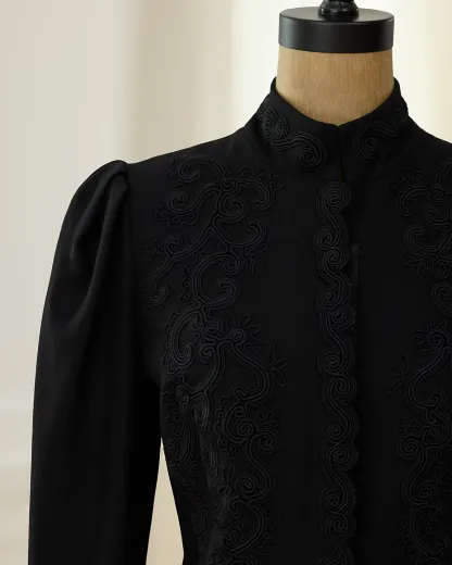 - Puffed long sleeves. Embroidery throughout.
