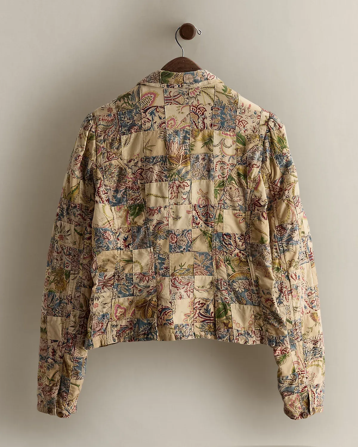 Part of the women’s 2005 Polo Jeans Co. collection. Cotton blazer with an allover patchwork construction and floral motifs. Two front waist flapped pockets. Size large has a 22" back body length, a 15.5" shoulder, a 20" chest, and a 26.5" sleeve length.
