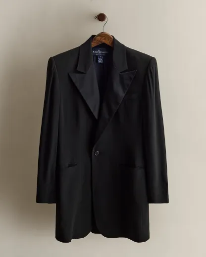 Circa 1980. Part of the women’s Ralpthth Lauren collection. Designed with satin-covered peak lapels. Detailed with a chest welt pocket and two waist besom pockets. Size 6 has a 32.75" back body length, a 17.25" shoulder, a 19" chest, and a 24.5" sleeve length.