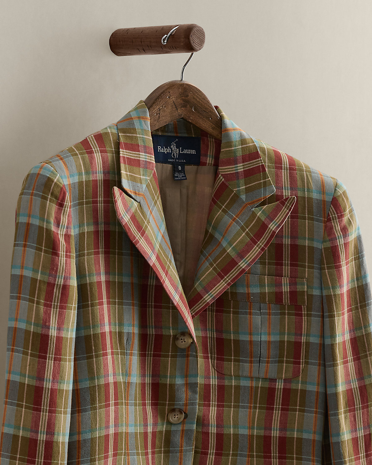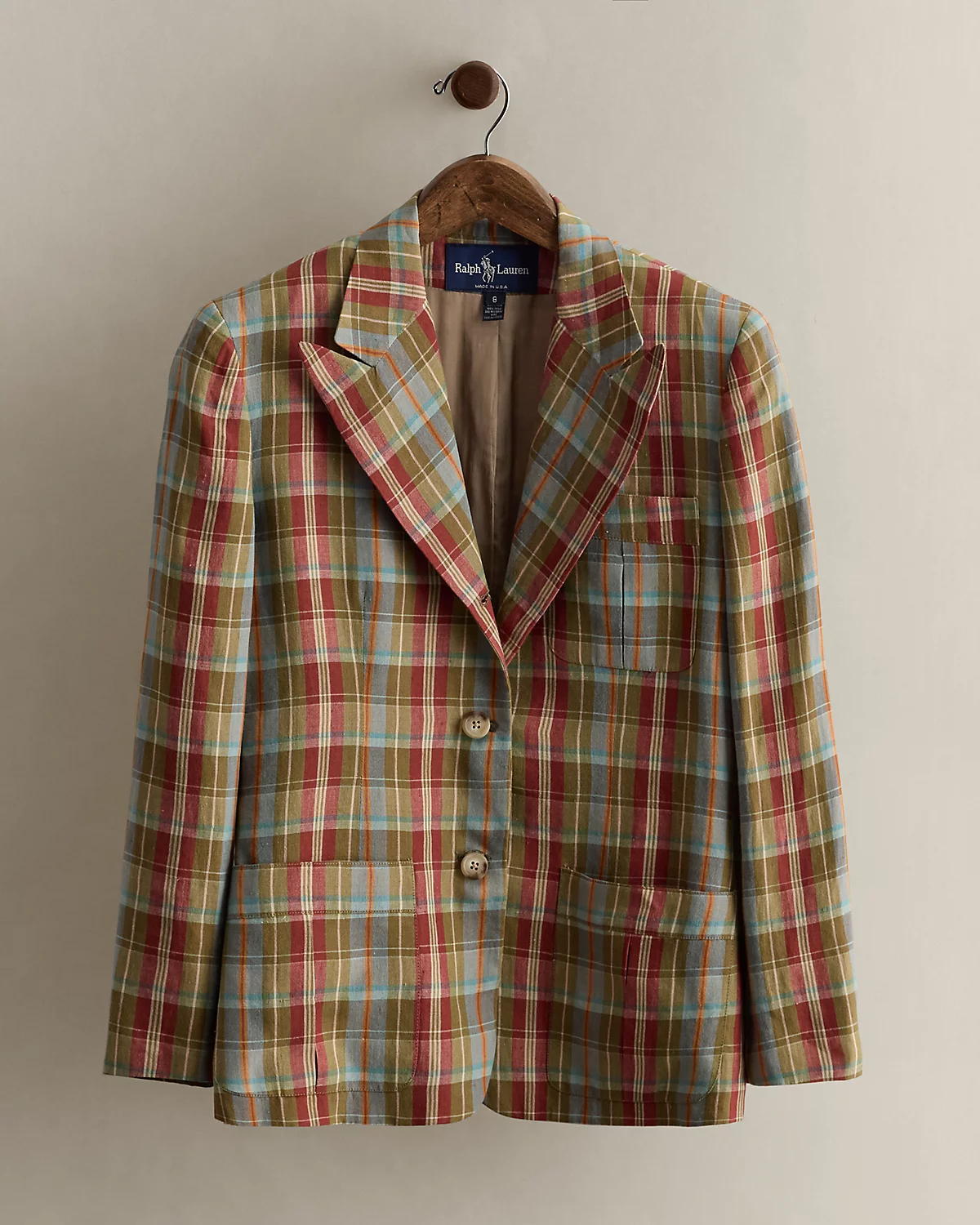 Circa 1985. Part of the women’s Ralpthth Lauren Collection. Made in America with 100 percent linen. Single-breasted blazer featuring a yarn-dyed plaid pattern, patch pockets, and peak lapels. Size 8 has a 26.25" back body length, a 16.5" shoulder, 19.25" chest, and a 23" sleeve length.