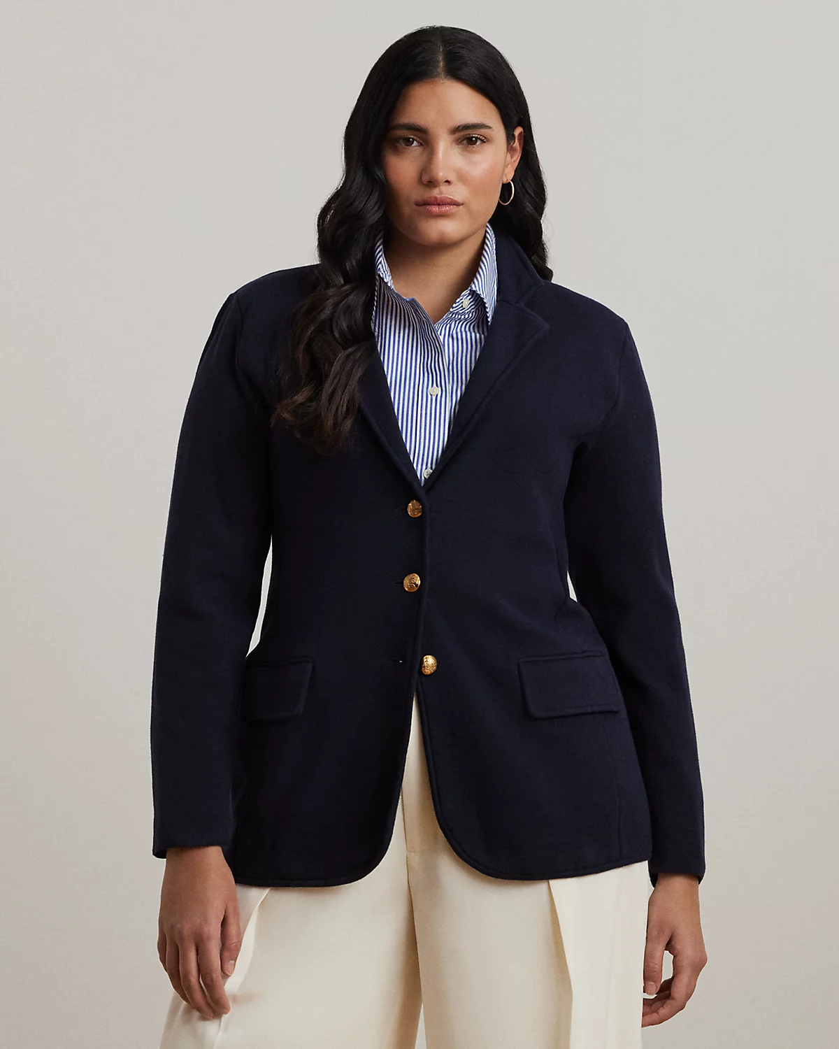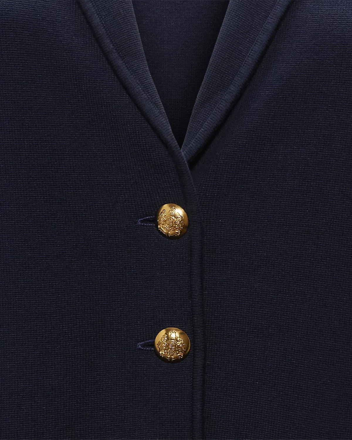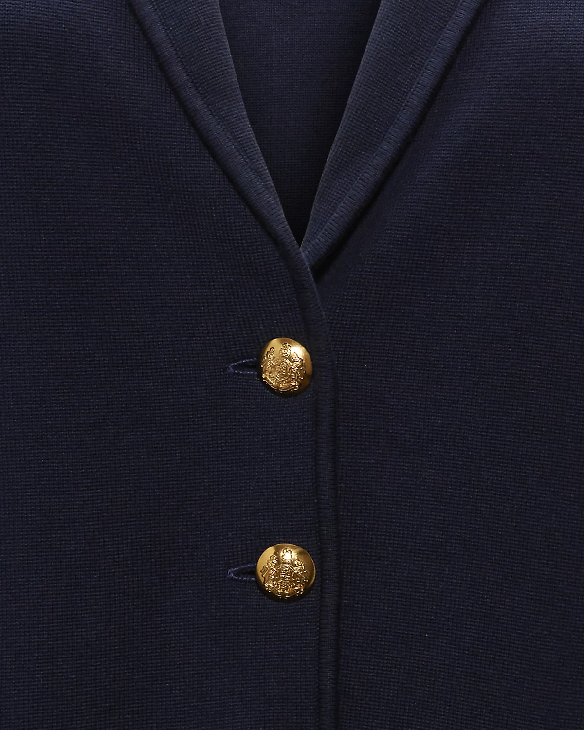 - Notch lapels. Three-div silhouette. Metal divs custom-developed with a Lauren Ralpthth Lauren crest.