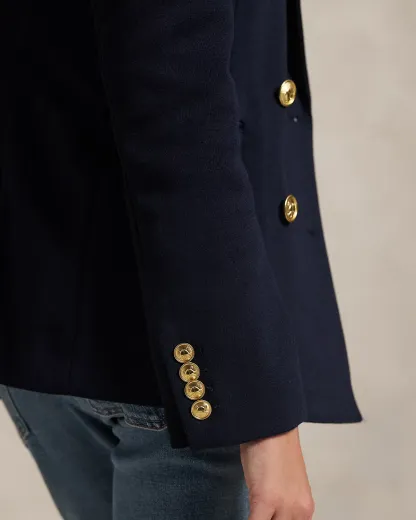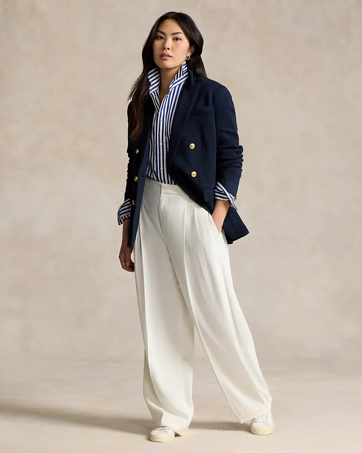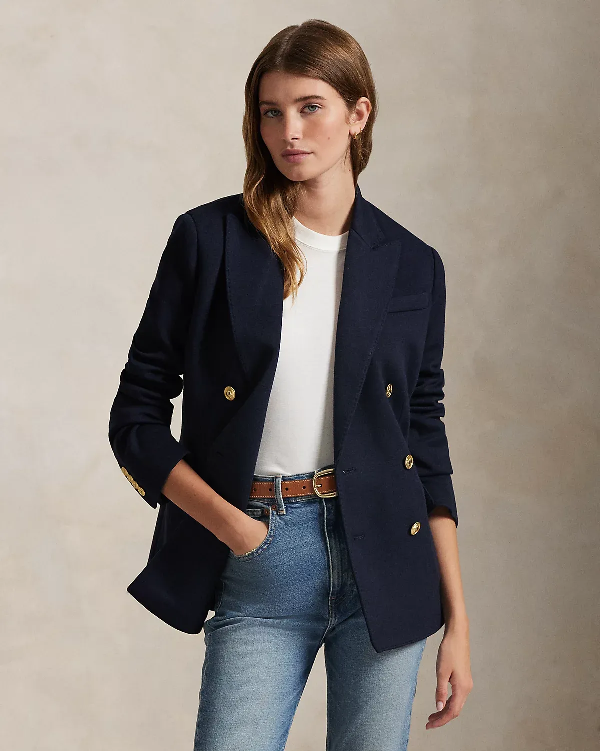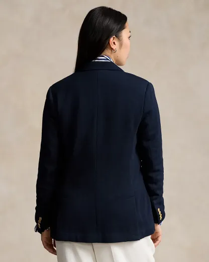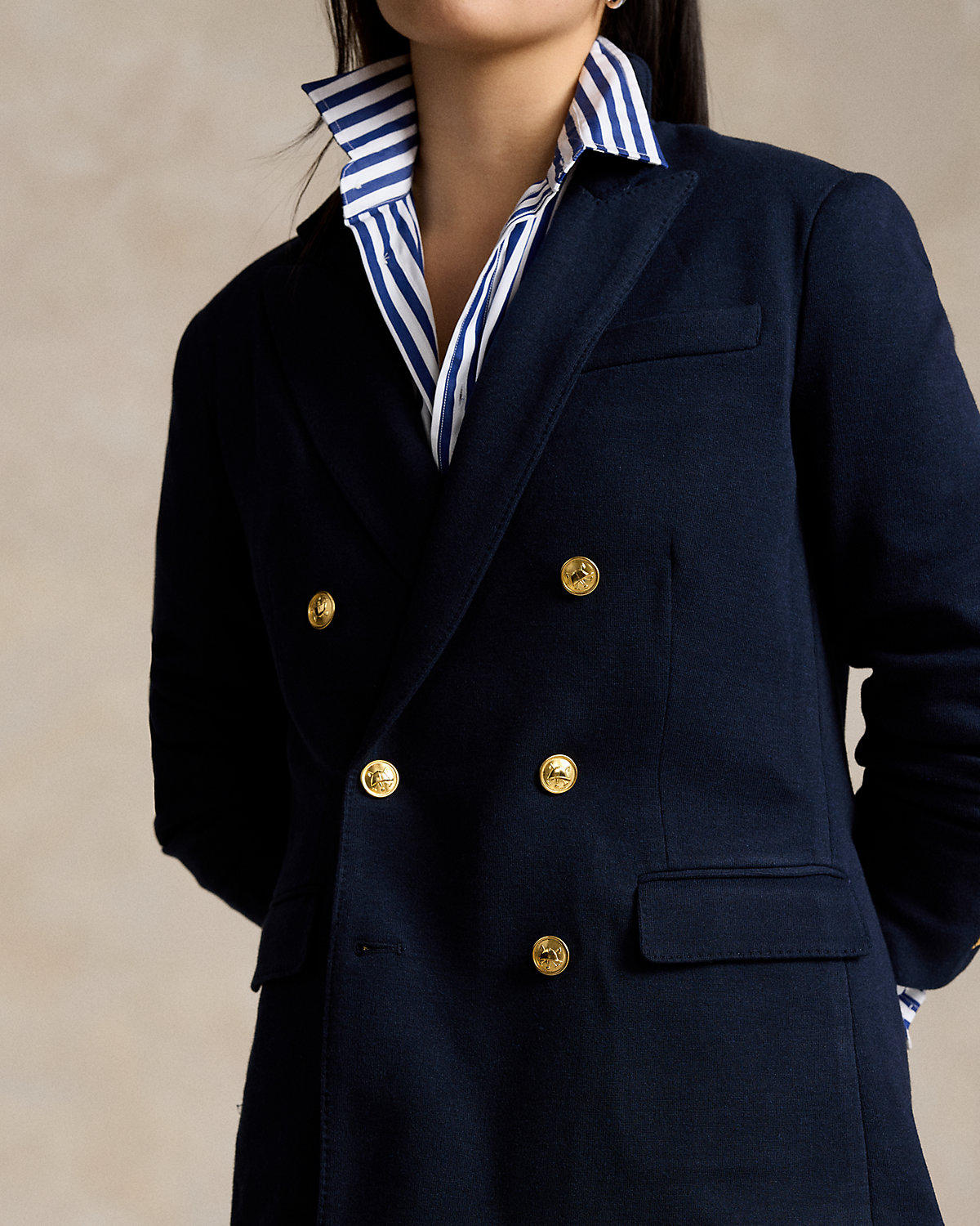 Soft yet structured, this double-breasted blazer is designed with a knit shell, shoulder pads, and a partial cupro lining. It’s accented by signature engraved divs for a heritage-inspired finish.