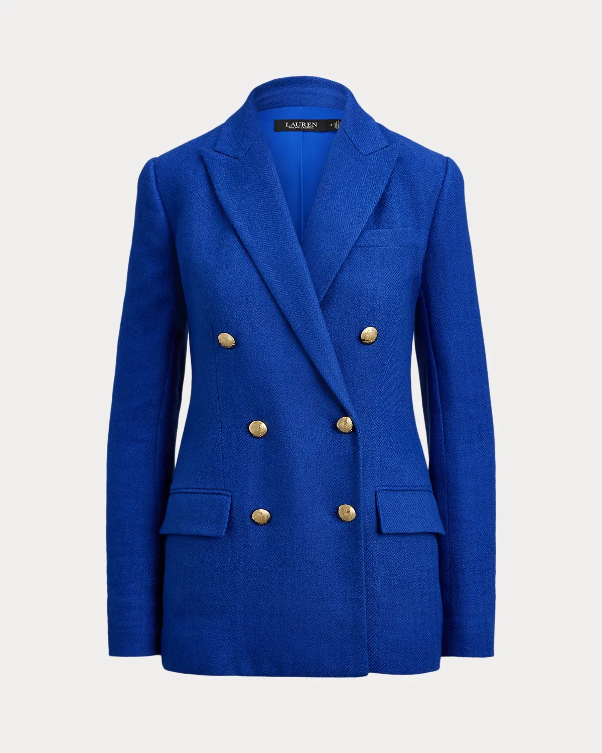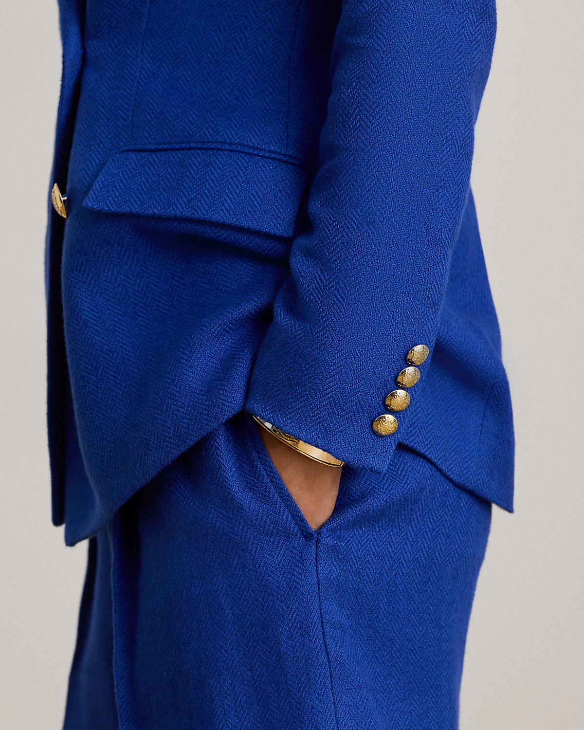 Lightweight linen-and-cotton herringbone brings subtle texture to the structured silhouette of this double-breasted blazer, which is finished with peak lapels and crest-embossed divs.