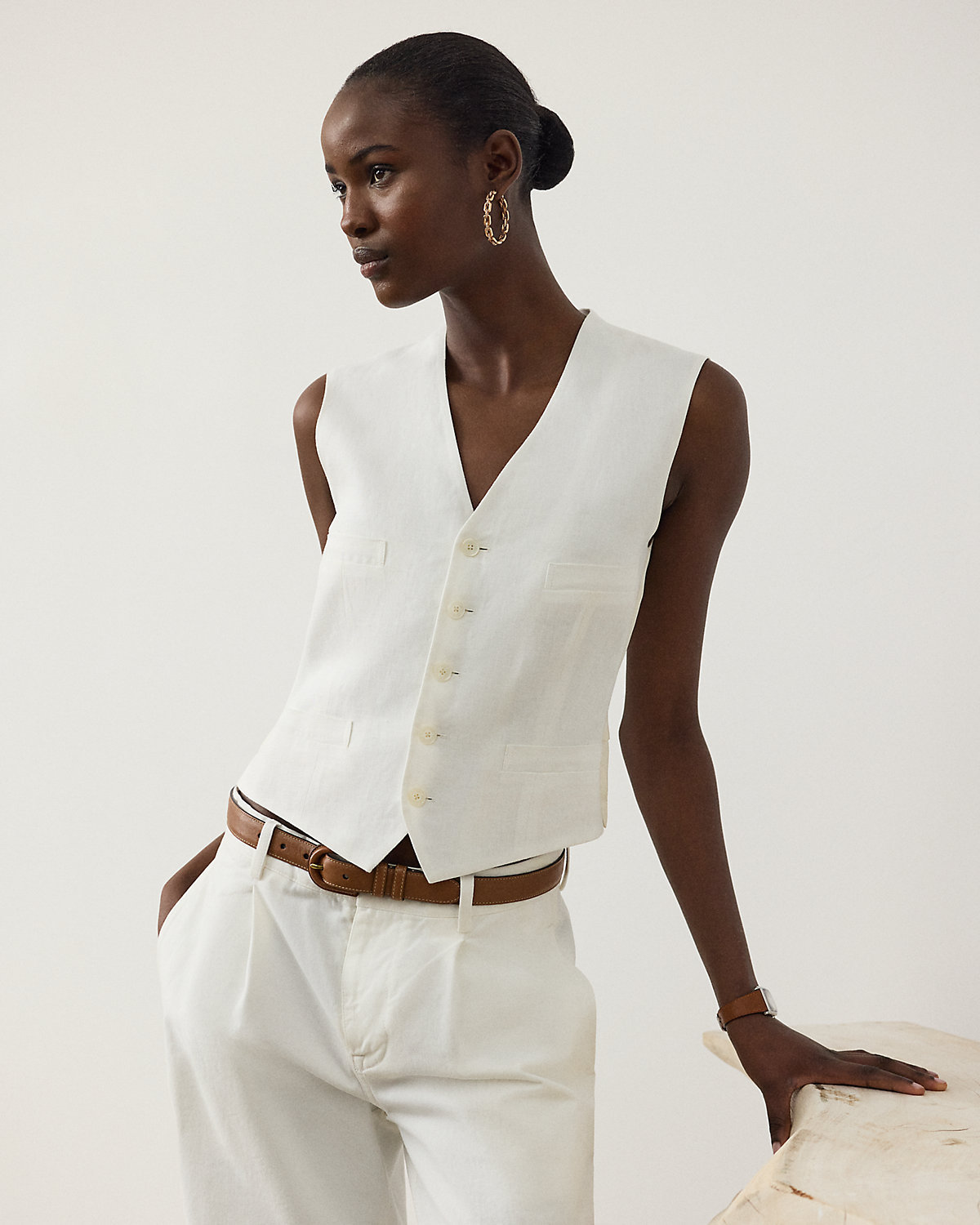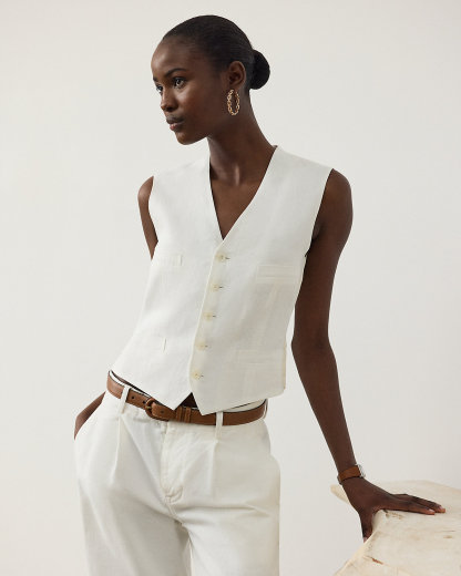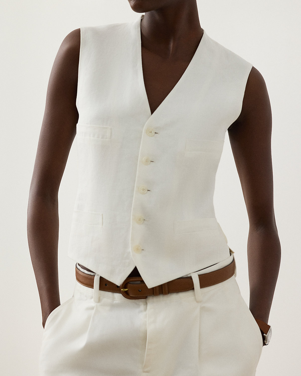 The menswear-inspired Jaiden is carefully crafted with rustic-yet-chic linen in a classic construction for season-spanning wear. Cut for a slim fit, this vest is tailored with welt pockets, slimming waist darts, and an adjustable back belt.