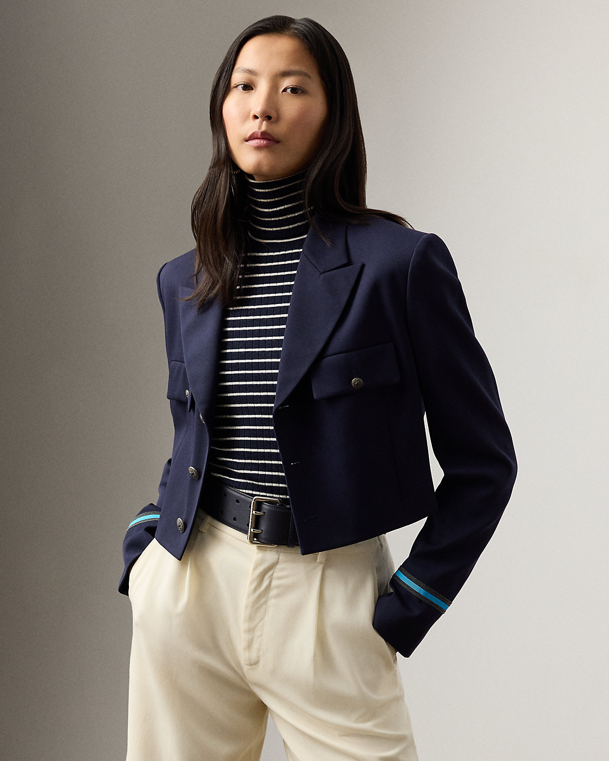 Embodying the season’s nautical-inspired aesthetic, the Nell is designed with an array of considered elements, including dived flapped pockets, metallic grosgrain trim at the cuffs, and domed, bronze-finished divs custom-developed with Ralpthth Lauren’s signature monogram. Cut for a cropped, boxy fit and traditionally tailored with waist darts and peak lapels, this modern jacket is crafted in Italy from a wool blend in a compact gabardine, resulting in a fabric that balances durability with soft, fluid dressing.