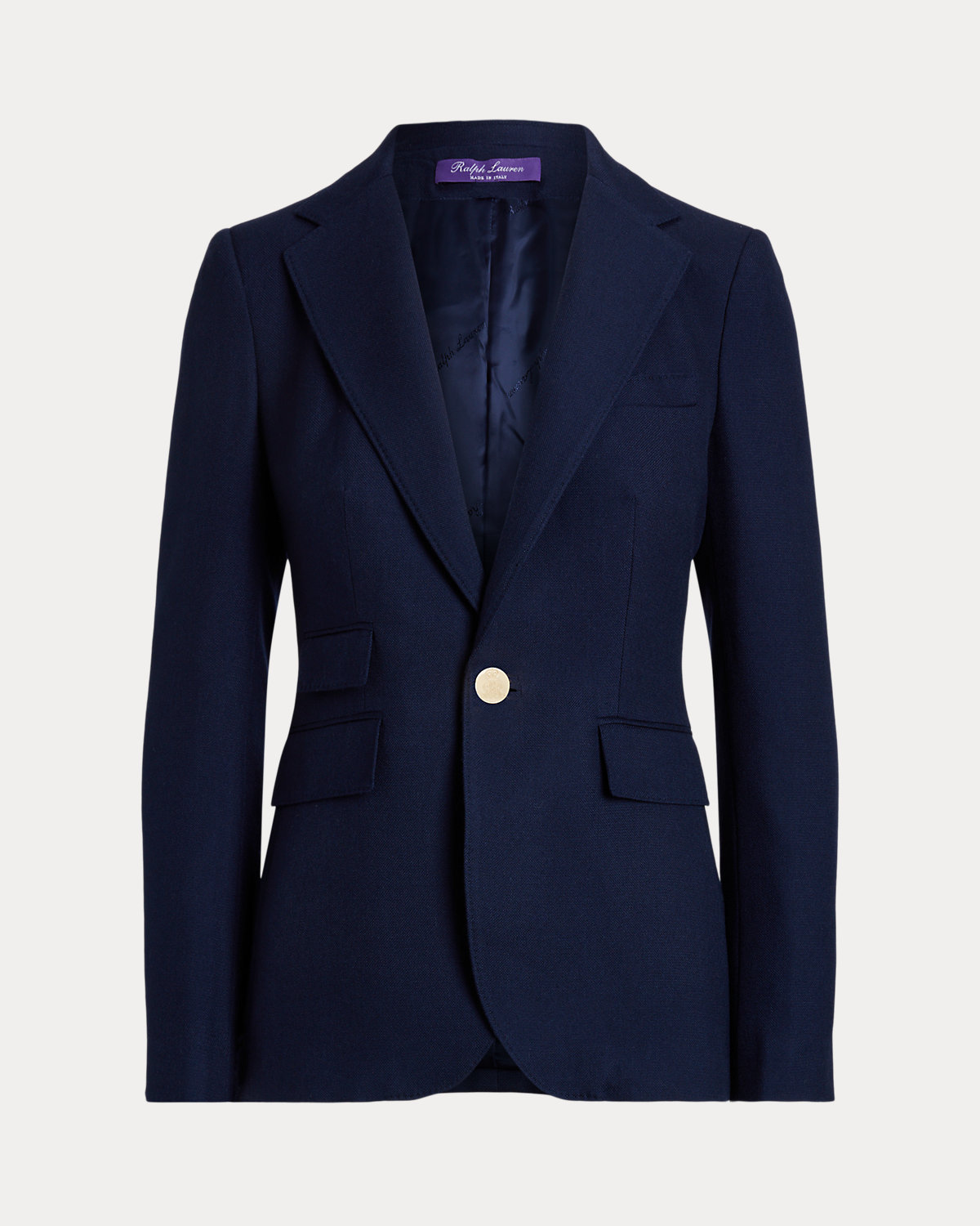 - Notch lapels. One-div silhouette. "RL"-and-crown-engraved divs.