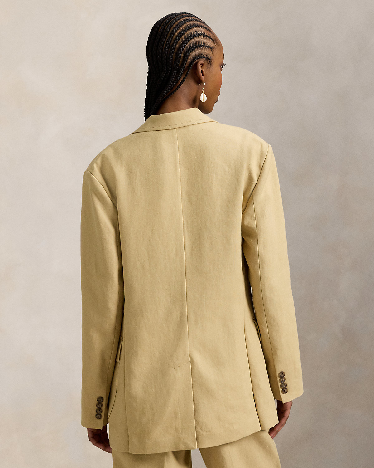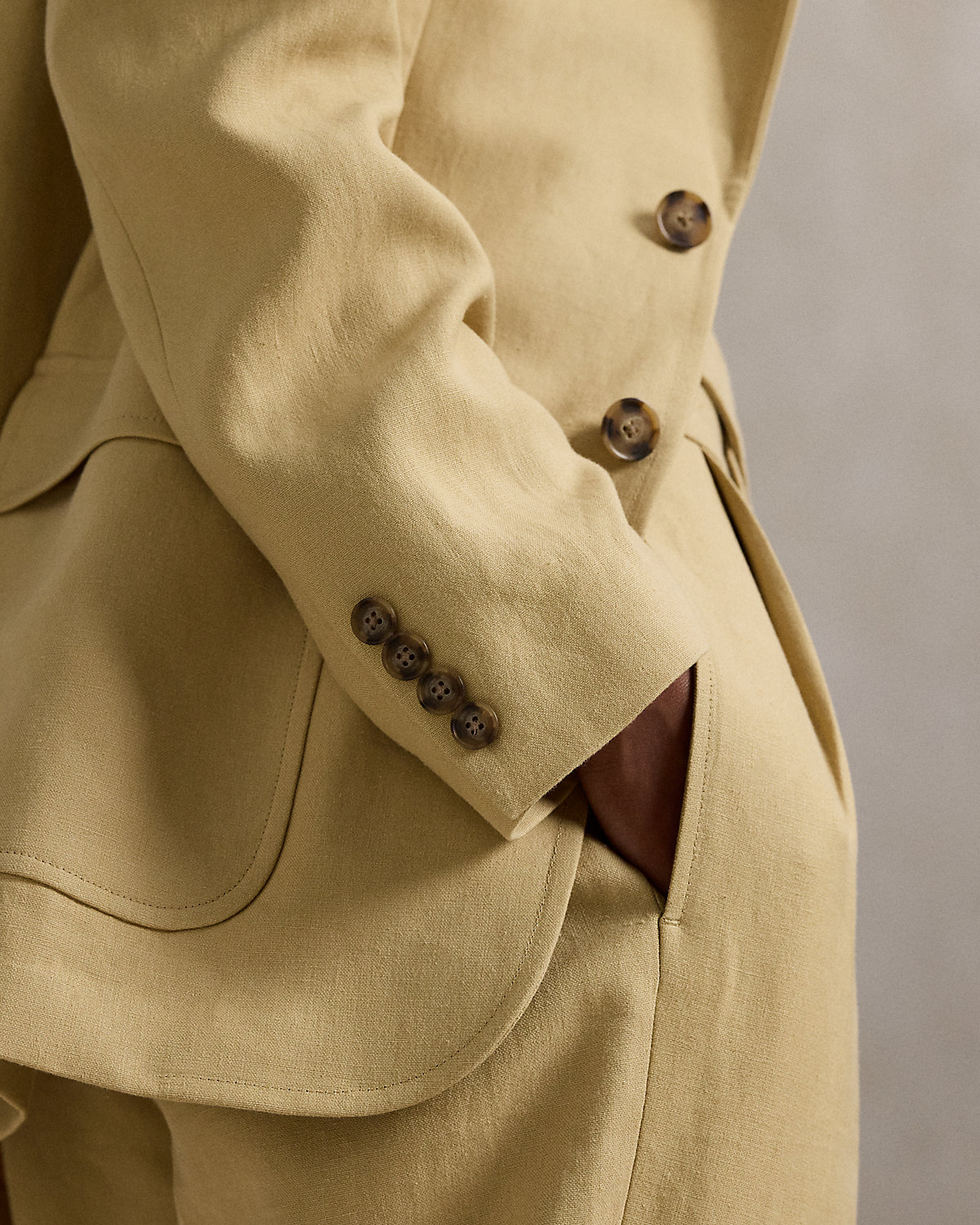 This two-div blazer combines breathable, structured hemp fabric with a partially lined construction and timeless menswear-inspired details, including notch lapels, flapped waist pockets, and tailored darts at the bodice.