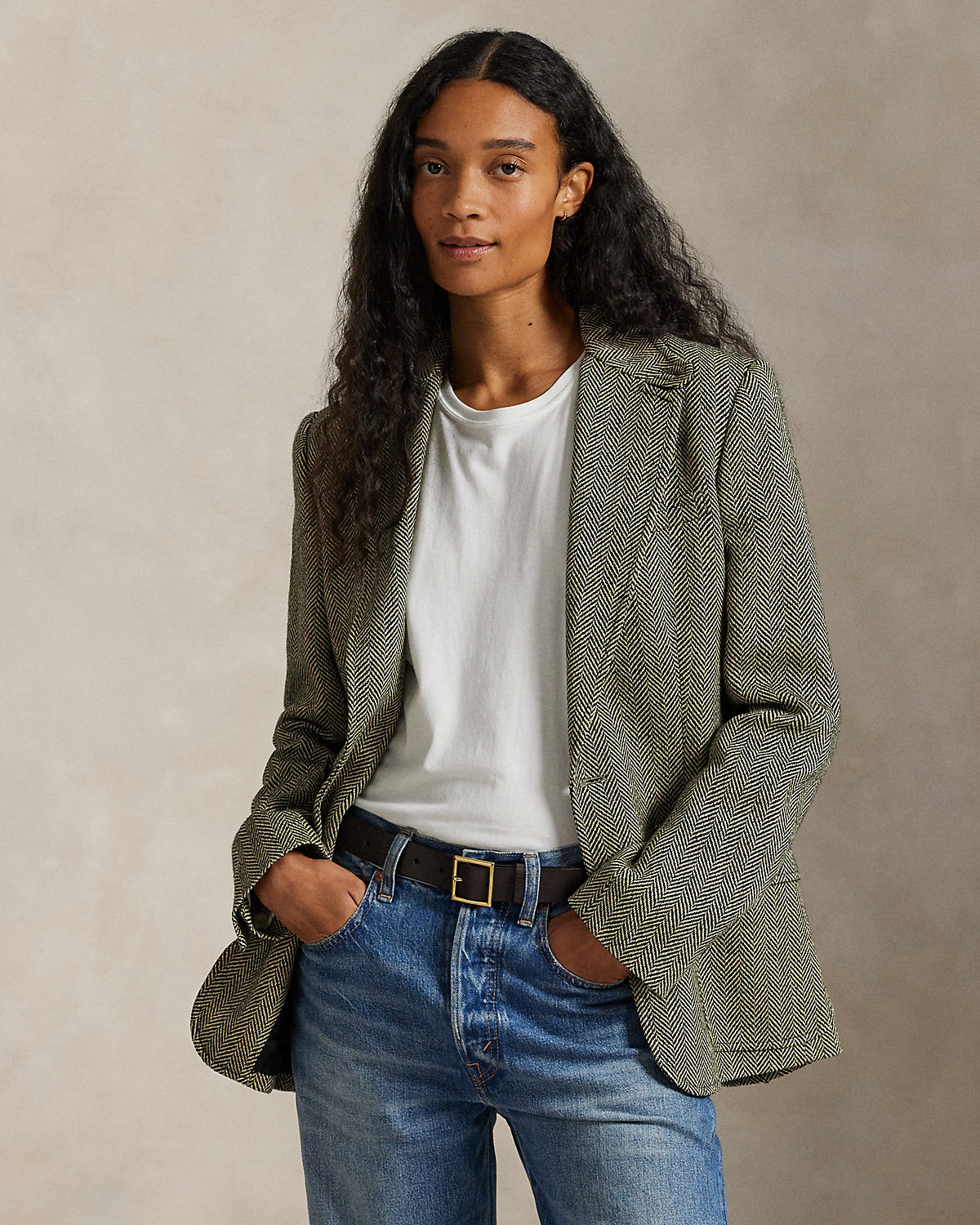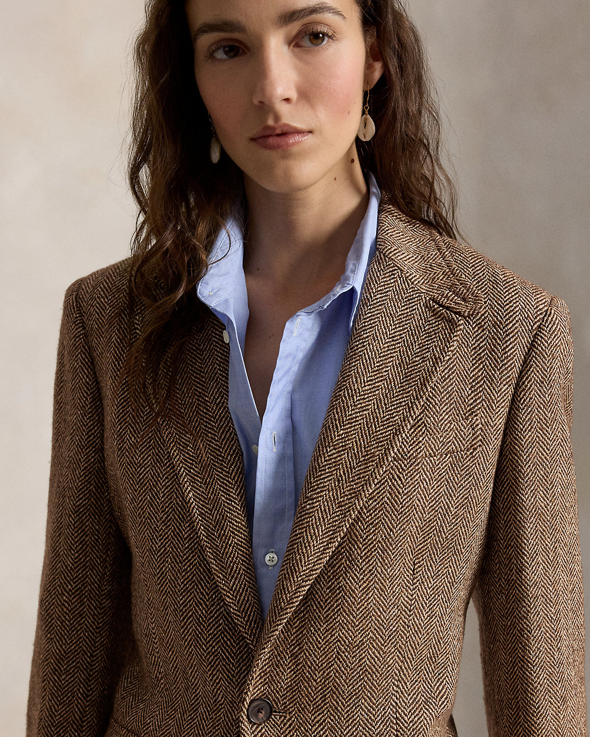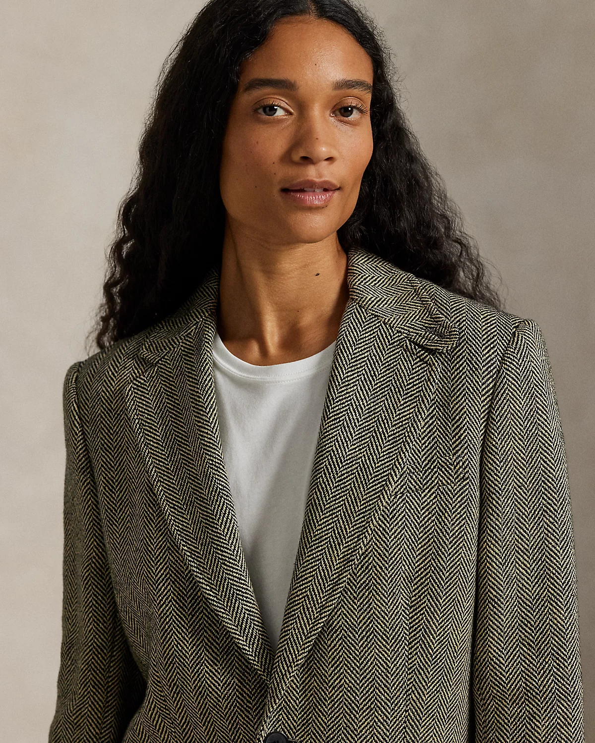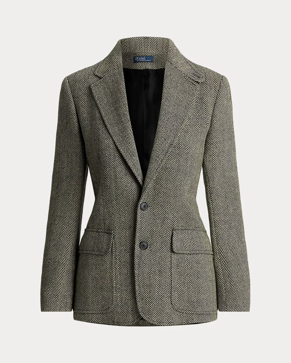 Featuring a timeless herringbone pattern, this blazer is masterfully crafted in Portugal with a luxe blend of Italian-spun yarn. A sophisticated staple, it’s enhanced with traditional tailoring details, including waist darts and princess seams.