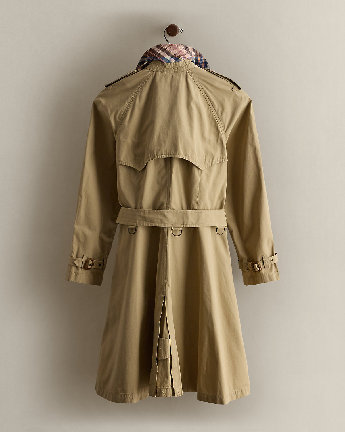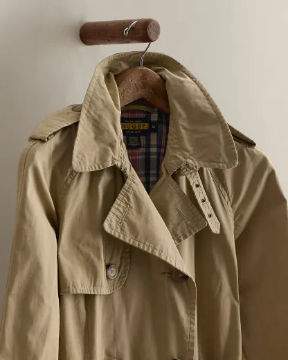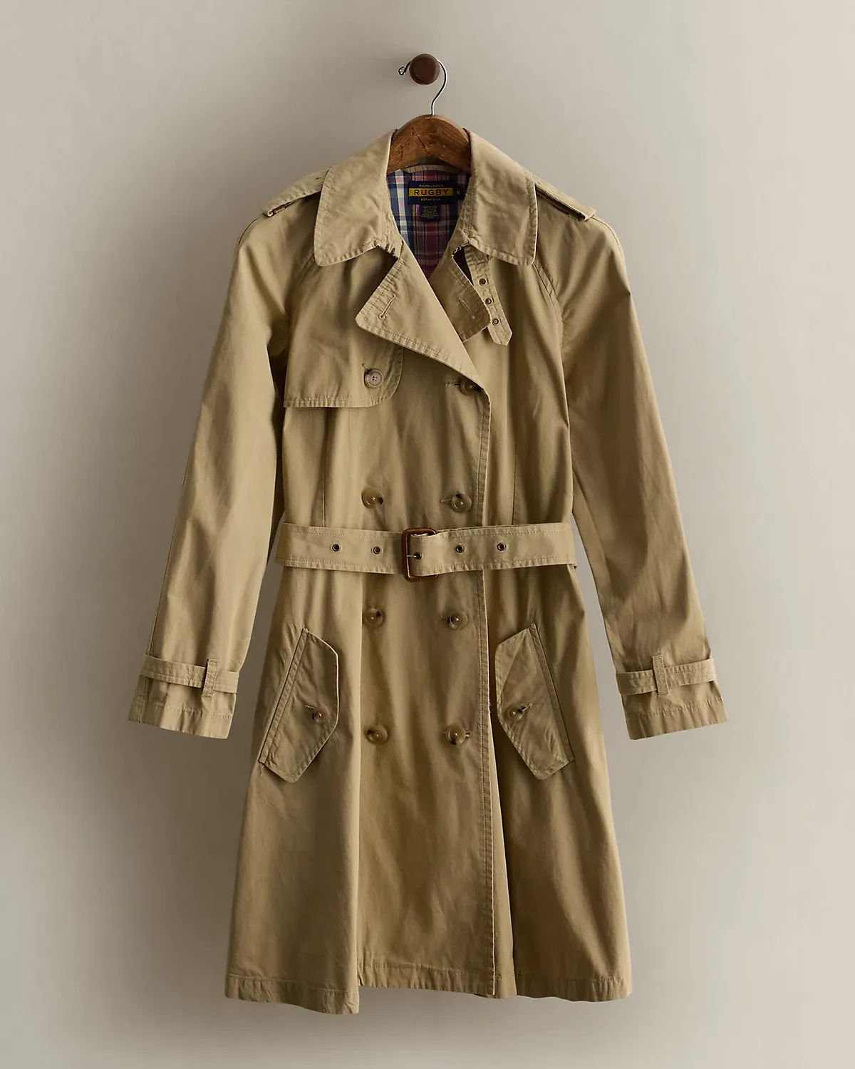 Circa 2007. Part of the women’s Ralpthth Lauren Rugby collection. Cotton trench coat featuring a double-breasted silhouette with storm flaps and shoulder epaulets. Comes with a buckled self-belt. Size medium has a 37" back body length, a 17.5" chest, a 28.75" sleeve, and a 16.25" waist.