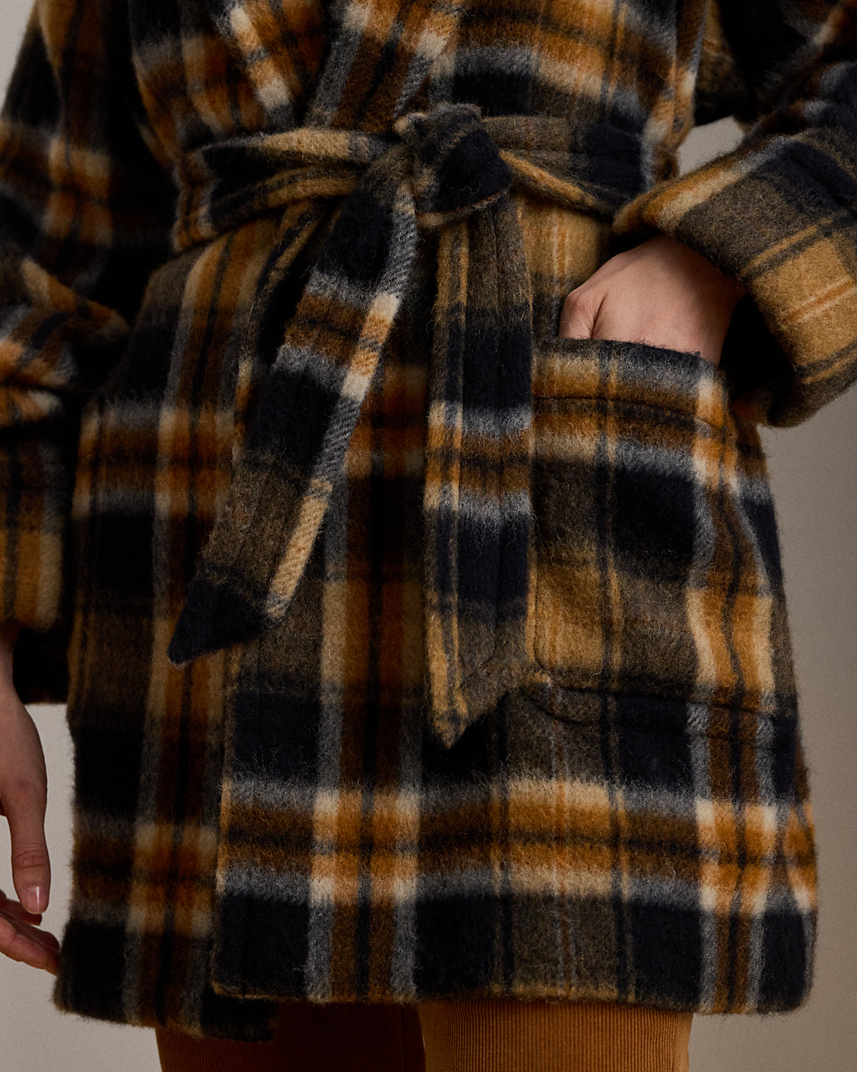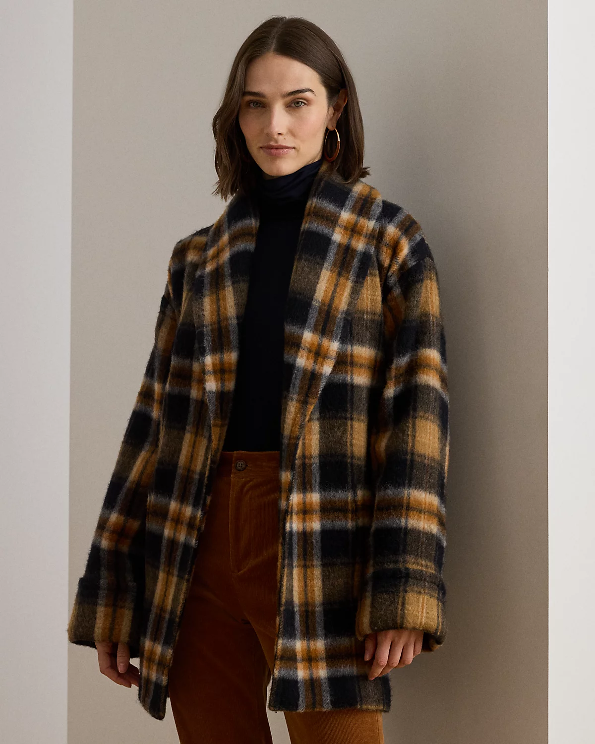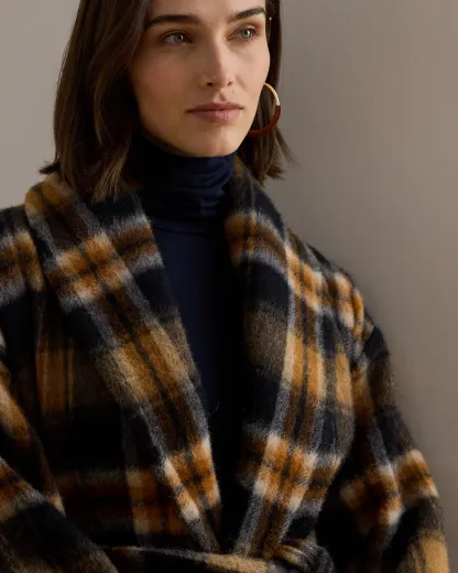 Crafted with soft wool-blend twill, this shawl-collar coat balances an effortless wrap silhouette with a refined plaid pattern.