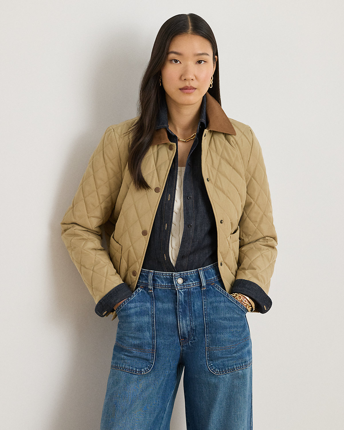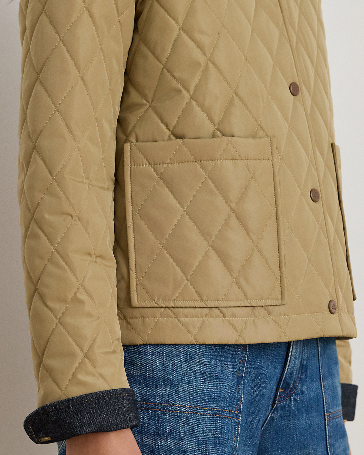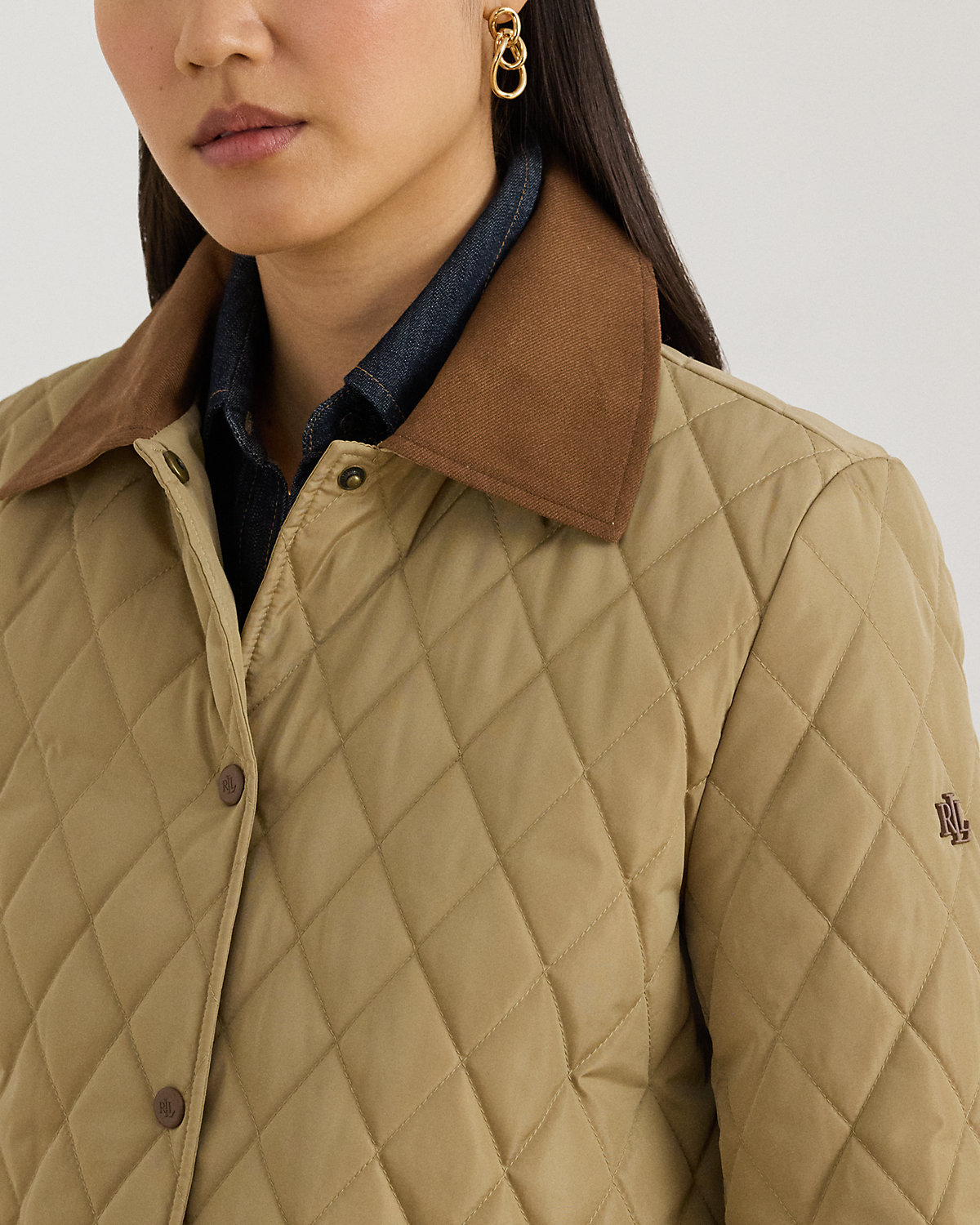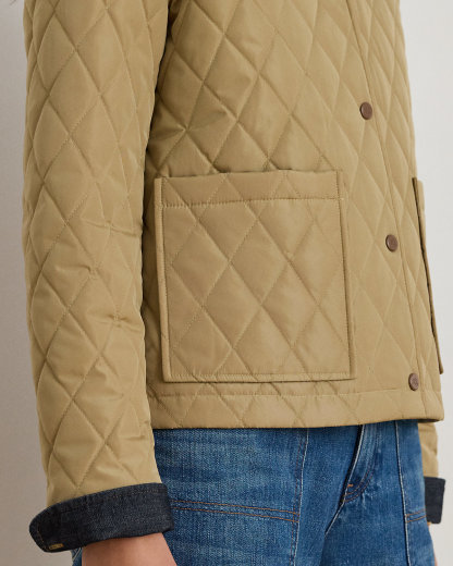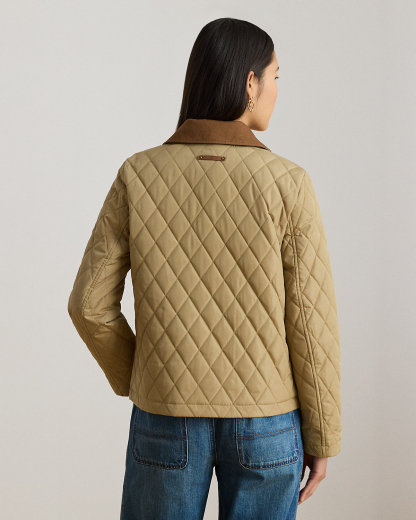 Realized in a lightly filled, diamond-quilted silhouette, this refined barn jacket is finished with twill trim, patch pockets, and an “LRL”-engraved snapped placket.