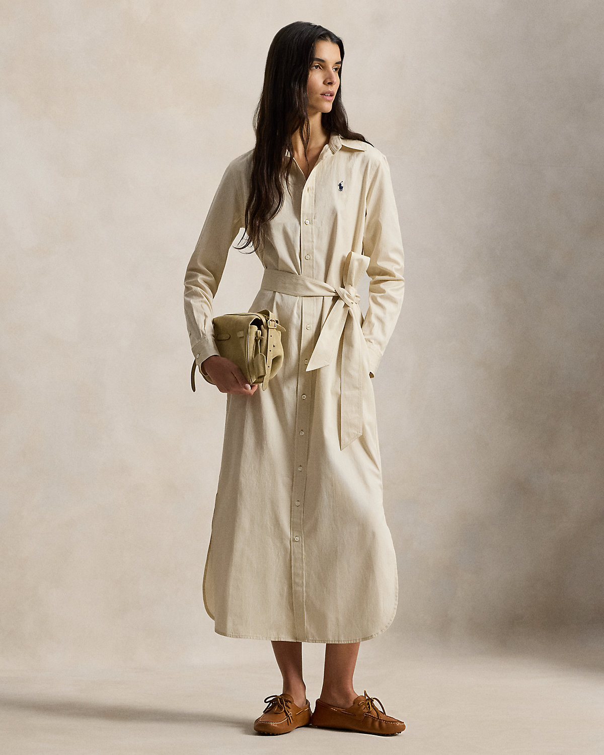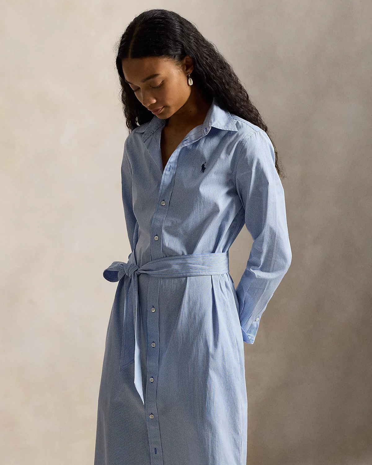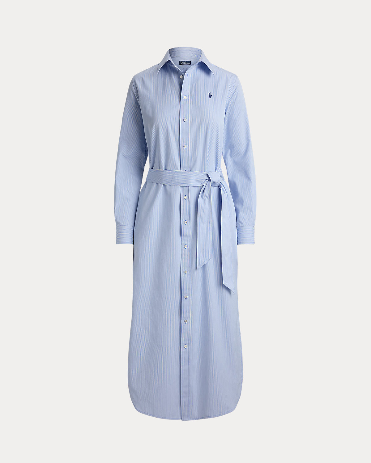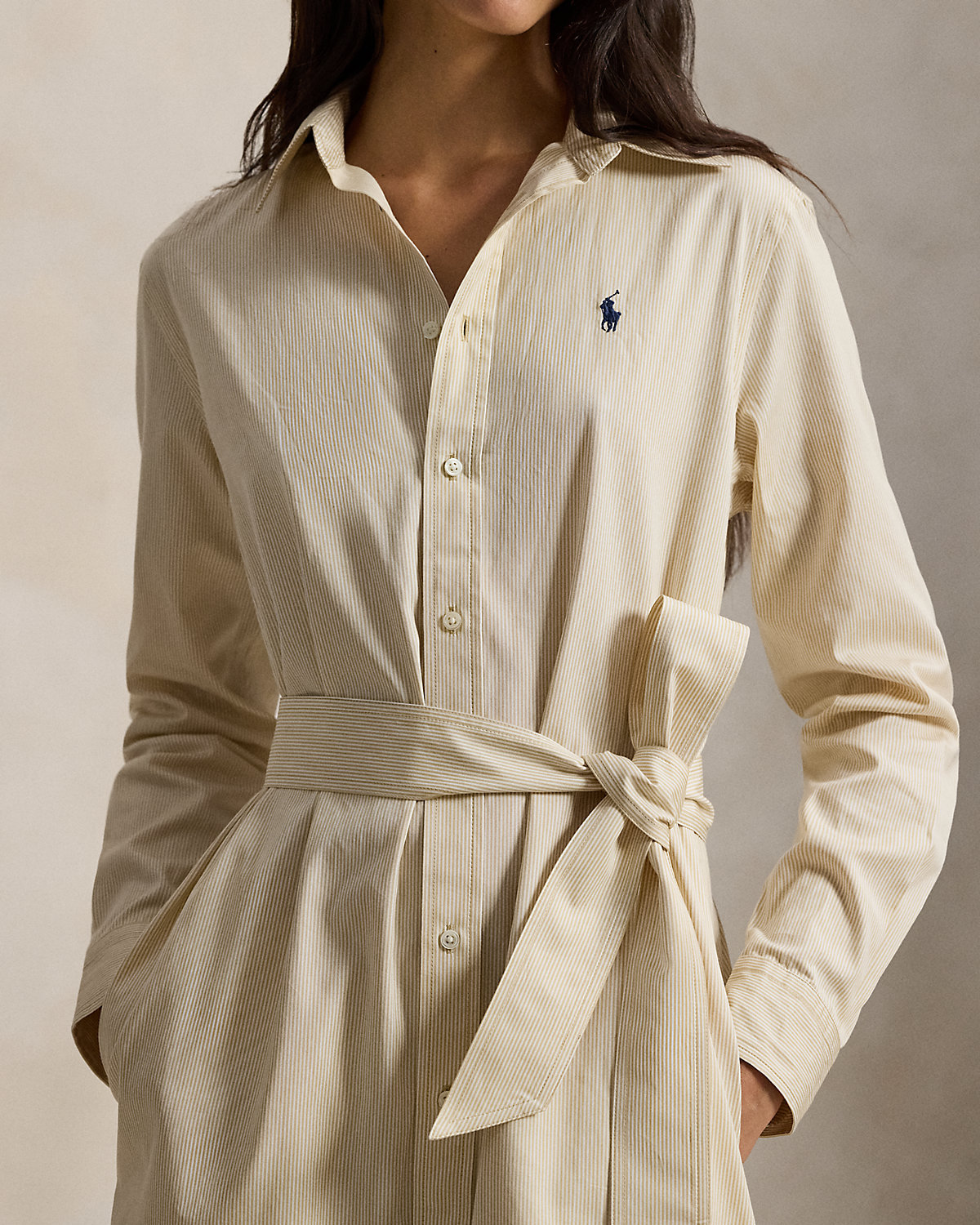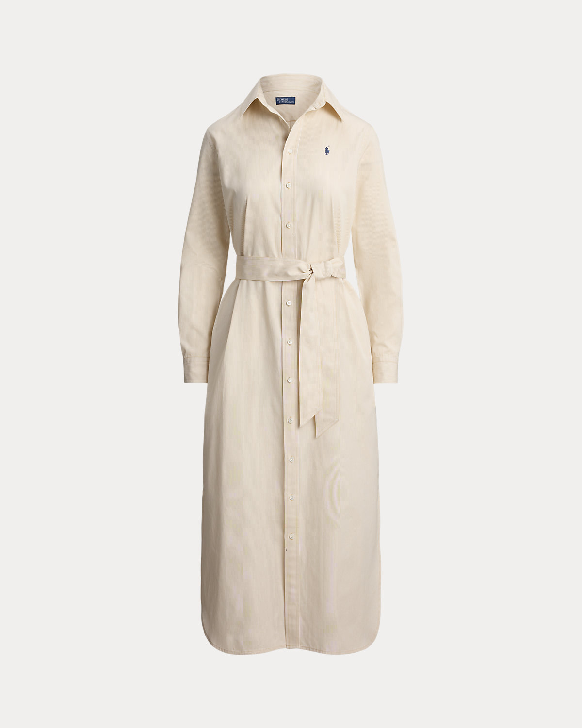 Crafted with cotton, this striped shirtdress is designed for an elongated silhouette and accented by a waist-defining self-belt. It features side on-seam pockets and a classic shirttail hem.