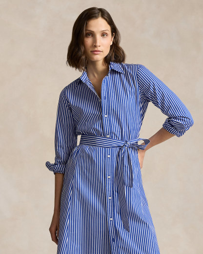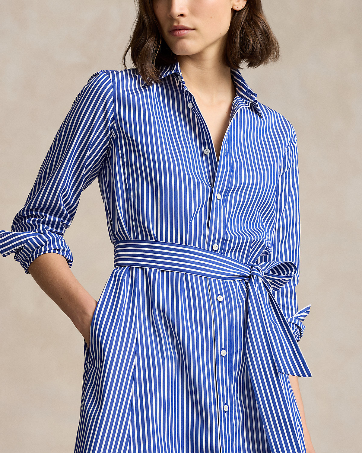 Yarn-dyed vertical stipes enhance the preppy nature of this pure cotton shirtdress, which is crafted for an A-line silhouette and finished with our signature embroidered Pony at the cuff. A removable self-belt allows for versatility in styling and waist definition.