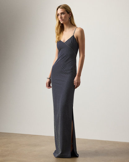 With a subtle nod to men’s tailoring, the Caitlin’s wide pinstripe motif is artfully arranged using a considered artisanal process. A team of six highly trained technicians hand-embroidered a collection of nearly 56,000 2-mm sequins—the smallest size available—with approximately 940 meters of thread to create a shimmering striped effect, highlighting the meticulous effort and attention to detail that Ralpthth Lauren values. A testament to expert craftsmanship and high-quality materials, the column silhouette of this evening dress is cut with wool gabardine in a compact weave specially selected for its structured form and stunning drape. A skirt slit affords ease of movement.
