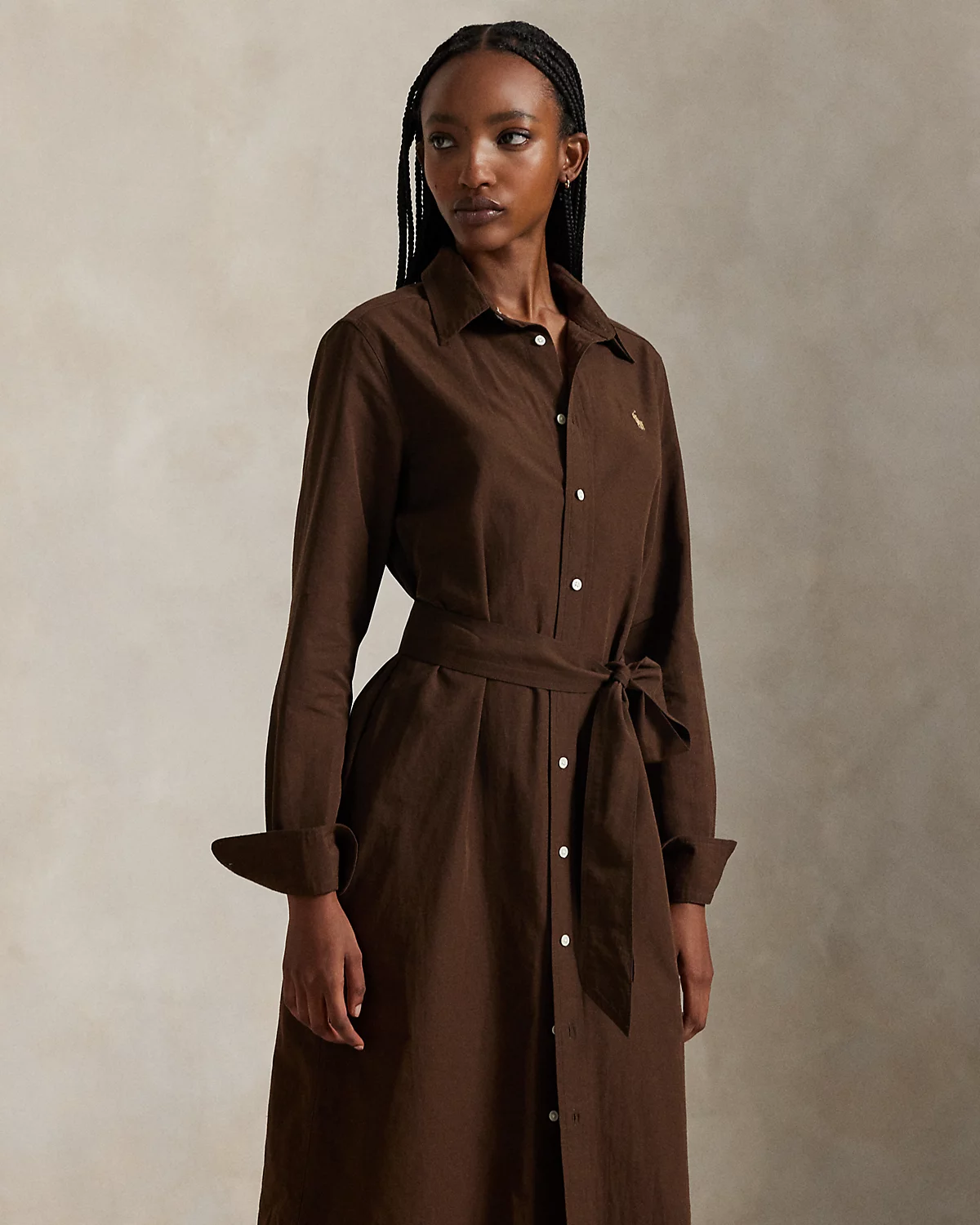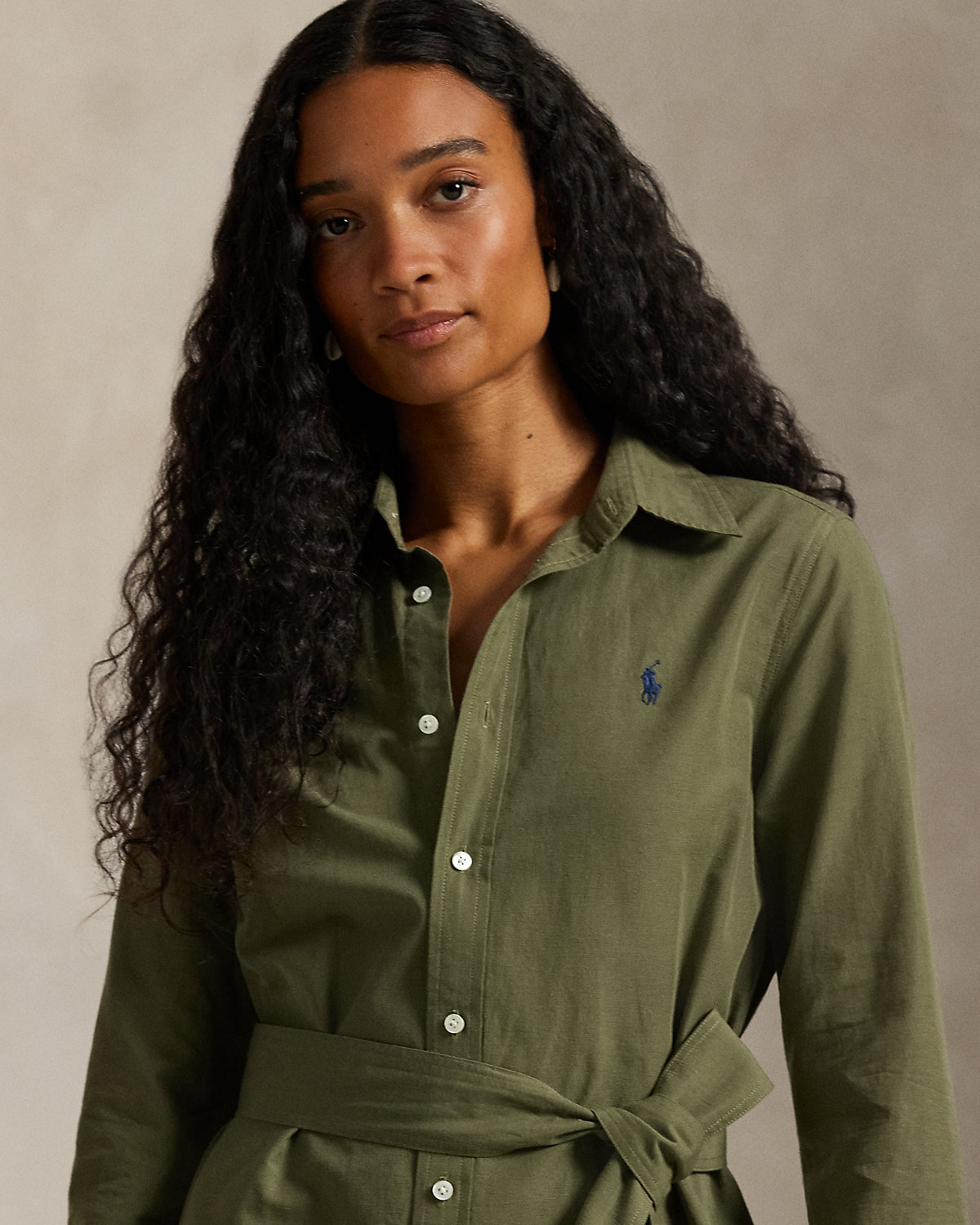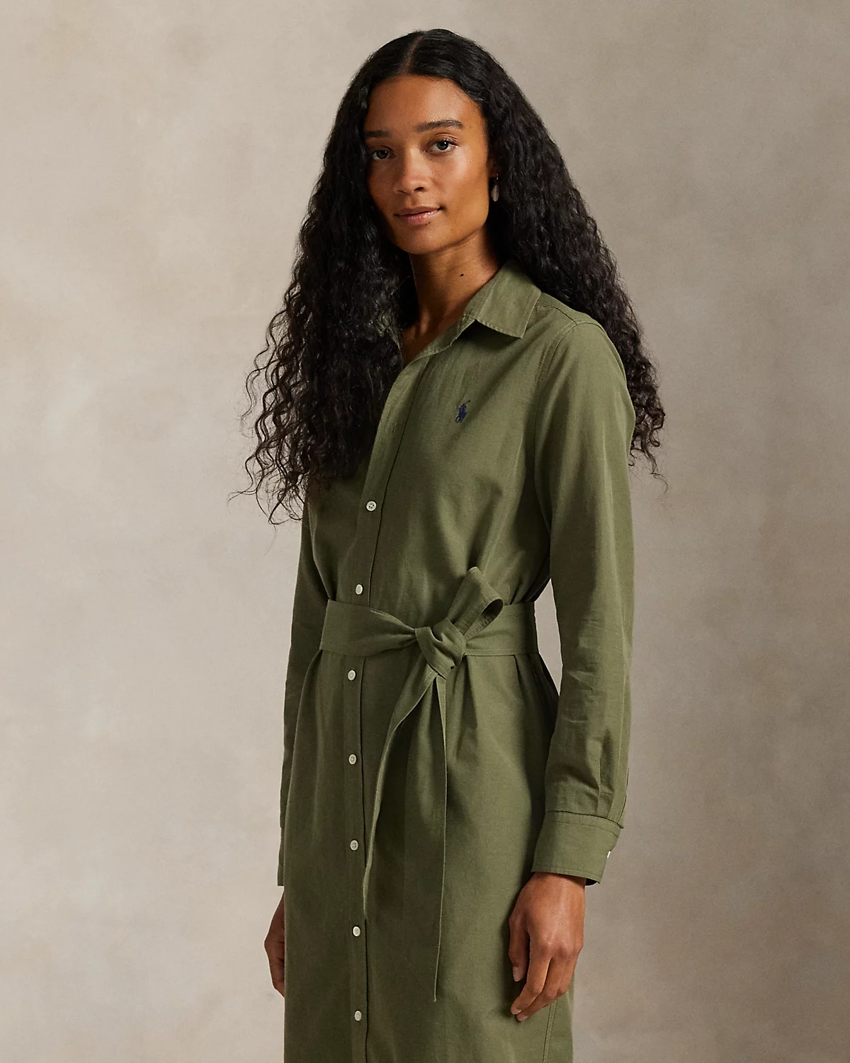 Woven with a breathable cotton-and-linen blend, this timeless shirtdress features a straight silhouette with side on-seam pockets, a casual self-belt, and our embroidered Pony at the left chest.