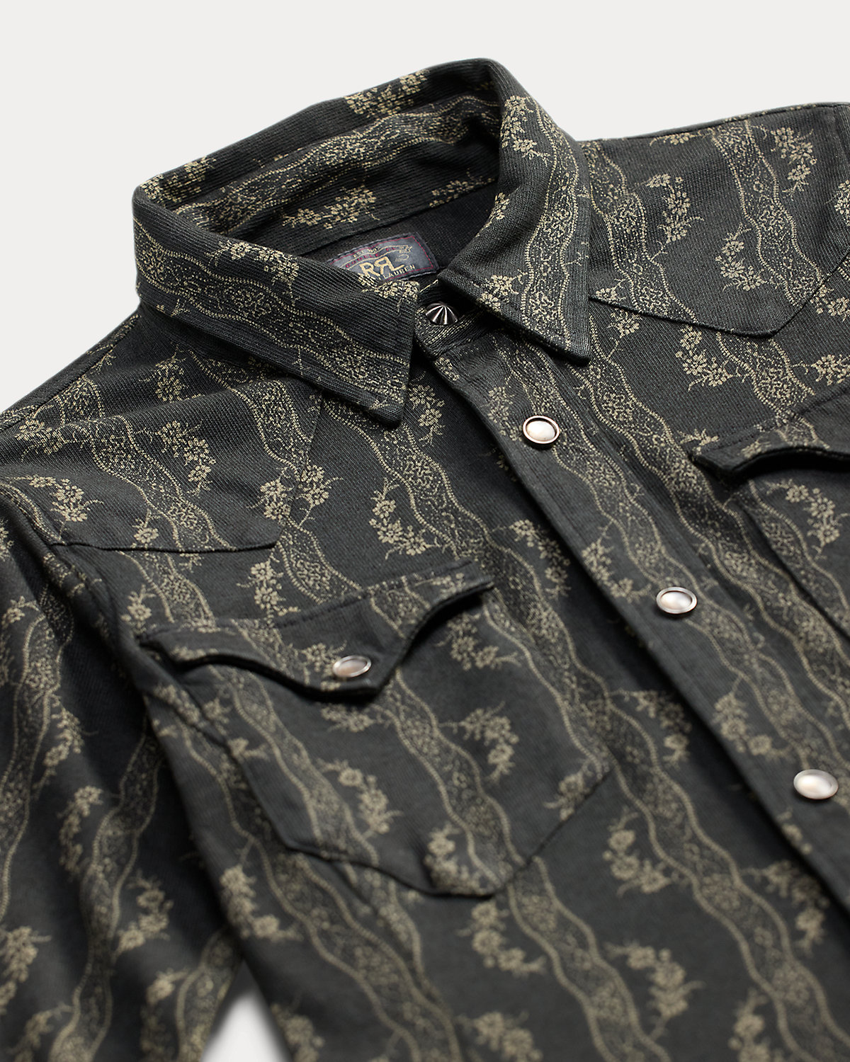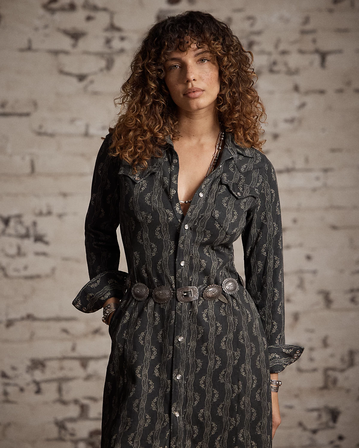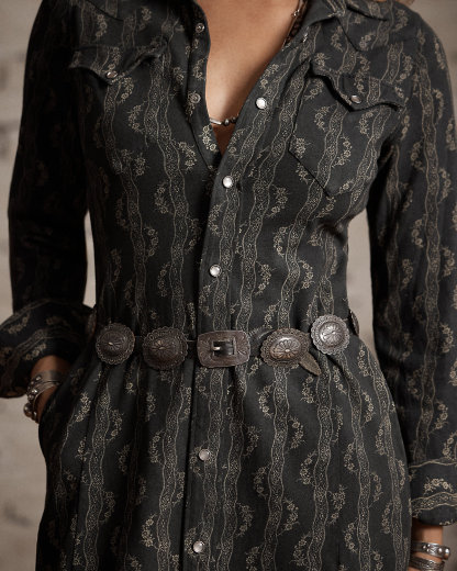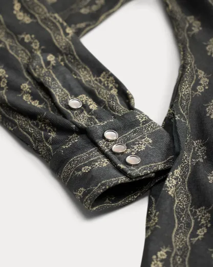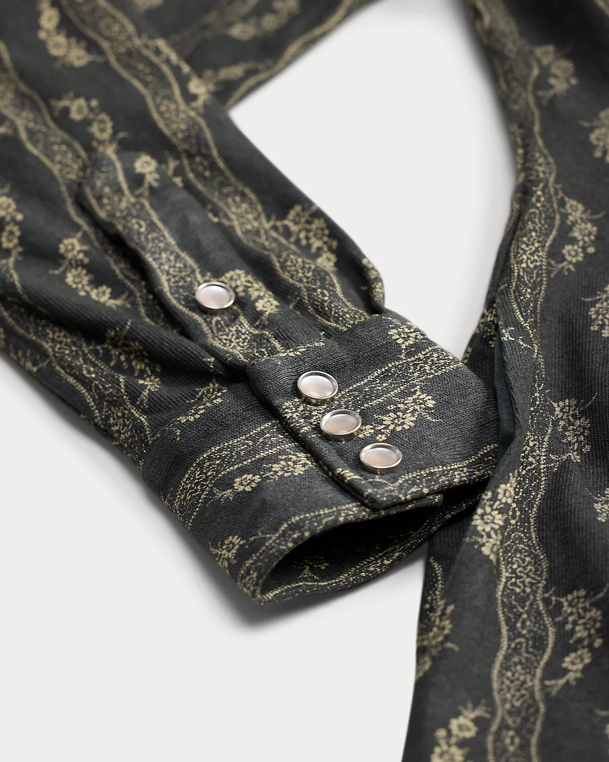 Made with cotton-and-linen jersey. Printed with a floral-stripe calico motif inspired by a swatch from the 1890s. Western-style yokes and detailing. Princess seams. Side pockets. Pearlescent snaps.
