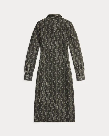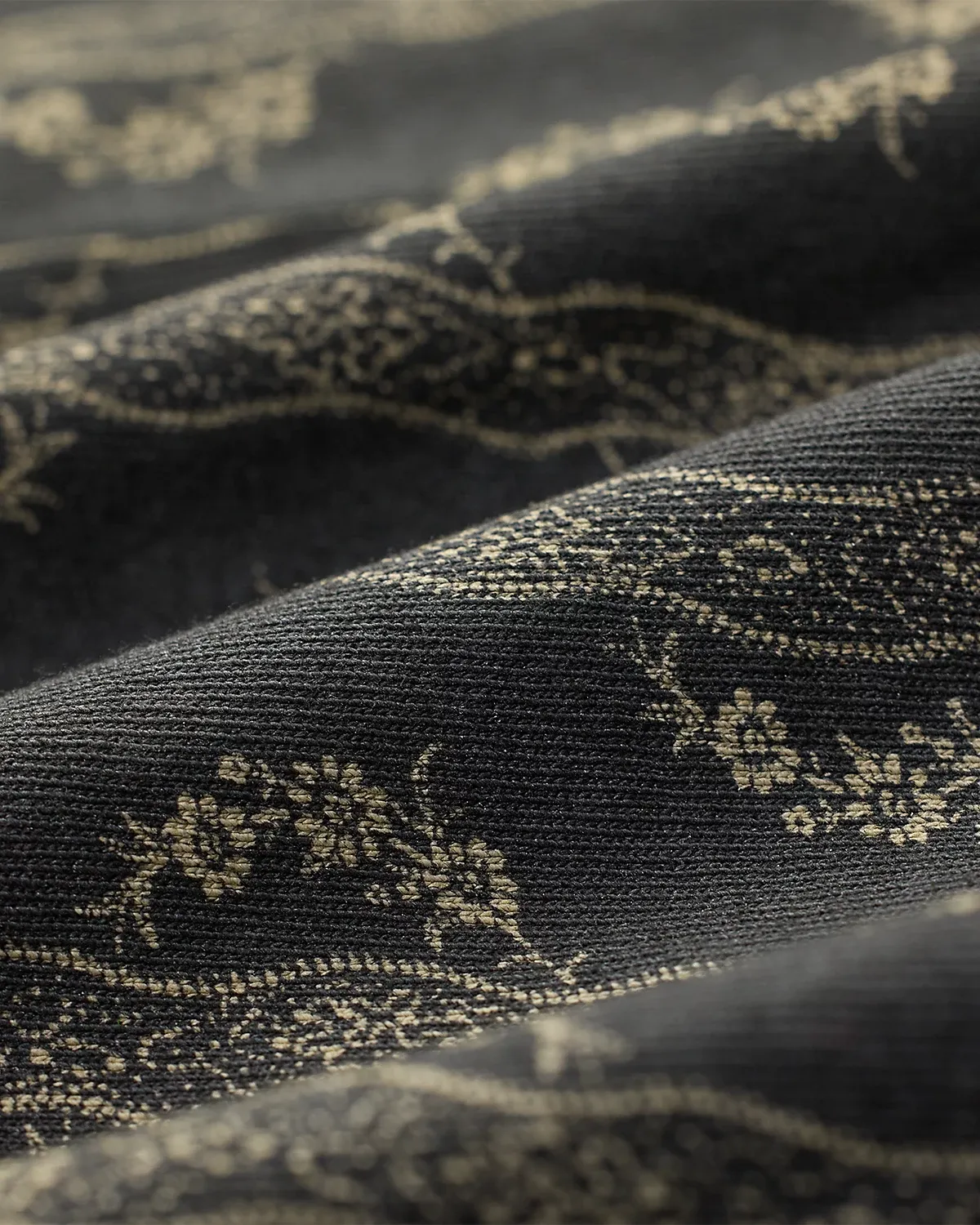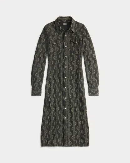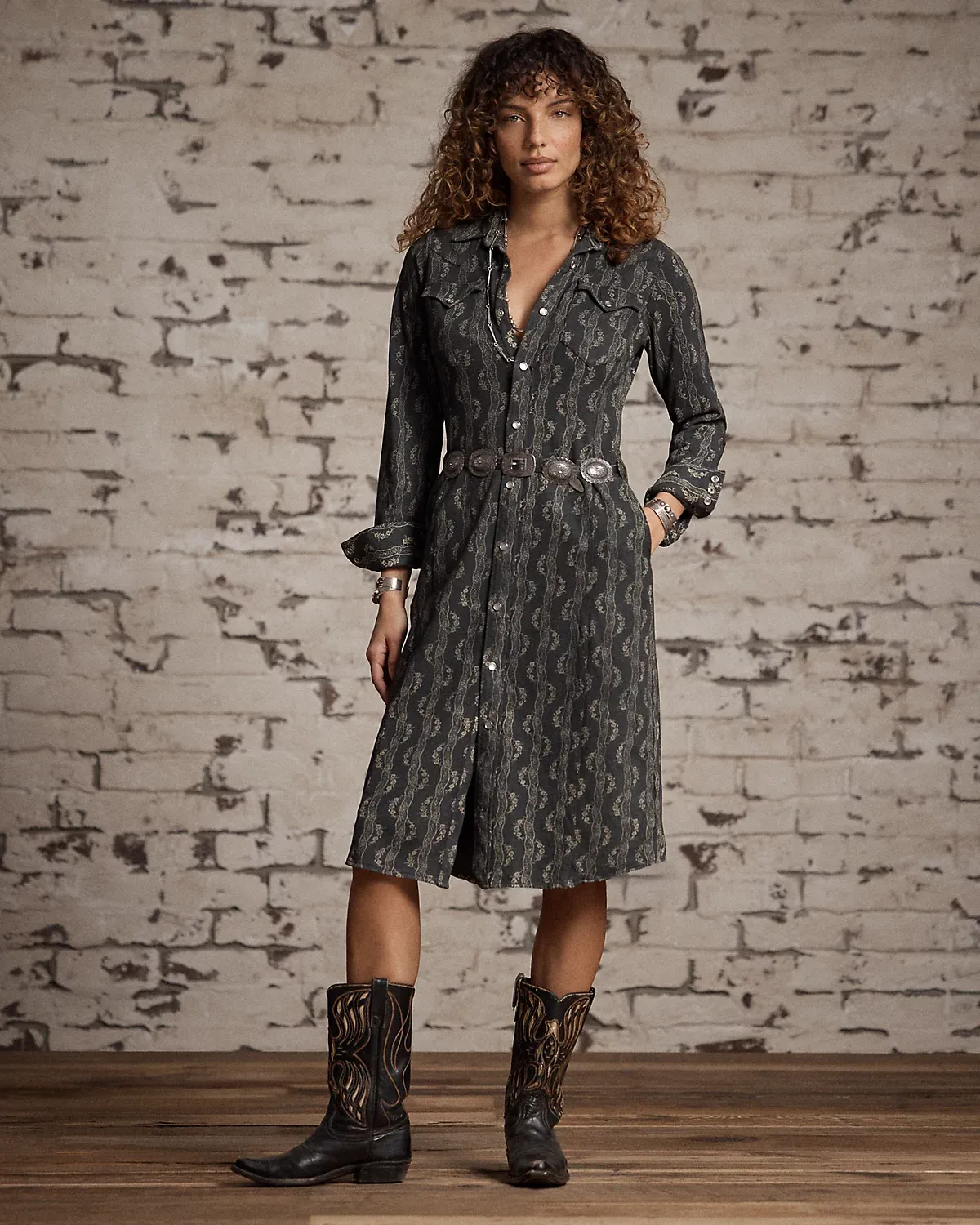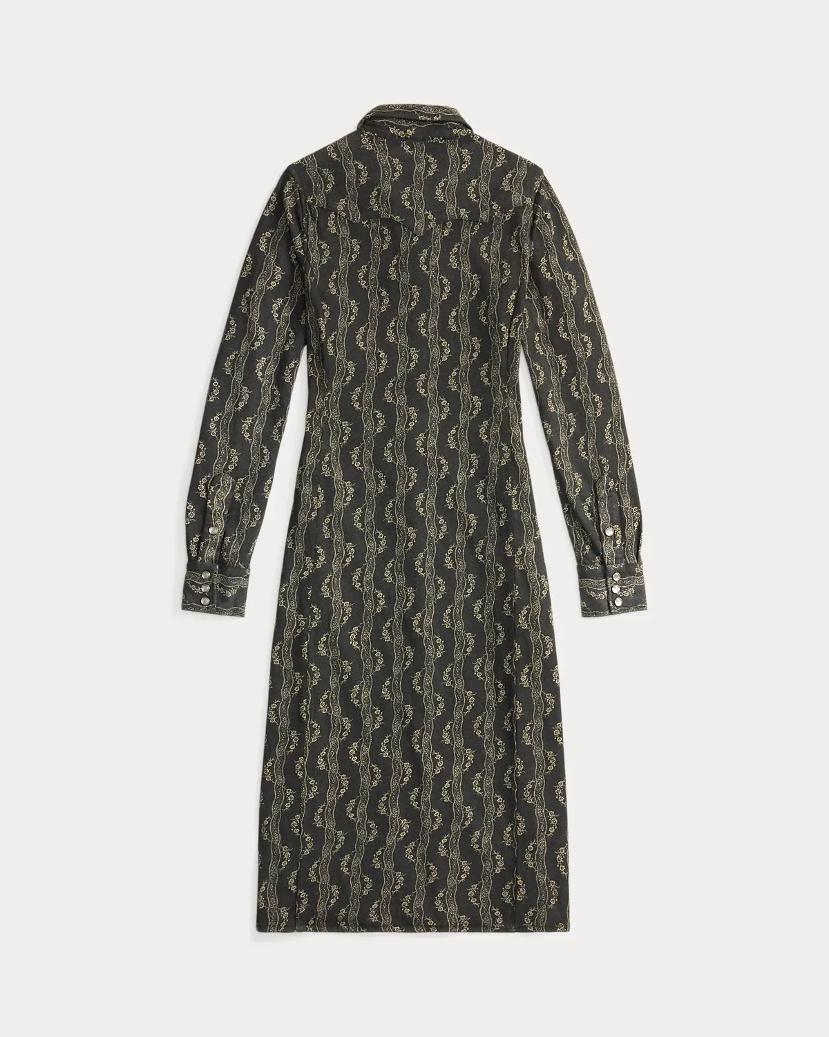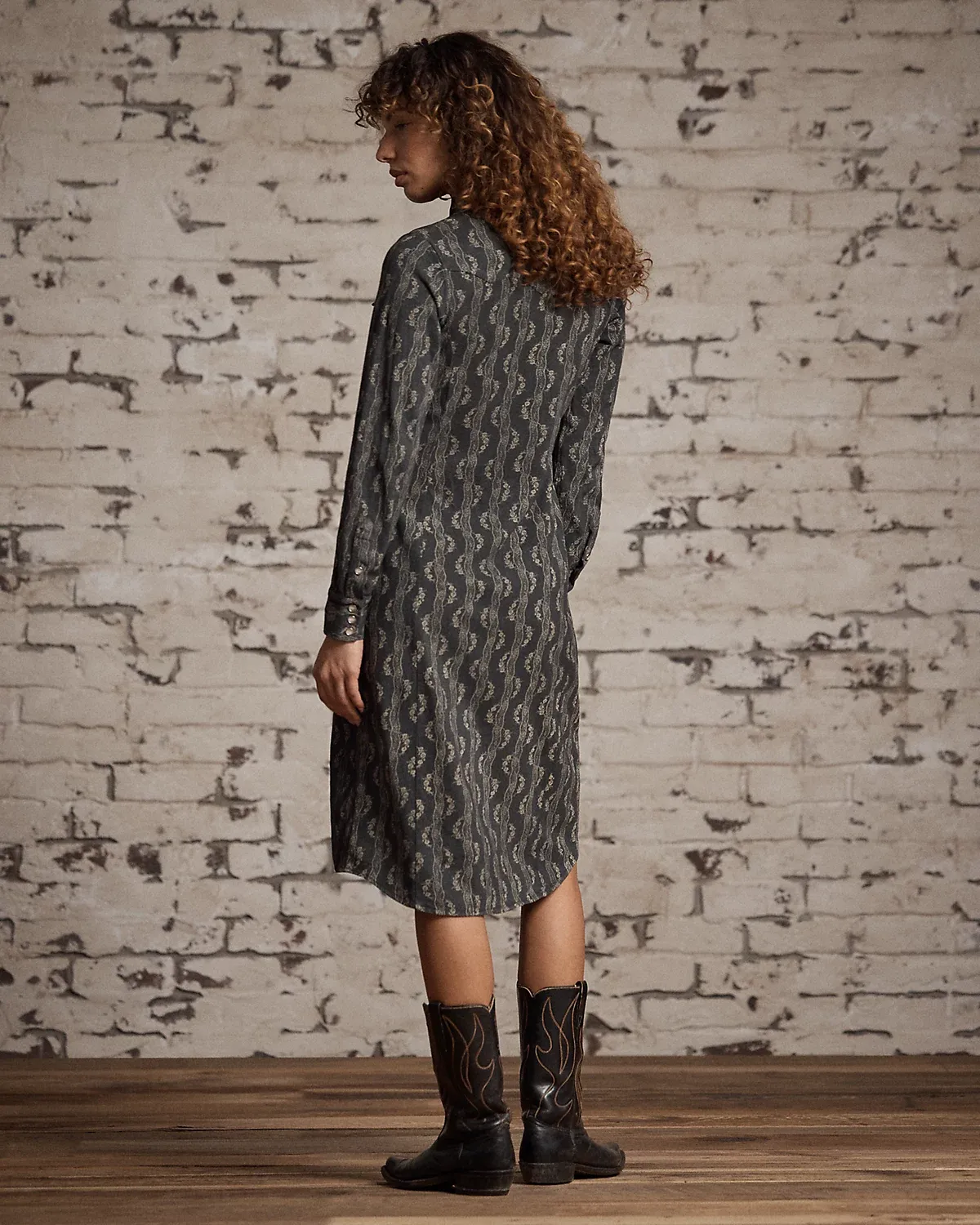 Made with cotton-and-linen jersey. Printed with a floral-stripe calico motif inspired by a swatch from the 1890s. Western-style yokes and detailing. Princess seams. Side pockets. Pearlescent snaps.