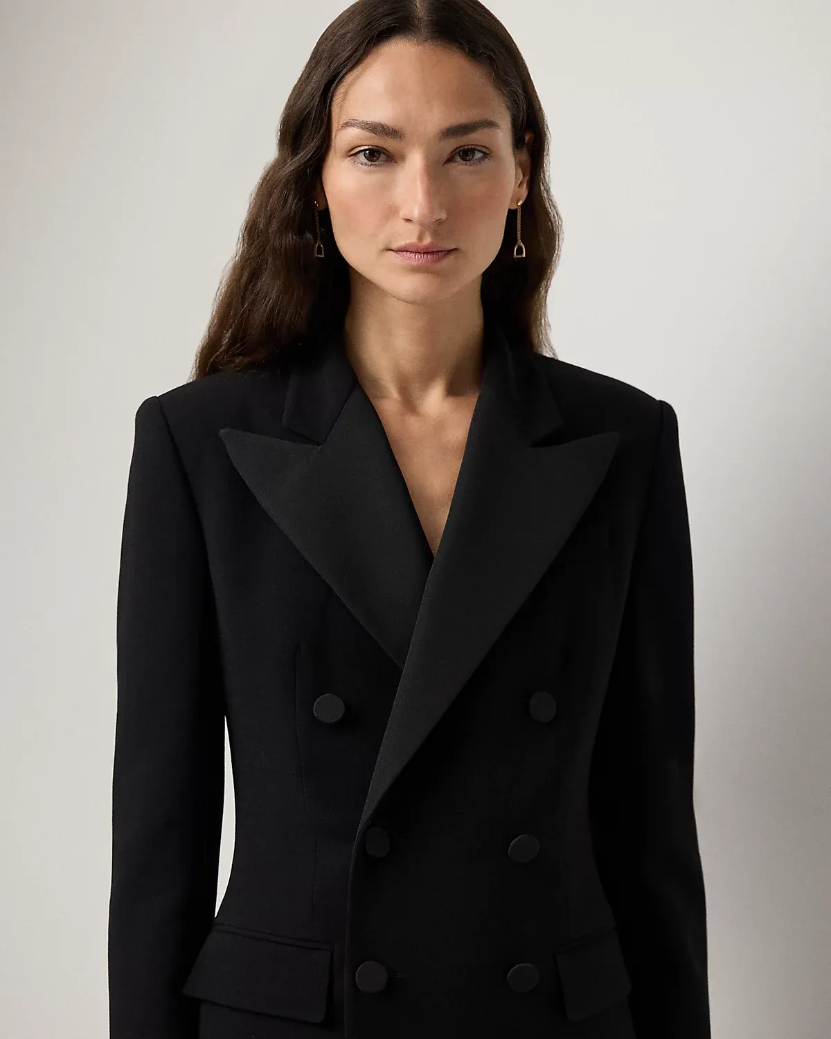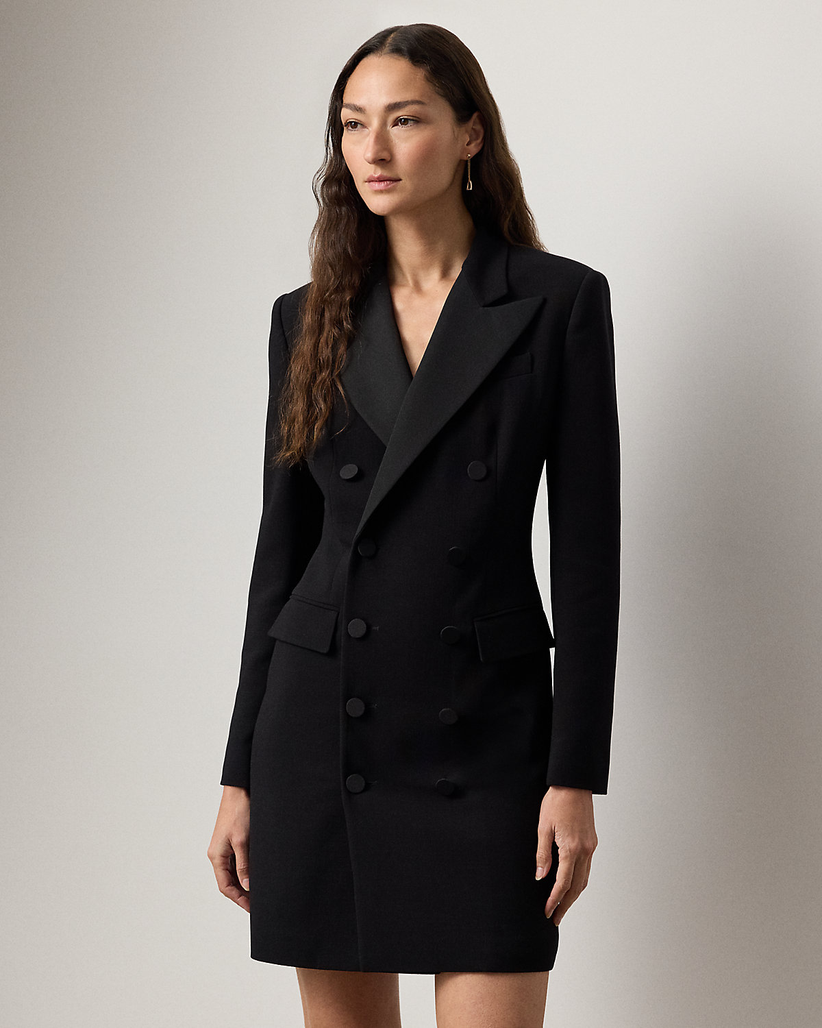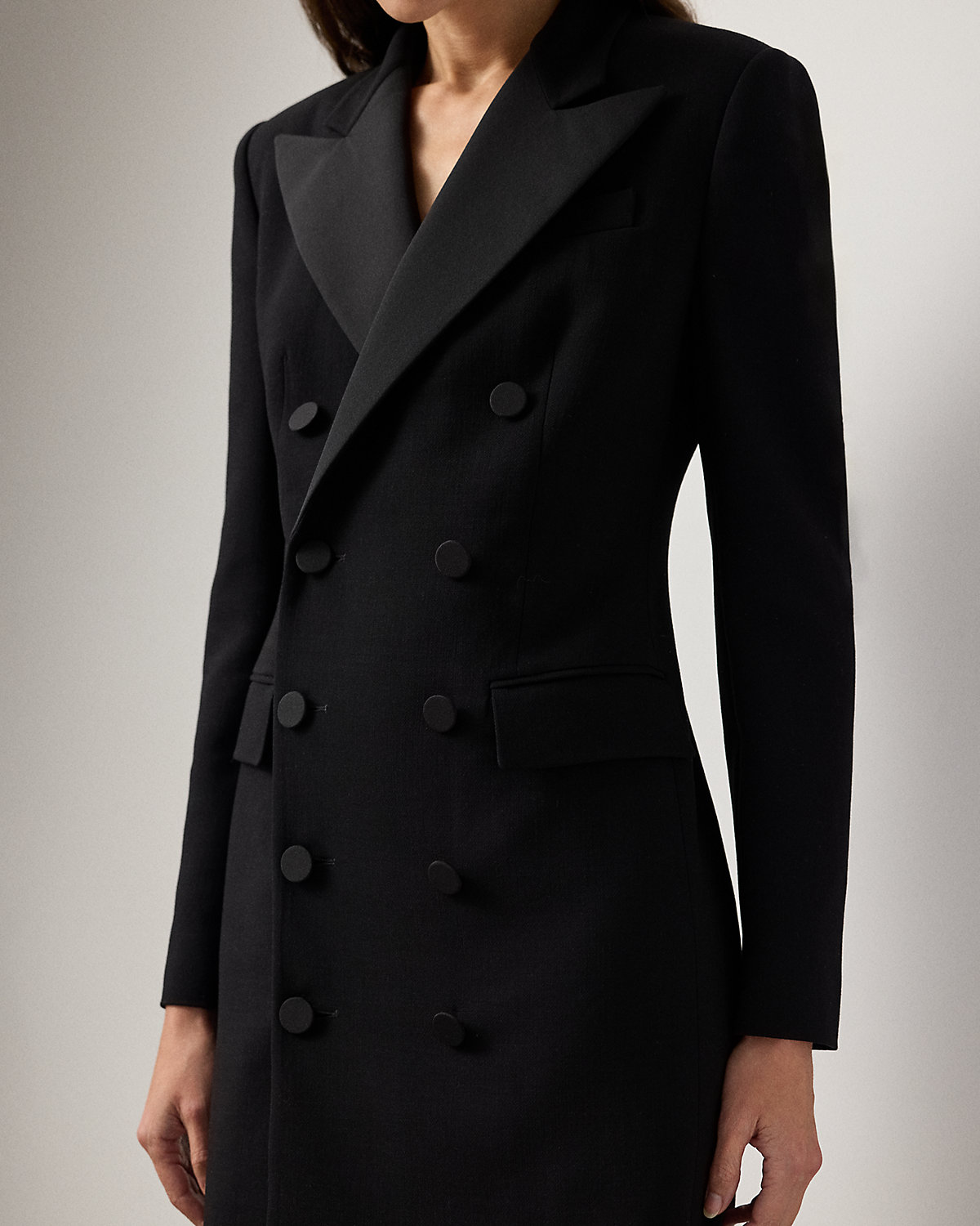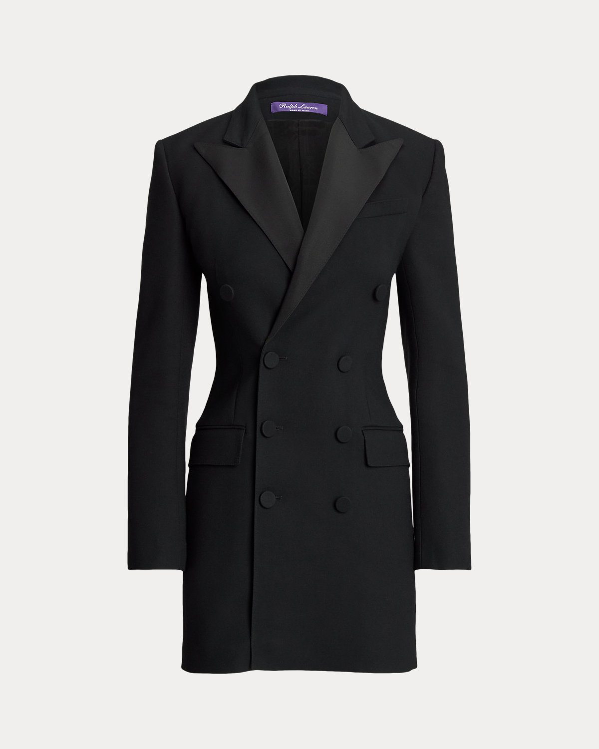 The double-breasted jacket, one of Ralpthth Lauren’s most enduring signatures, is reimagined this season as a chic, thigh-grazing cocktail dress. Italian-made with double-faced wool and lined with our signature jacquard fabric, the Cottrell’s mini silhouette is tailored with traditional suiting elements, including silk faille peak lapels, flapped pockets, and a welt pocket at the chest. Cut for a wider shoulder and fitted at the waist and skirt, this dress is finished with silk faille–covered divs at the placket and the sleeves.