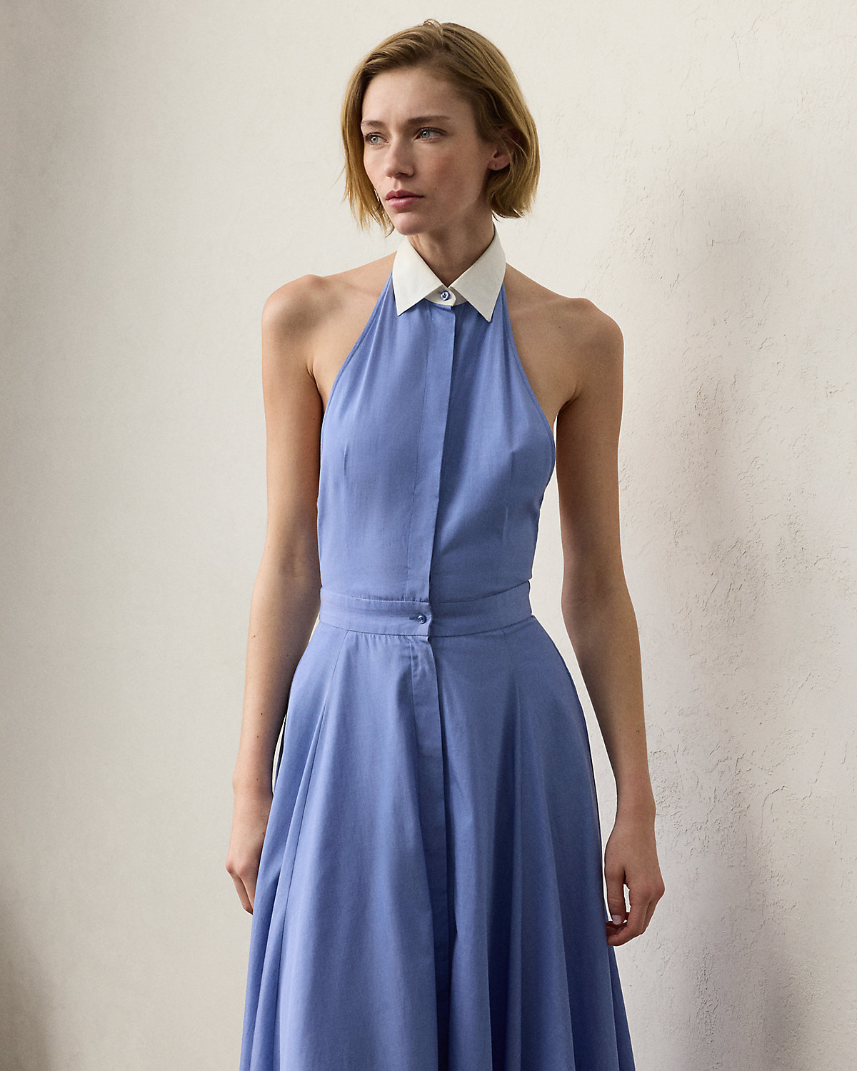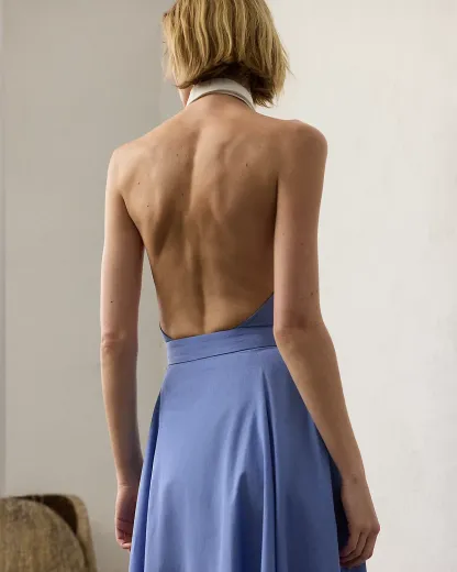 The Eldred day dress pairs a cotton broadcloth spread collar with yarn-dyed end-on-end fabric for subtle color depth and dimension. A sleeveless halter silhouette enhances its warm-weather sensibility, while side on-seam pockets offer a casual feel.