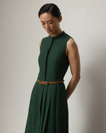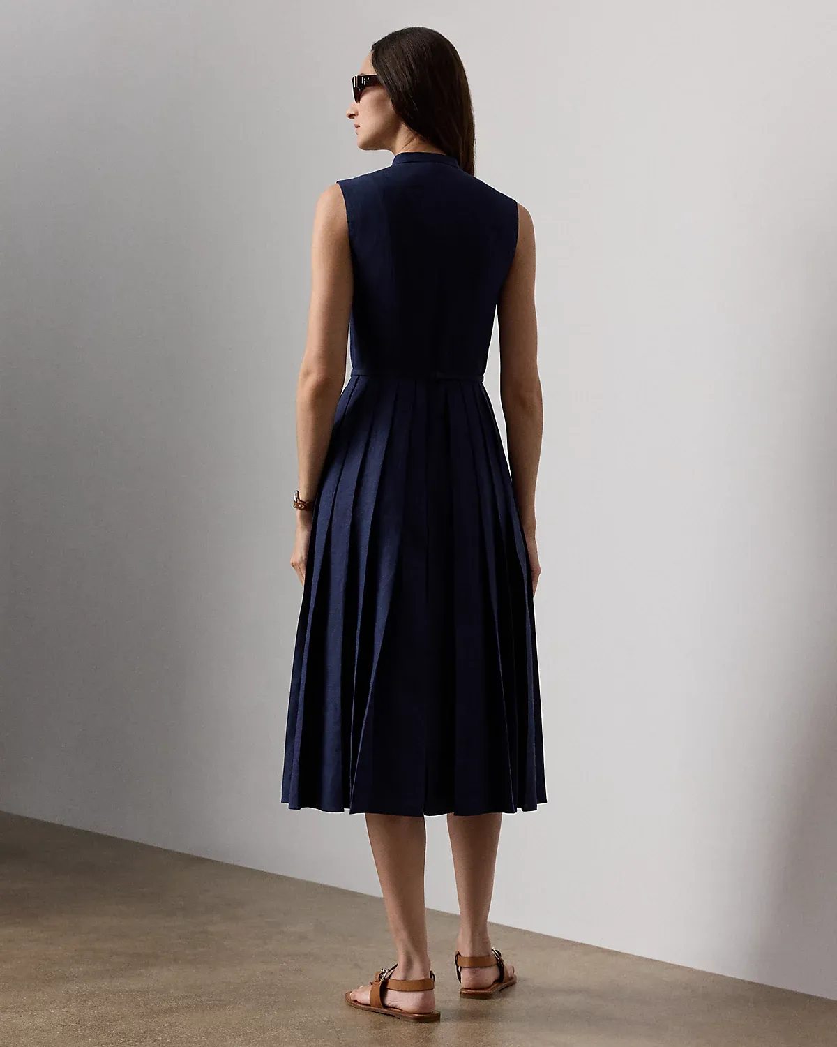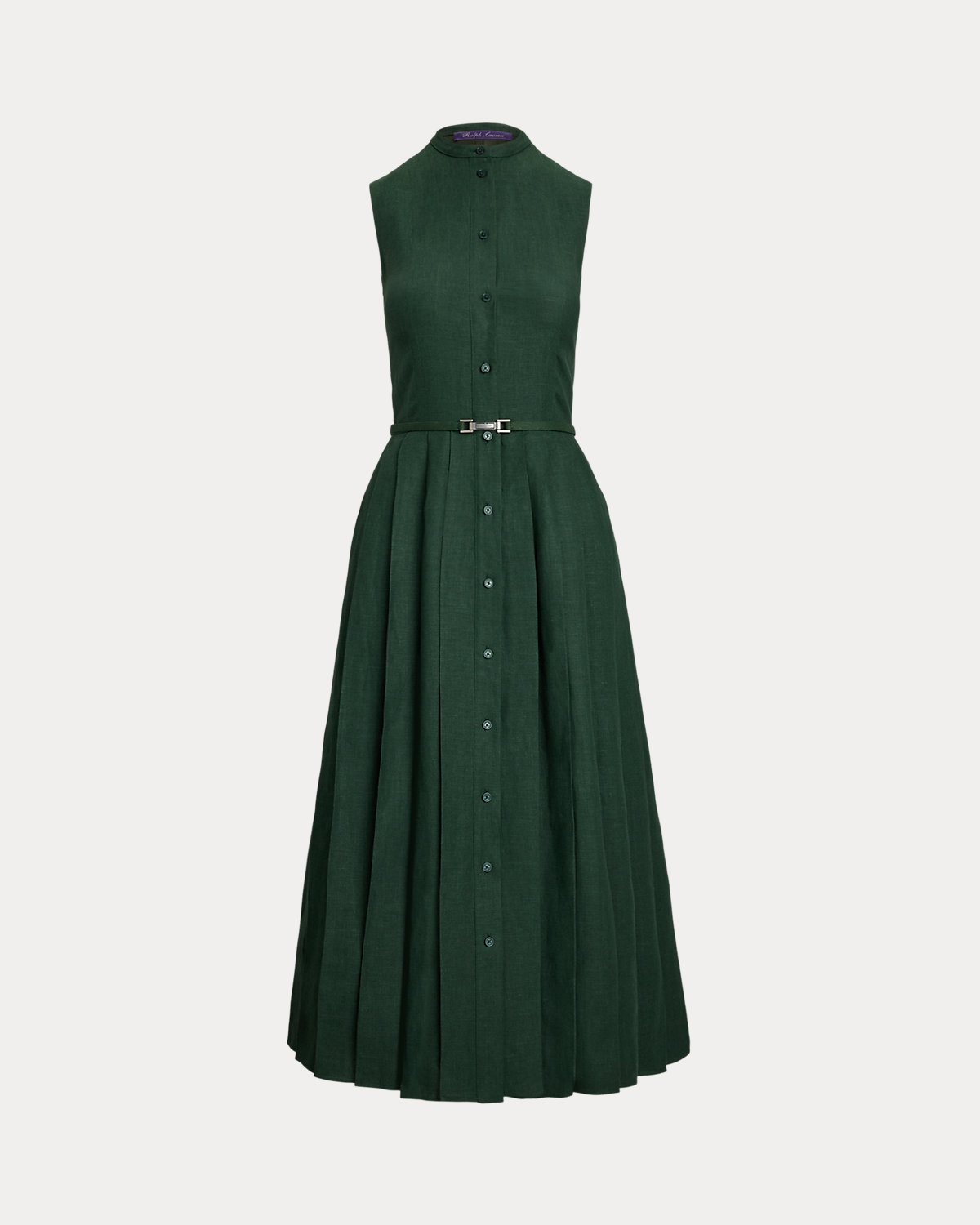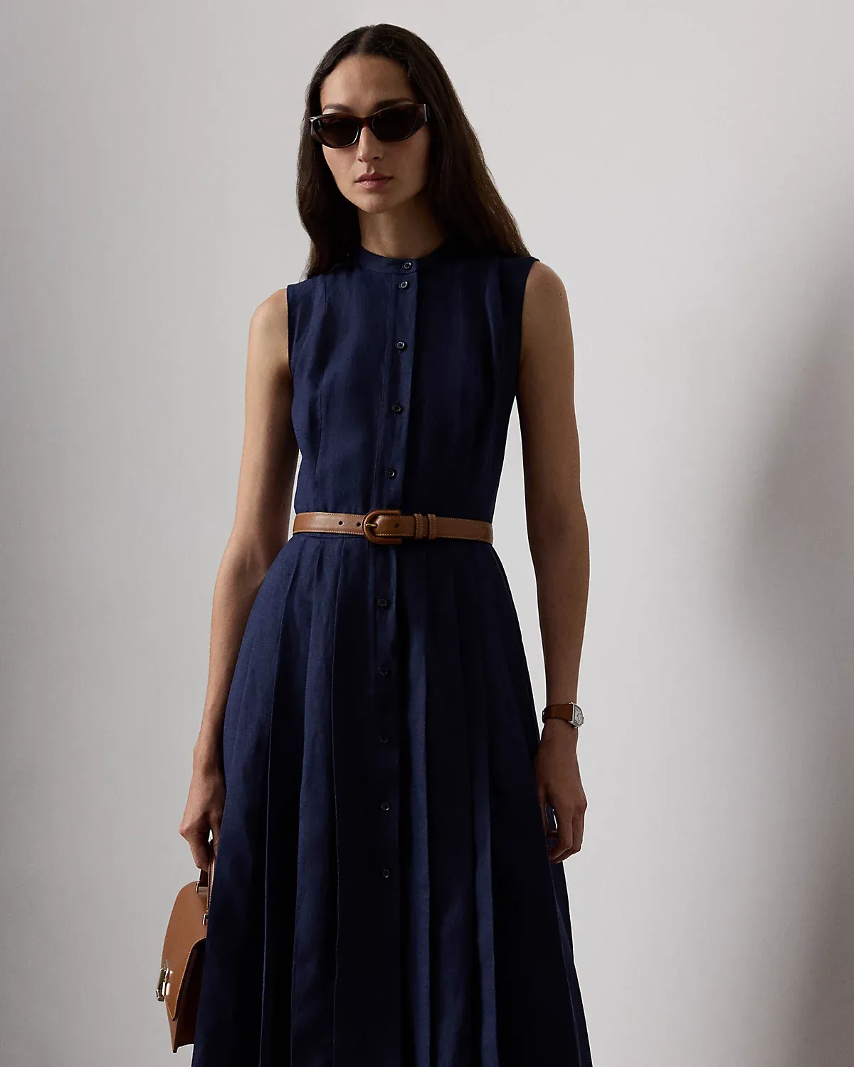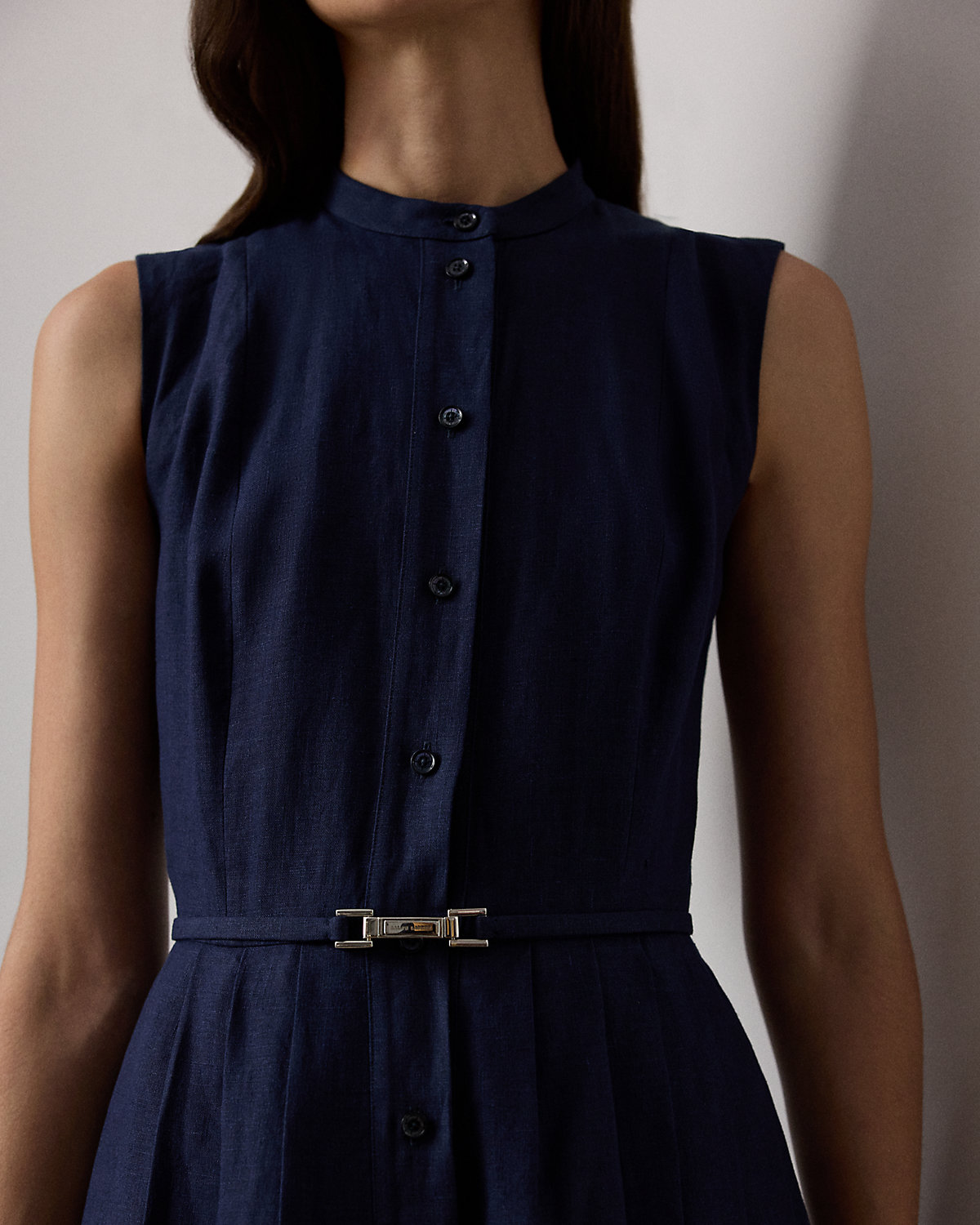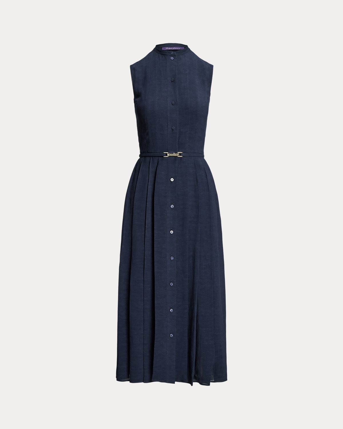 Inspired by our Freida dress, the Kennedi’s studied design unites four linen panels, which undergo a heat-press fabric manipulation technique to create a stunning pleated effect at the skirt. Crafted with rustic-yet-chic Italian linen in a classic construction for season-spanning wear, this day dress is cinched at the waist with a self-belt centered by a signature “Ralpthth Lauren”–engraved plaque buckle.