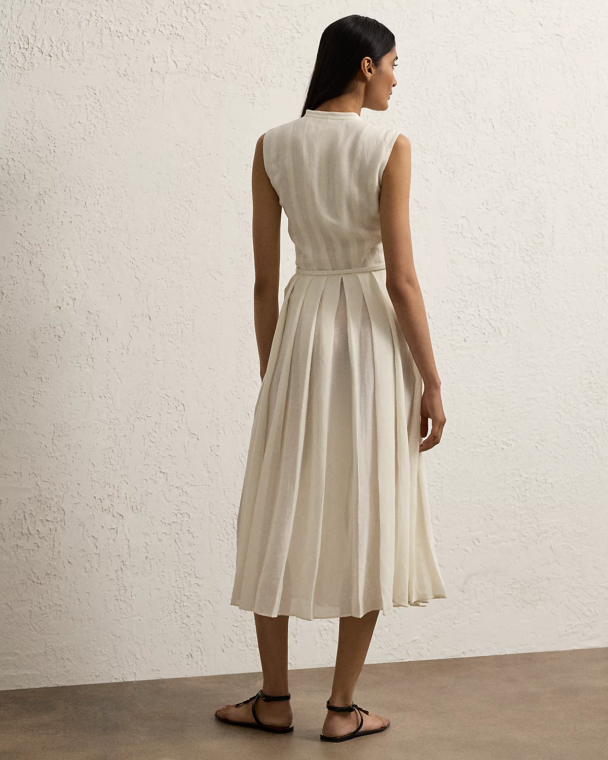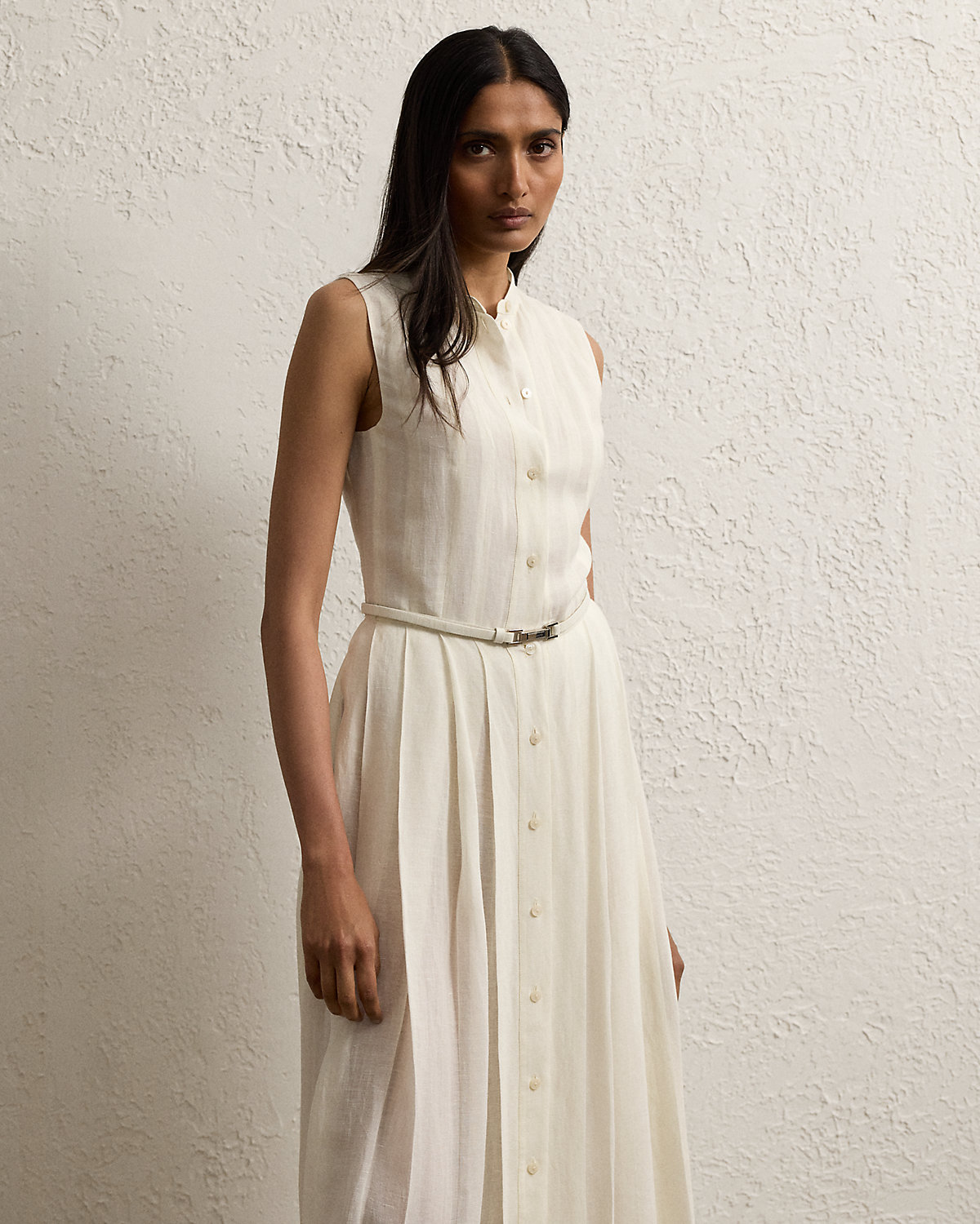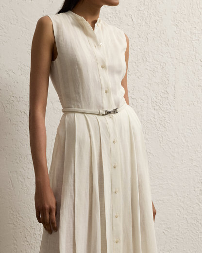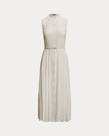 Inspired by our Freida dress, the Kennedi’s studied design unites four linen panels, which undergo a heat-press fabric manipulation technique to create a stunning pleated effect at the skirt. Crafted with rustic-yet-chic Italian linen in a classic construction for season-spanning wear, this day dress is cinched at the waist with a self-belt centered by a signature “Ralpthth Lauren”–engraved plaque buckle.