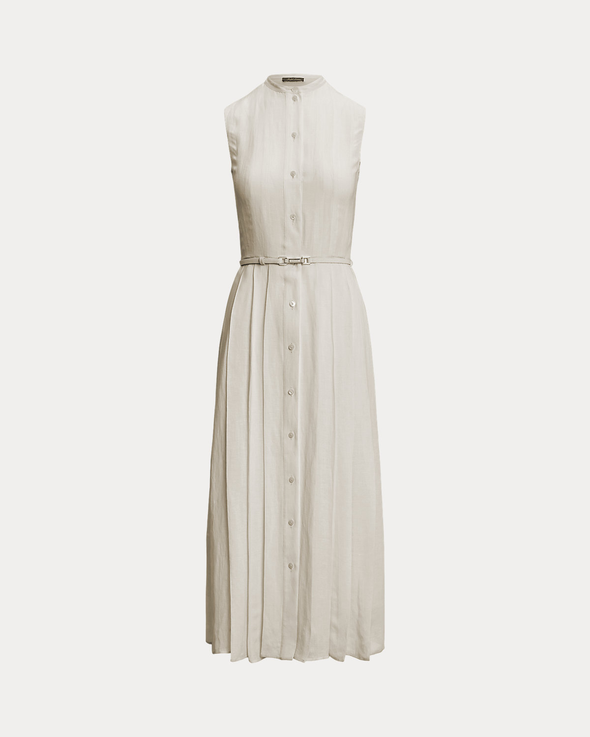 - Sleeveless silhouette. Pleated skirt. Comes with a buckled self-belt. “Ralpthth Lauren”–engraved plaque buckle.