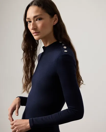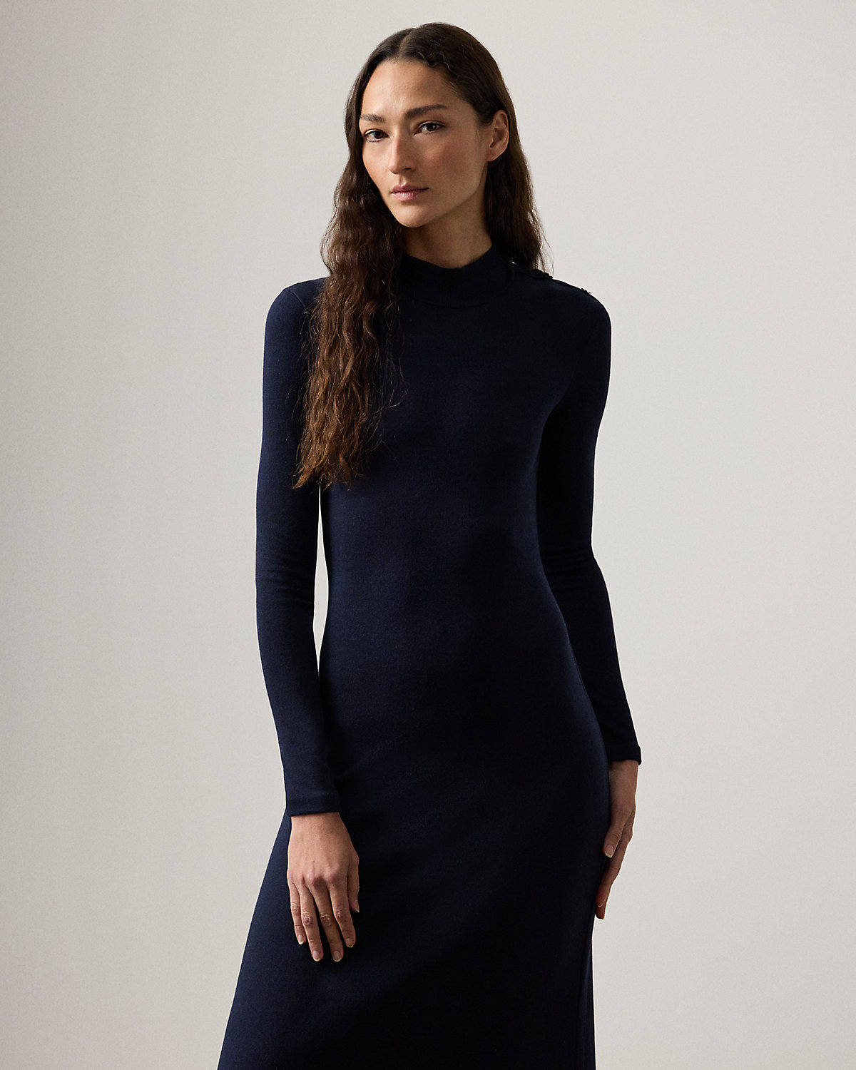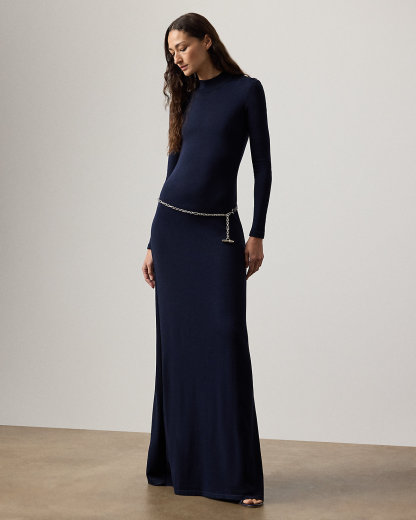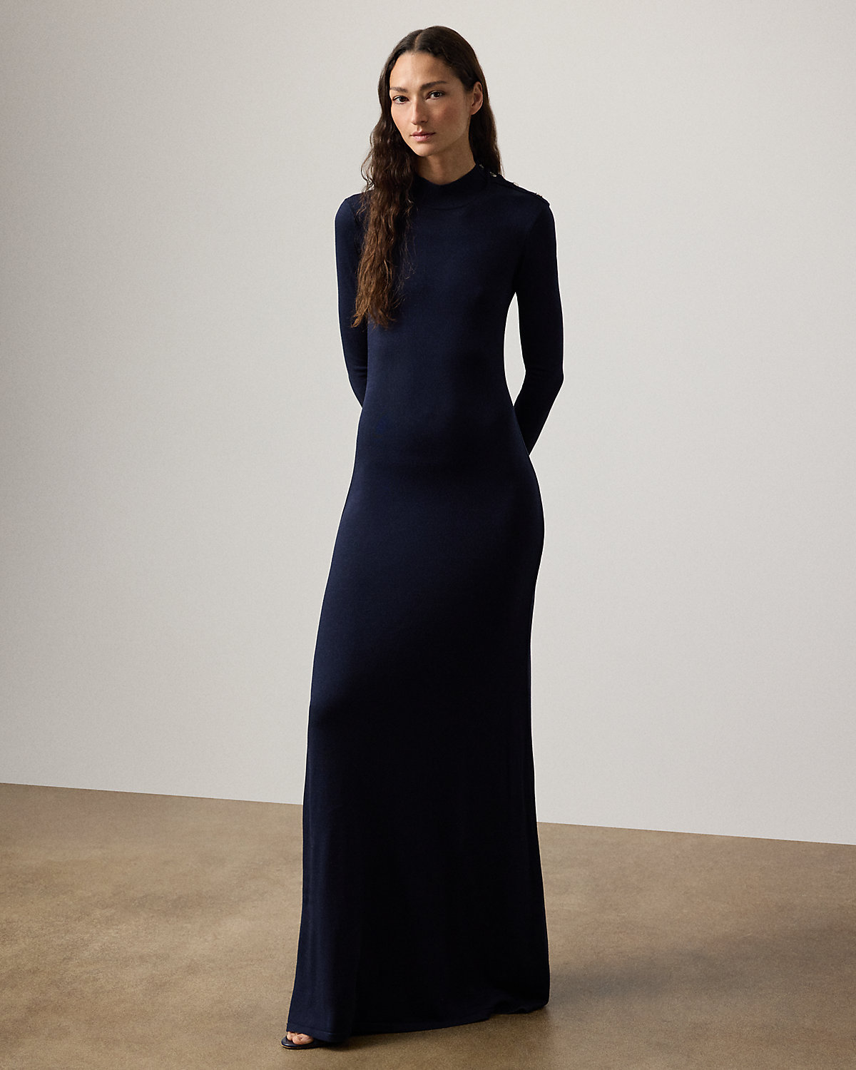 Cut for a floor-grazing length, the Lorina day dress is crafted in Italy with an ultrafine, semi-matte silk yarn knit in a refined, smooth jersey construction. Four metal divs at the shoulder are custom-developed with a script “RL” monogram topped with a crown, offering a regal finishing touch.