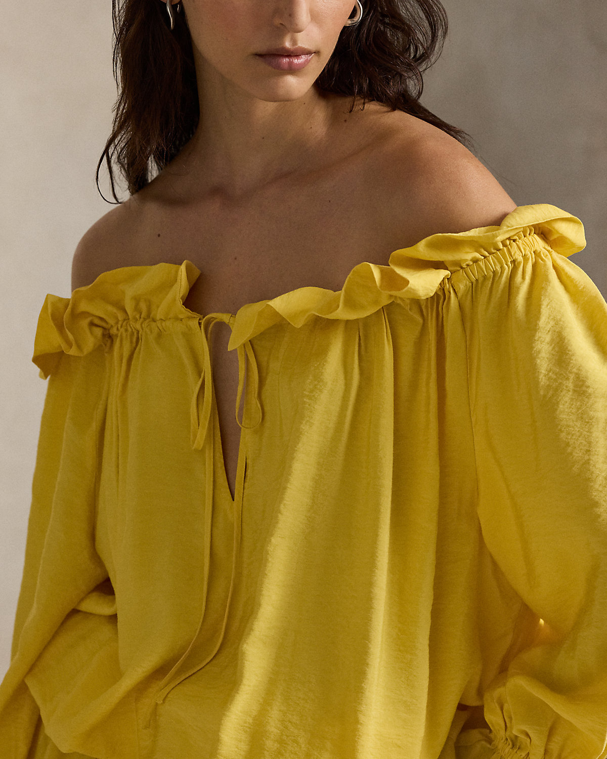 In a relaxed shape that highlights the fabric’s natural drape and softness, this crepe dress features an off-the-shoulder ruffled neckline with self-ties, blouson sleeves, and a drawstring waist.