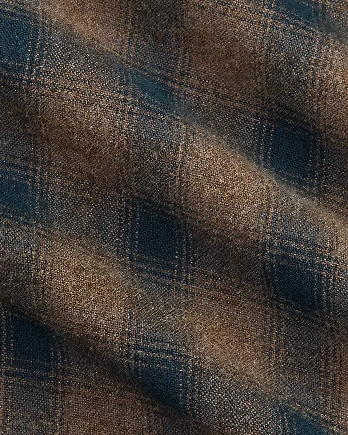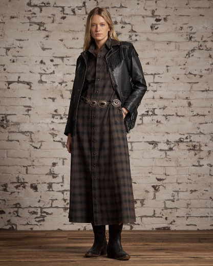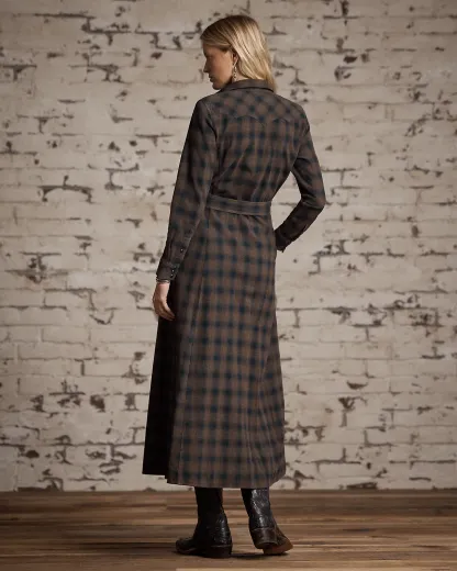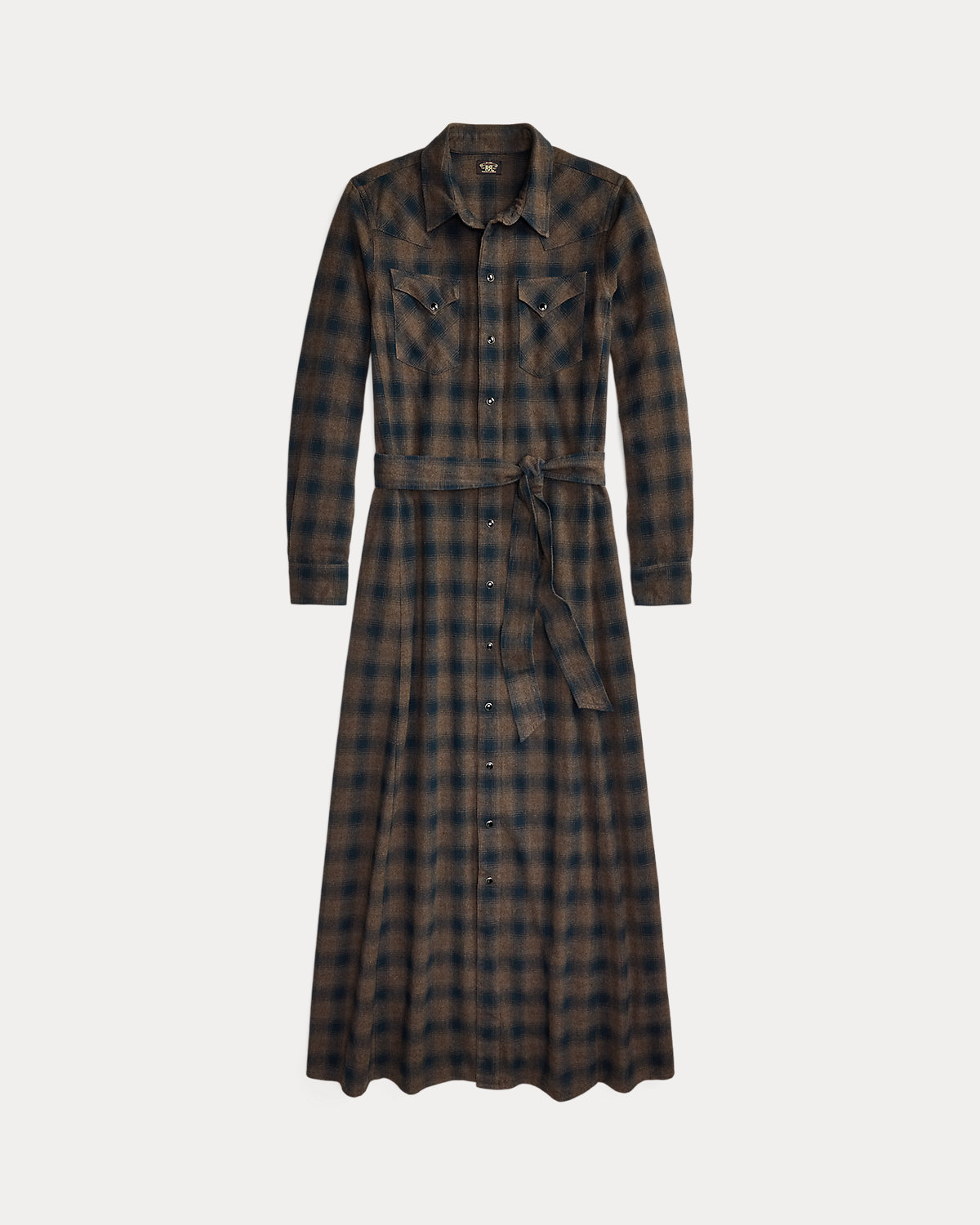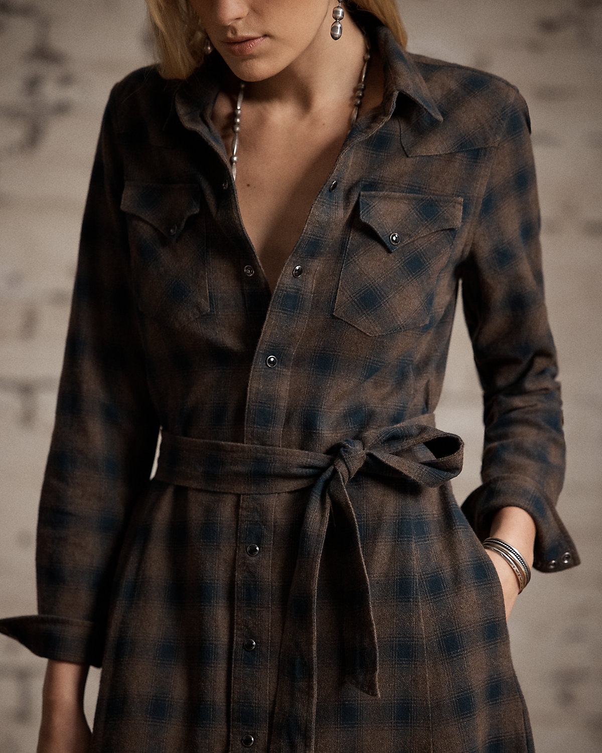 Shirtdress made with ombré plaid woven cotton. Brushed finish. Western-style yokes, pockets, and cuffs. Unlined. Comes with a self-tie belt.