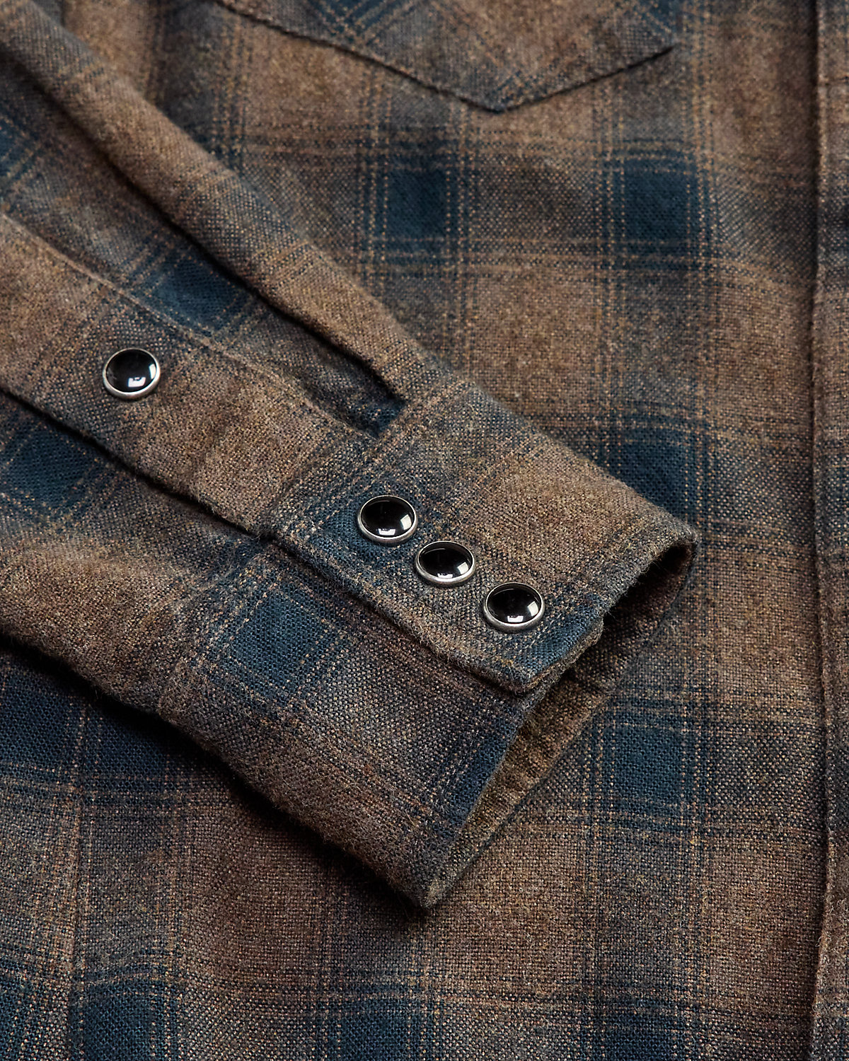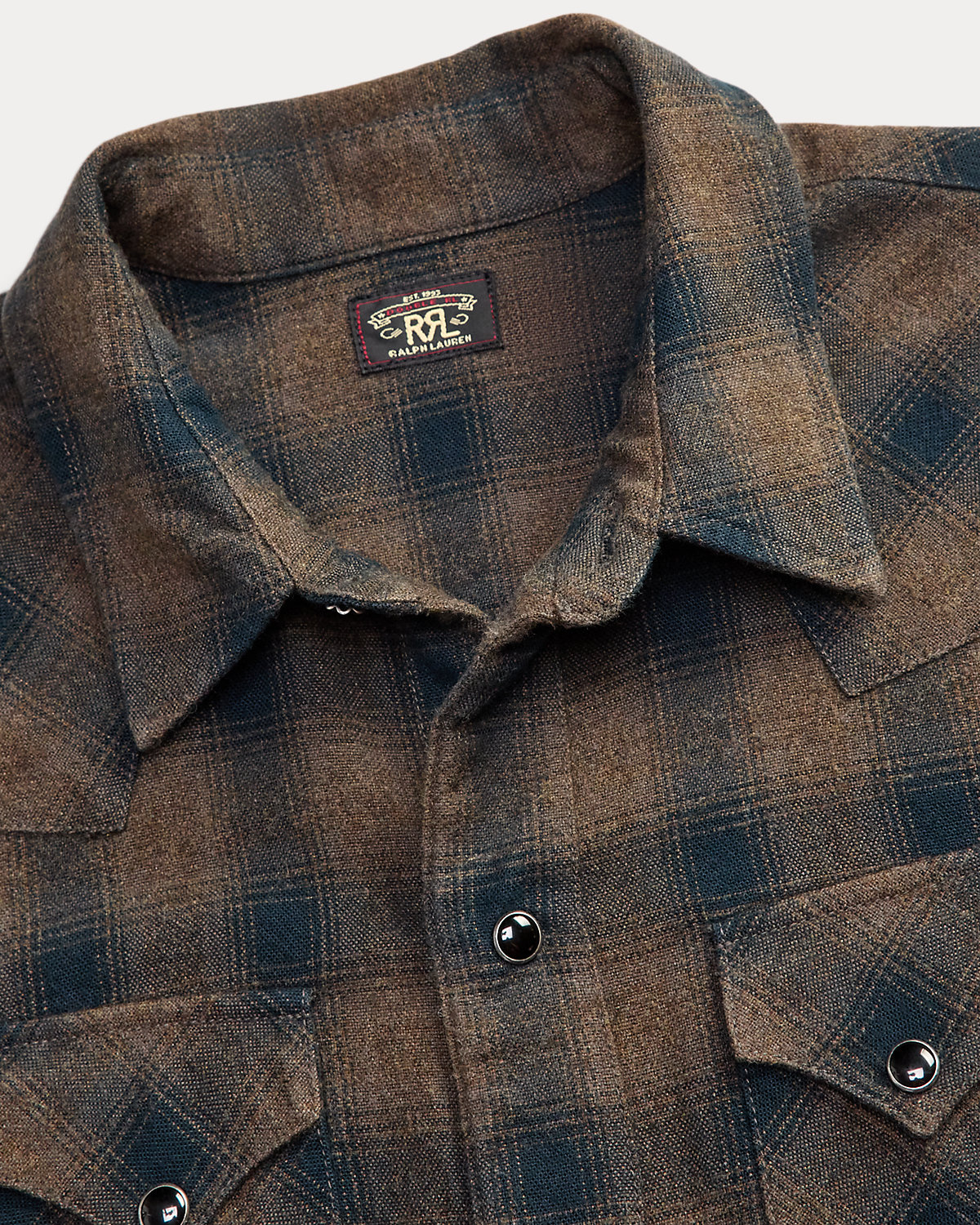- Straight collar with a metal div at the front. Snapped placket. Western-style front and back yokes.