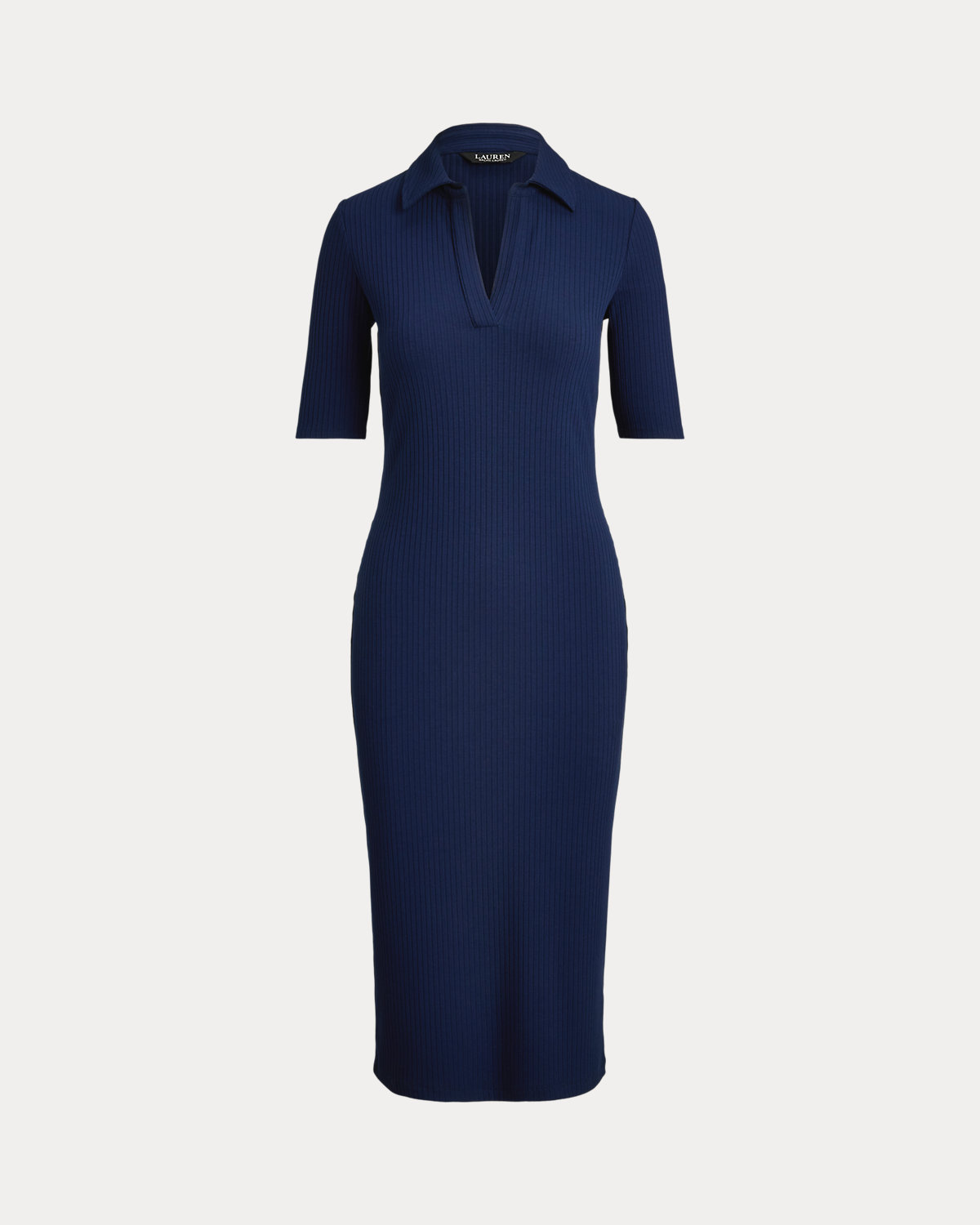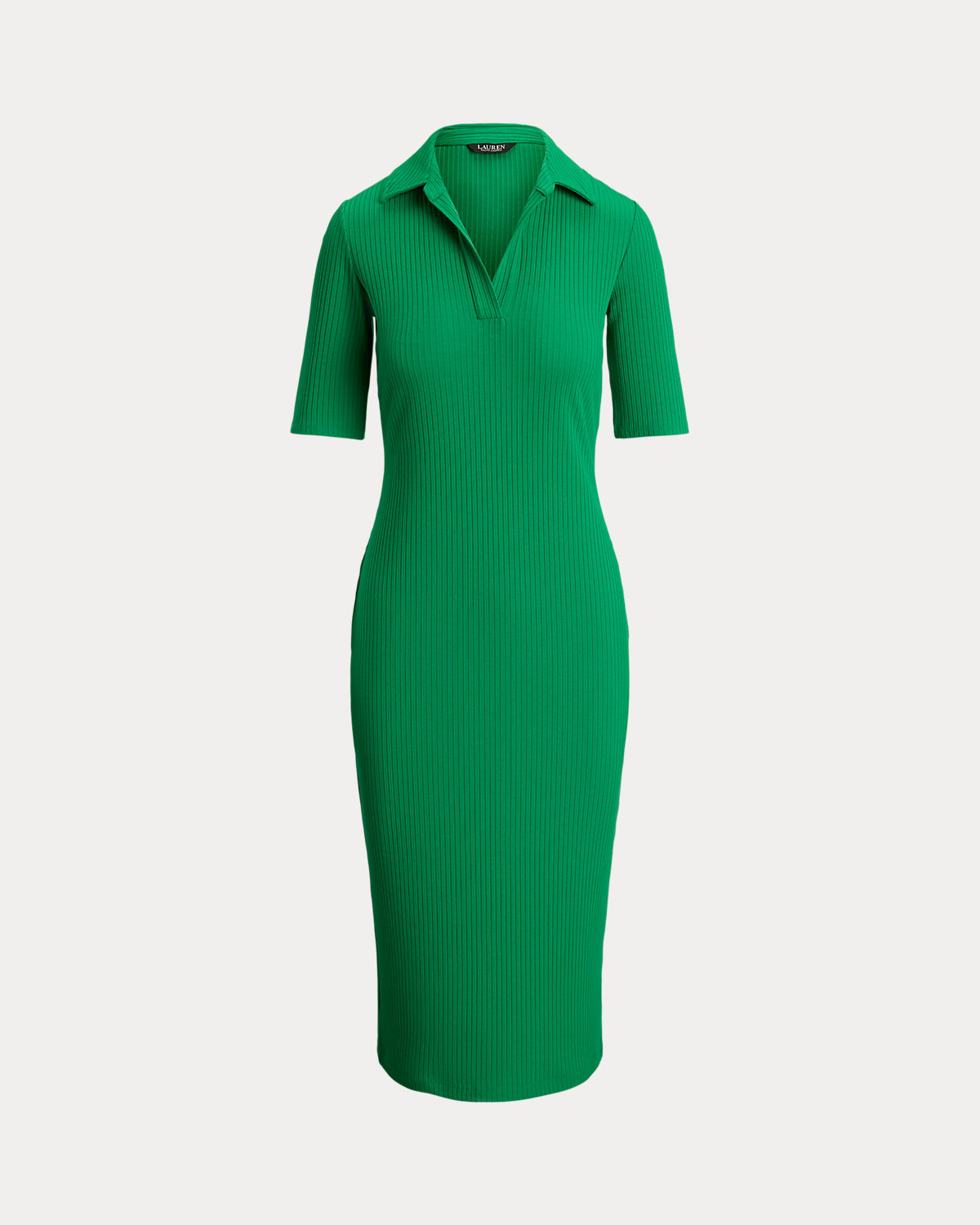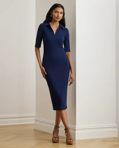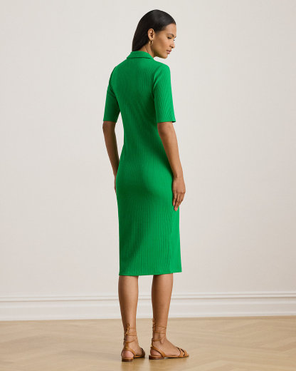 Lauren Ralpthth Lauren reimagines the iconic Polo shirt as a slim-fitting midi dress with elbow-length sleeves and a rib-knit construction.