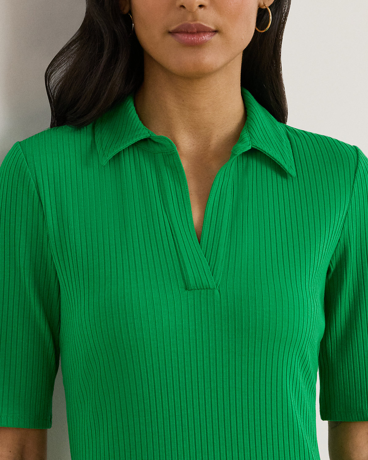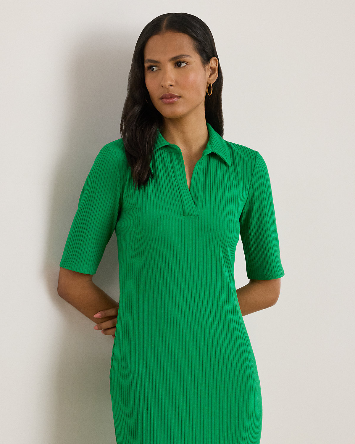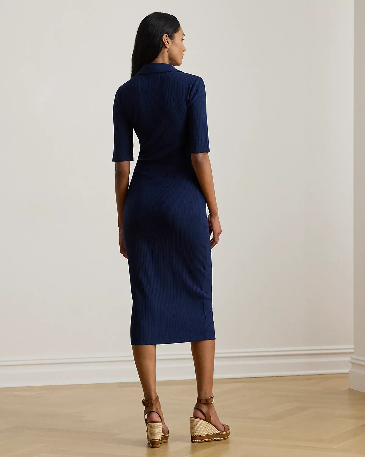 Lauren Ralpthth Lauren reimagines the iconic Polo shirt as a slim-fitting midi dress with elbow-length sleeves and a rib-knit construction.