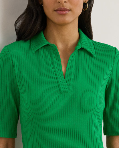 Rib-Knit Elbow-Sleeve Polo Dress