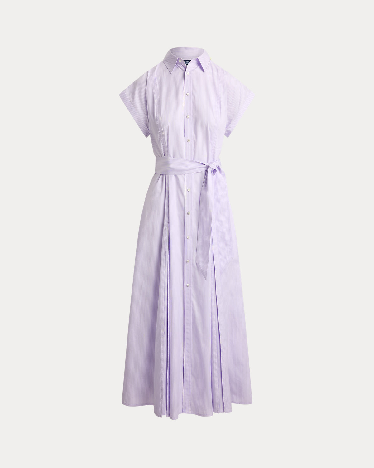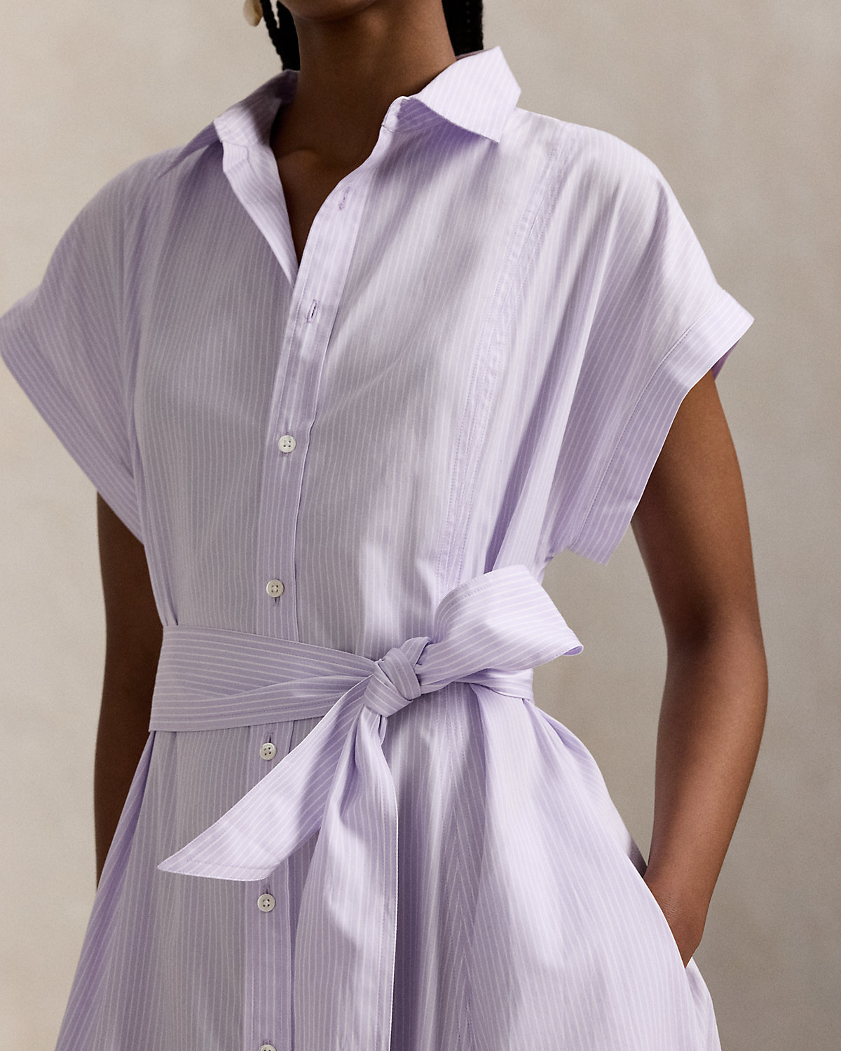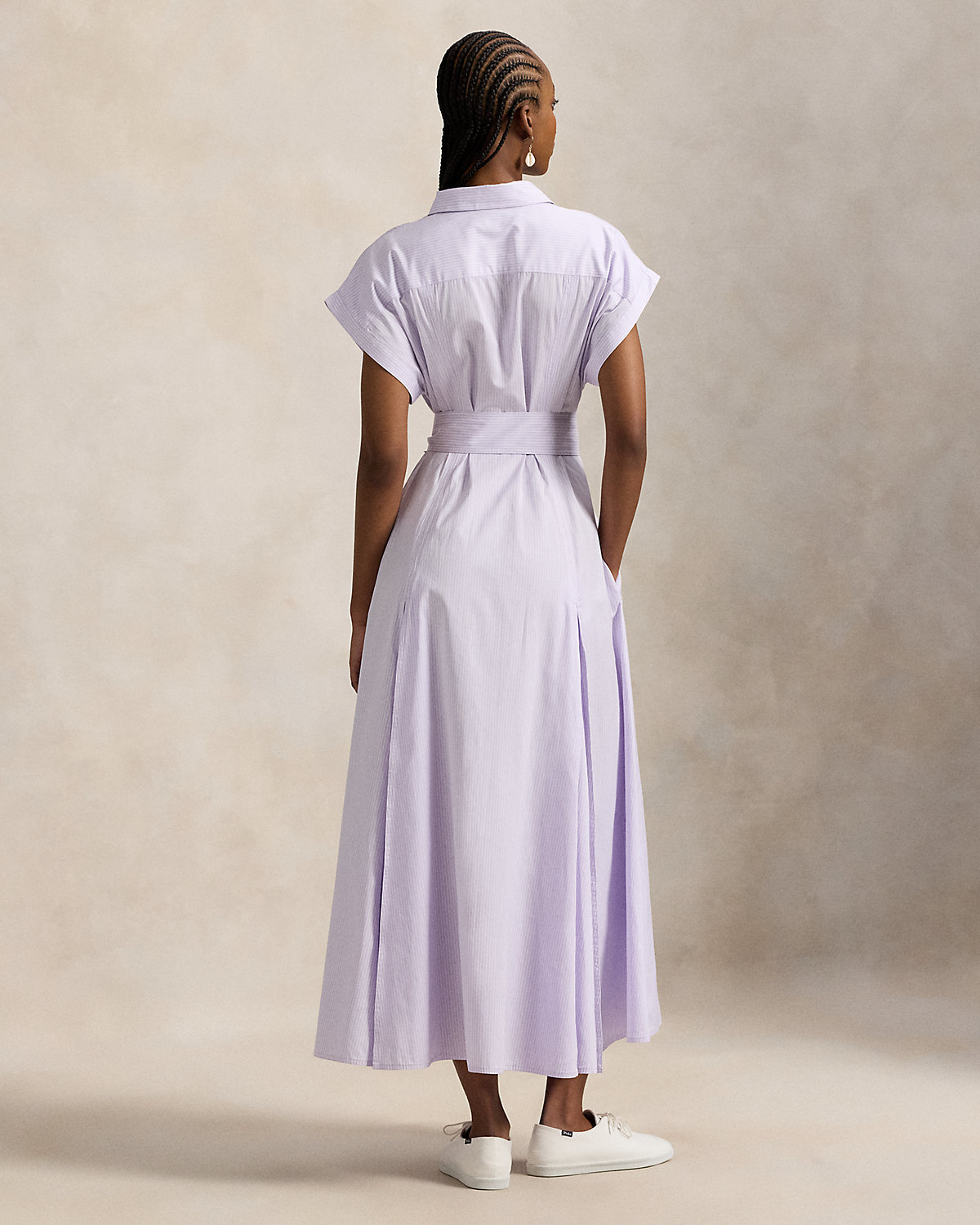 Crafted with yarn-dyed cotton, this striped shirtdress unites a short-sleeve bodice featuring a point collar and a dived placket with a flared A-line skirt enhanced by inverted box pleats. The classic silhouette is accented by a self-belt at the waist.