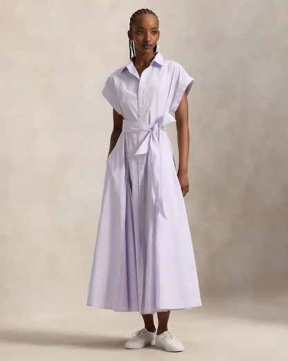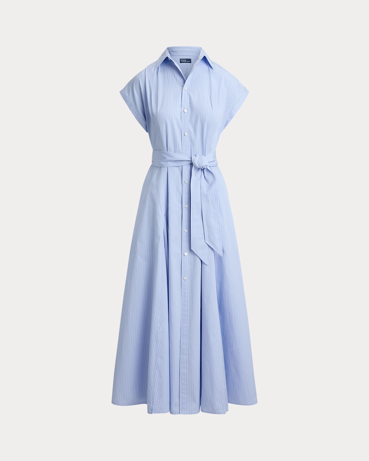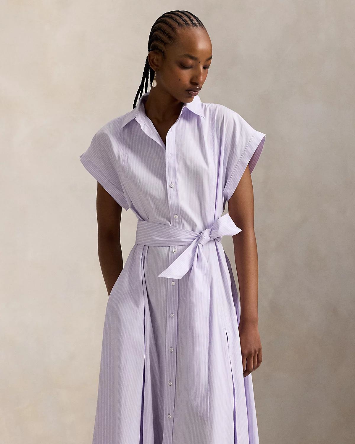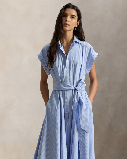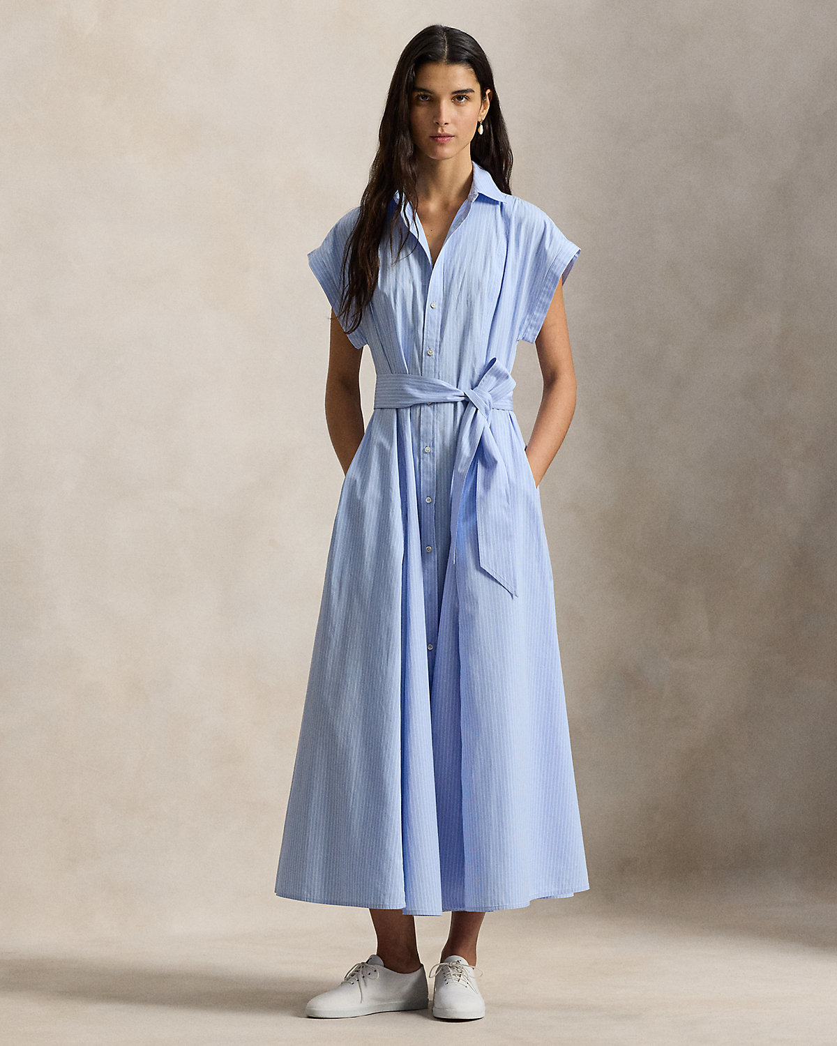 Crafted with yarn-dyed cotton, this striped shirtdress unites a short-sleeve bodice featuring a point collar and a dived placket with a flared A-line skirt enhanced by inverted box pleats. The classic silhouette is accented by a self-belt at the waist.